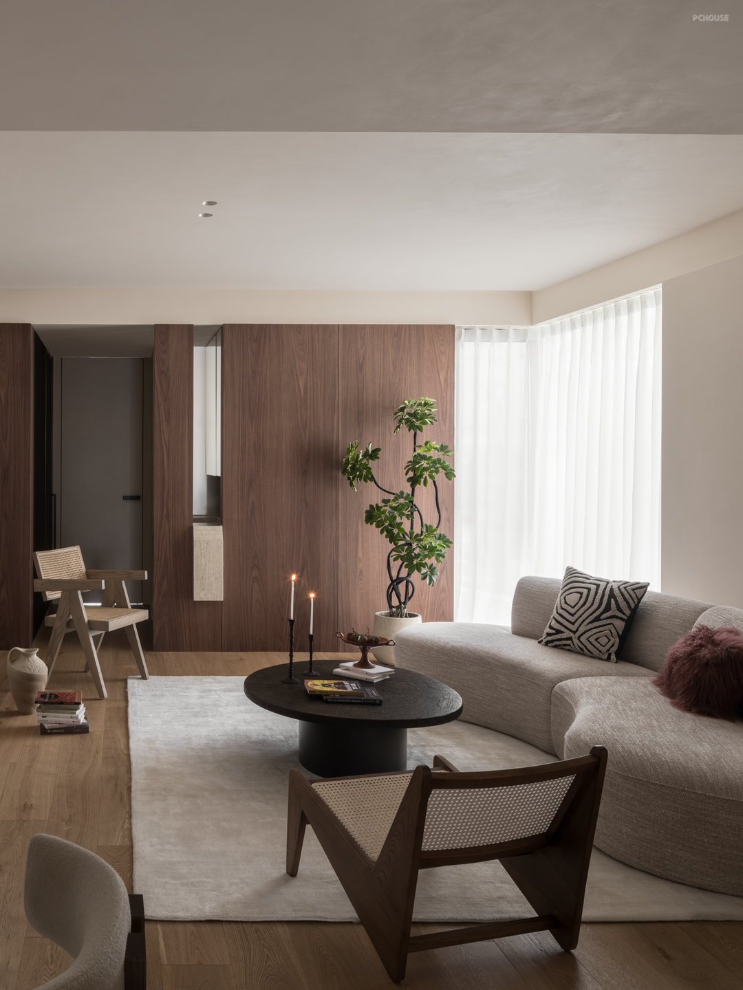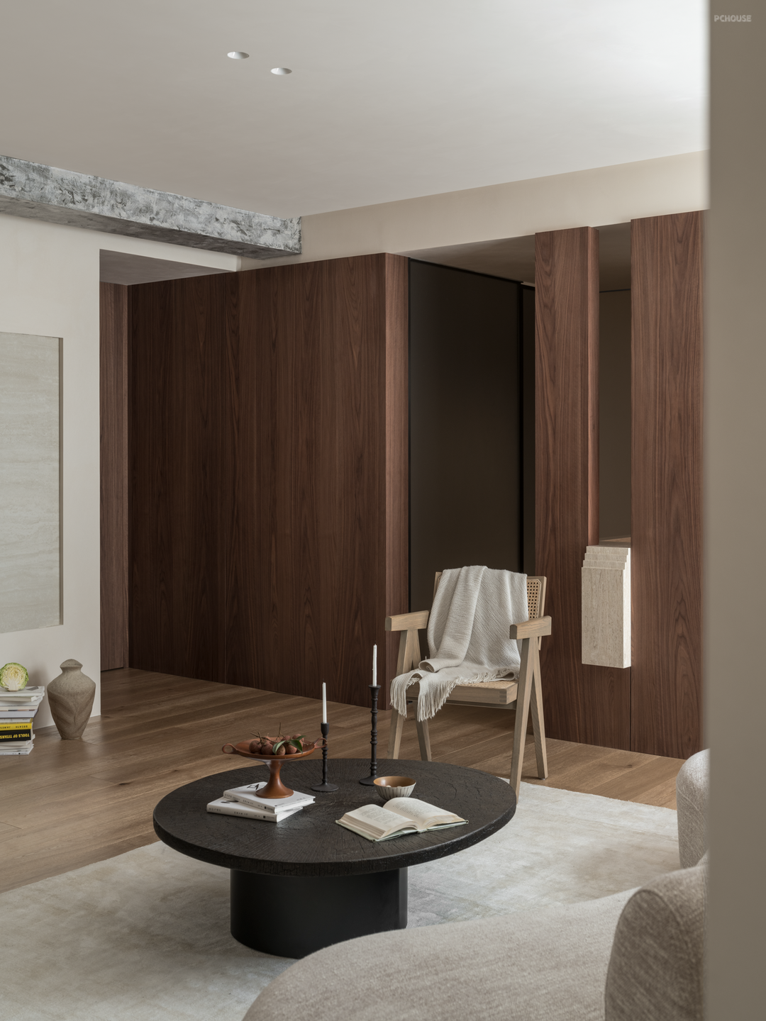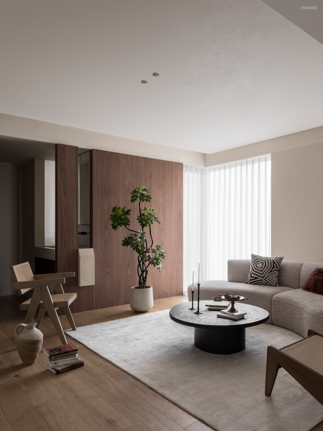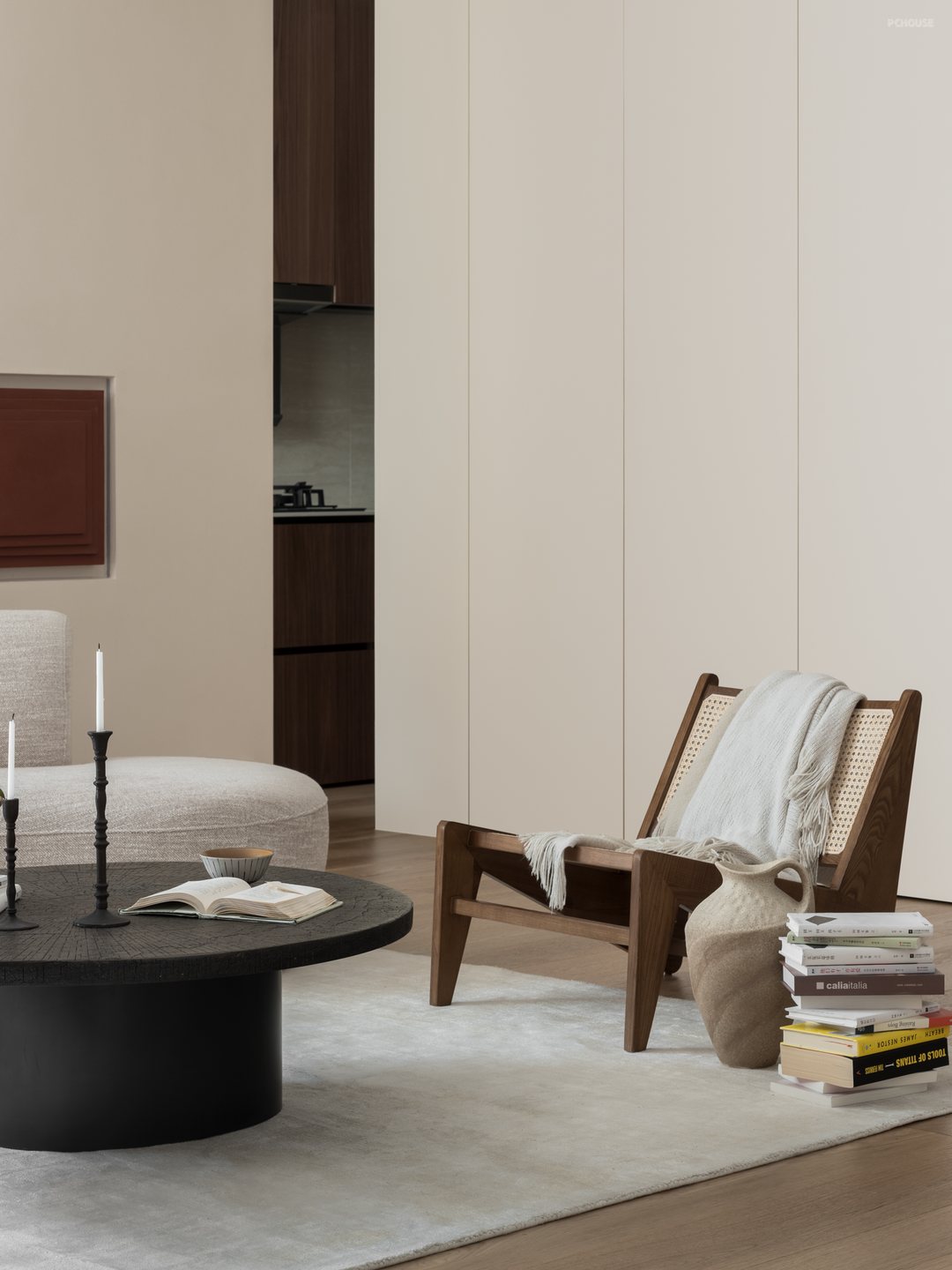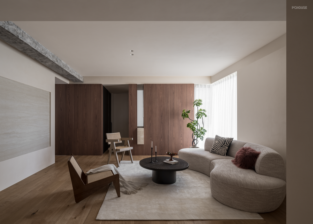 客厅面积也不算大,还要给背后小孩房间留空间,所以电视墙这一面就没有做柜子,墙面跟旁边餐厅做了柜子之后的平面齐平,一起用洞石材质做了装饰,看起来虽然还是以温柔奶白色为底,但是会更有质感一点。
