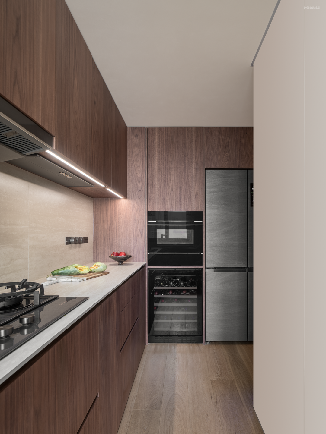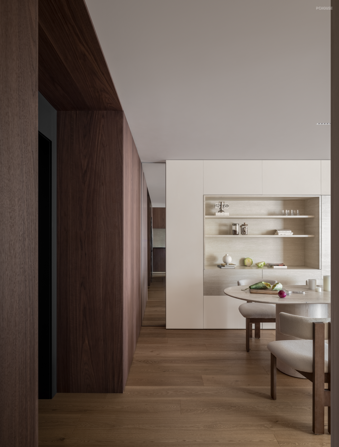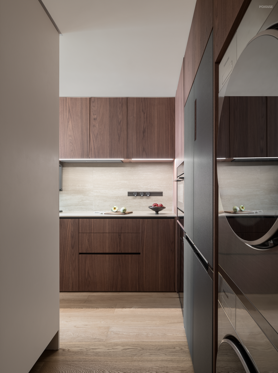 餐厅的两面墙都用来定做柜子了,收纳当然是多多益善,大门那面墙整个都是用的胡桃木,所以柜子也是用的木饰面,关上的时候基本跟墙没区别,看起来没啥存在感。