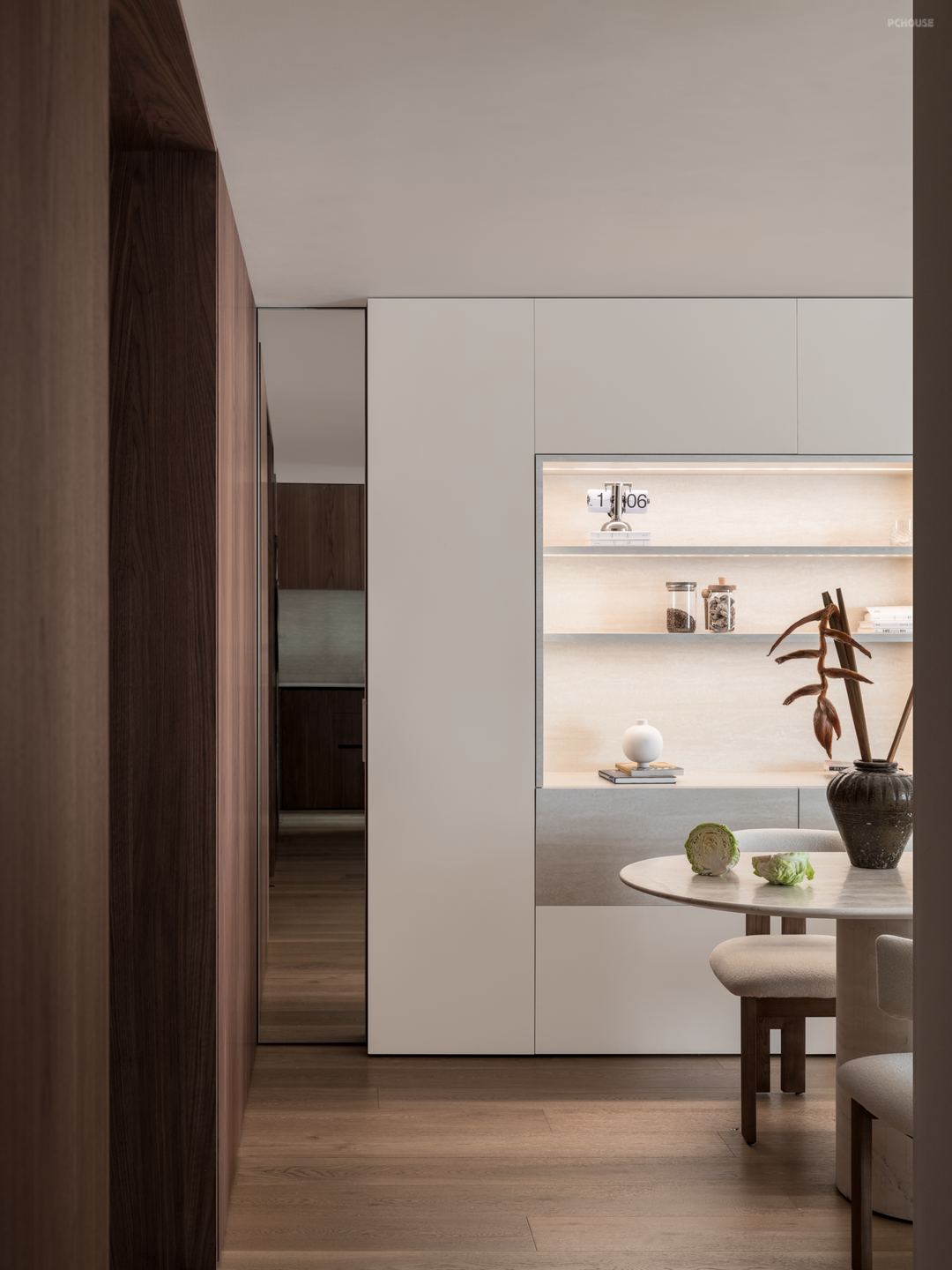 虽然原来的客卫拆掉了,但有一面承重墙还在,所以设计师就围绕着这面墙来定制收纳柜靠餐厅,这里面有背面,也是正好能补足客厅空间收纳不够的问题。