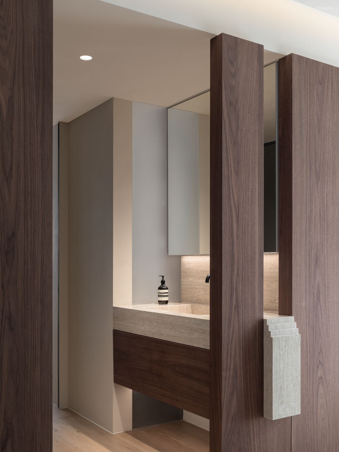 靠近客厅的就是我们家的两个洗手间,相当于是把原本的一个主卫拆成了两个,这样客卫离卧室也很近,俩小的上洗手间就方便了。