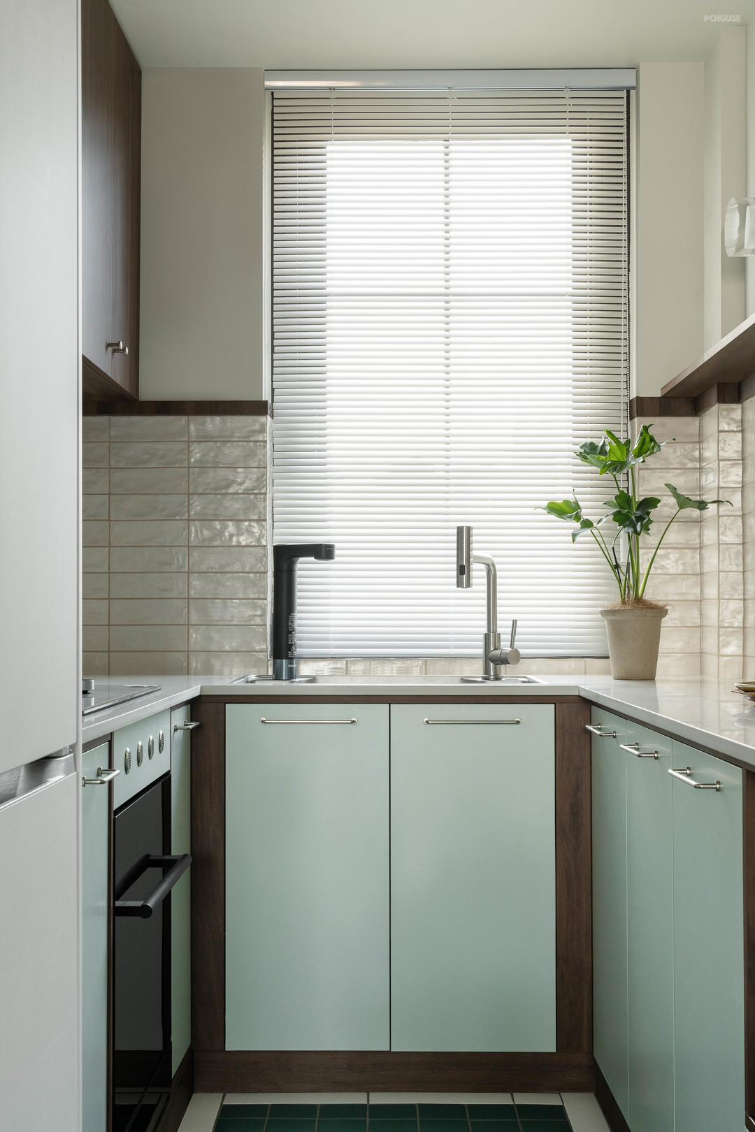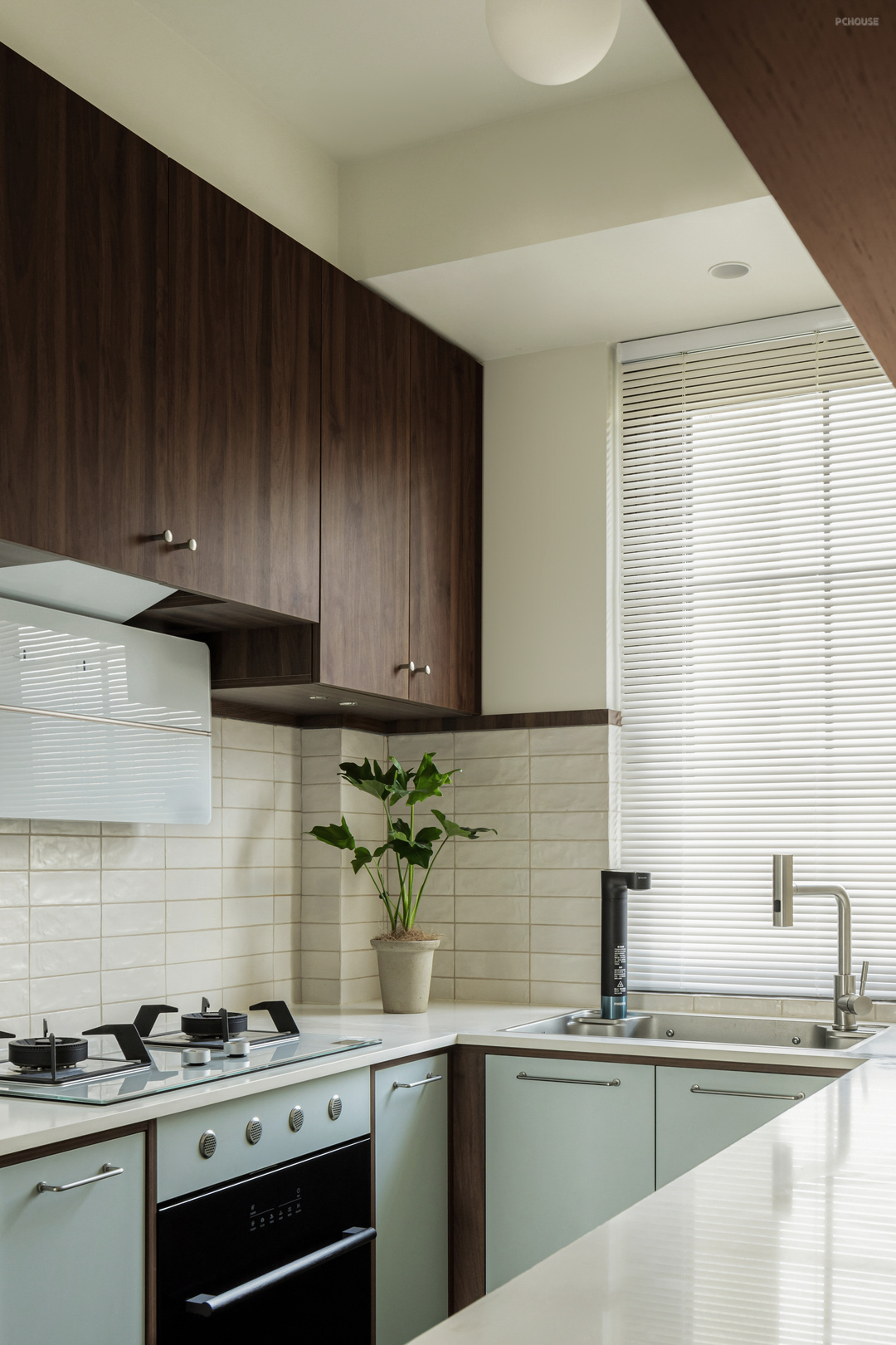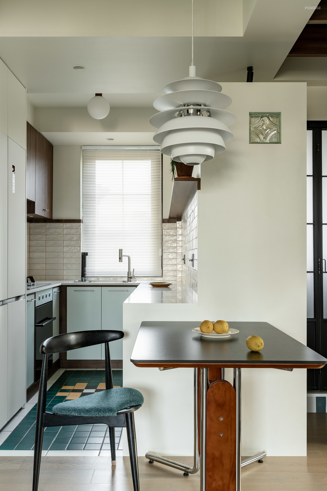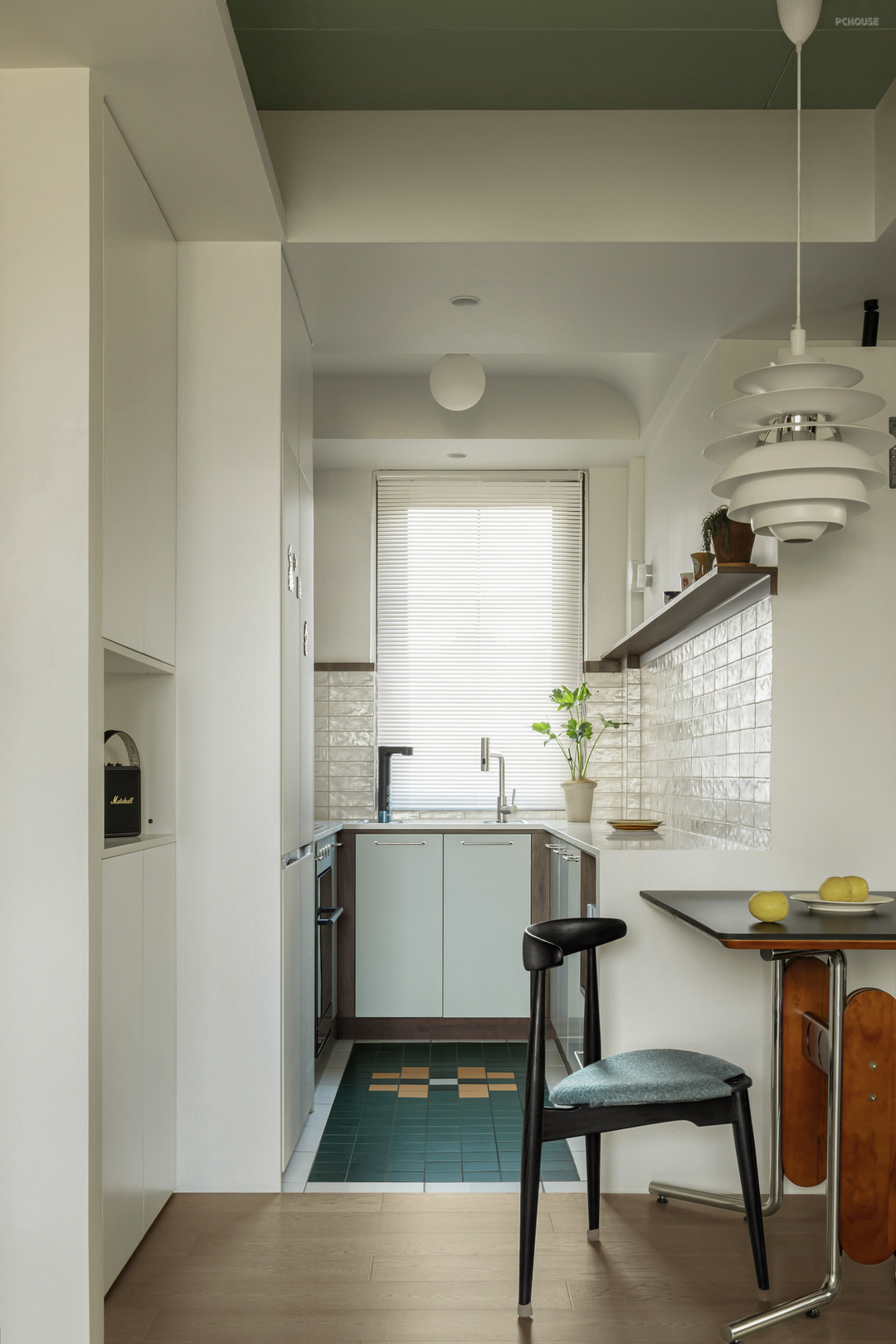 2、原封闭厨房变更为开放式厨房,延长了操作台面,让餐厅与厨房相连,与进入厨卫的双动线互不打扰,总体上提升入户区域的空间利用。