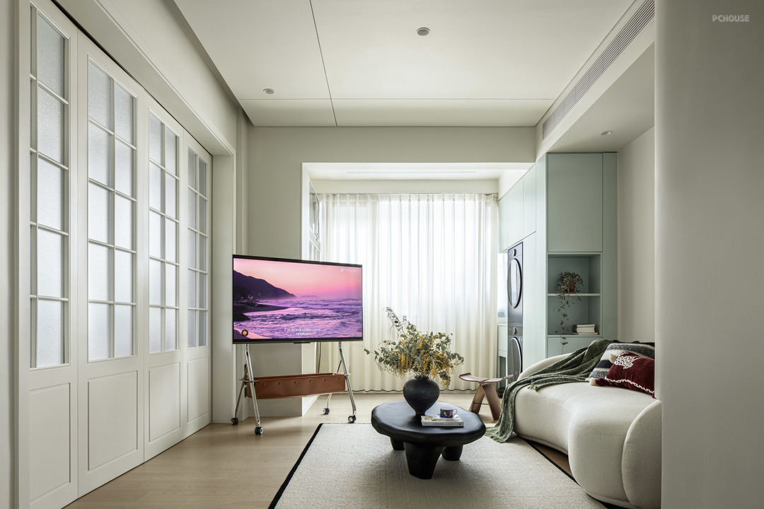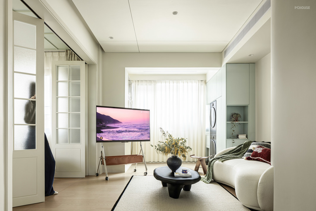 4、把客厅与阳台统一在一个空间,并通过折叠推拉门,实现把主卧纳入大开间的视线范围。