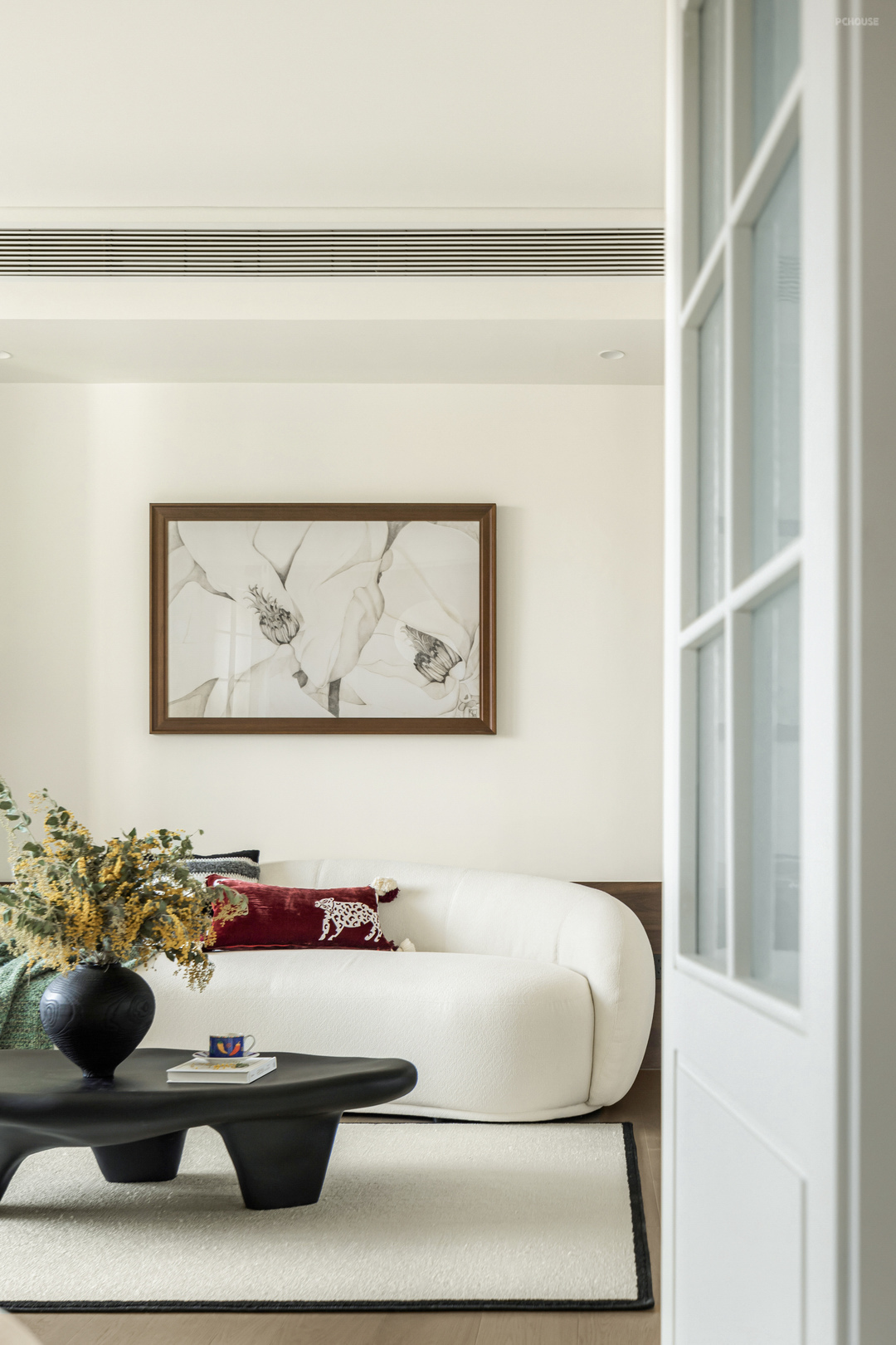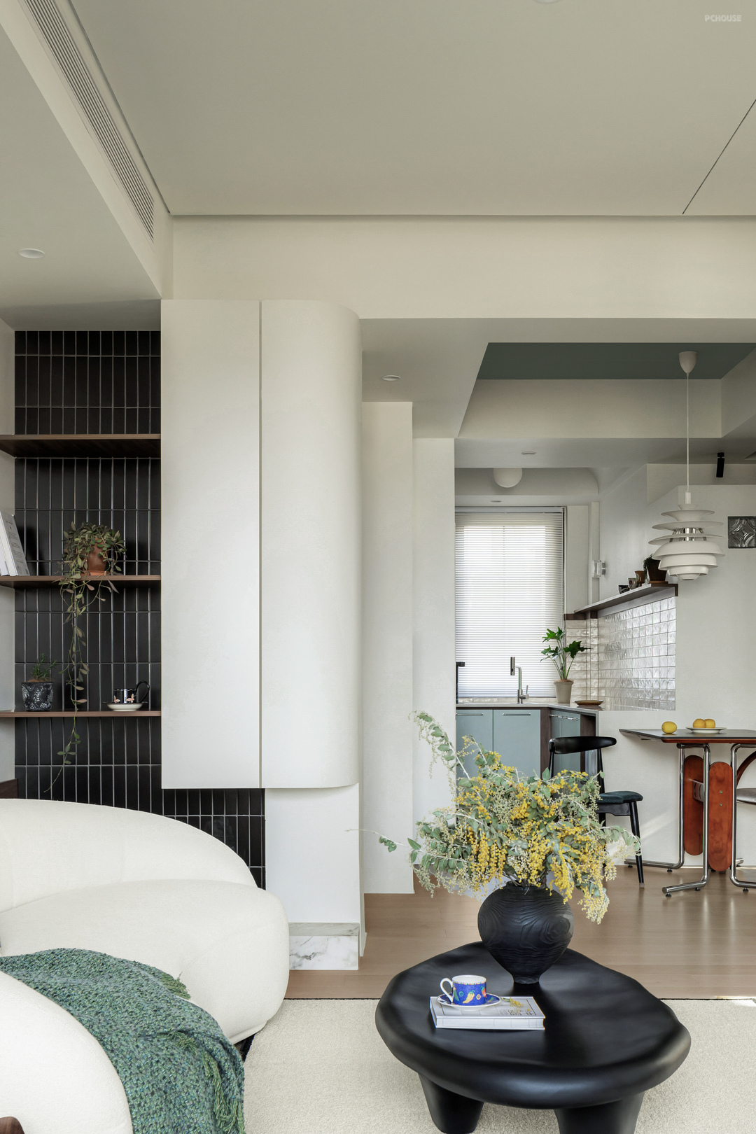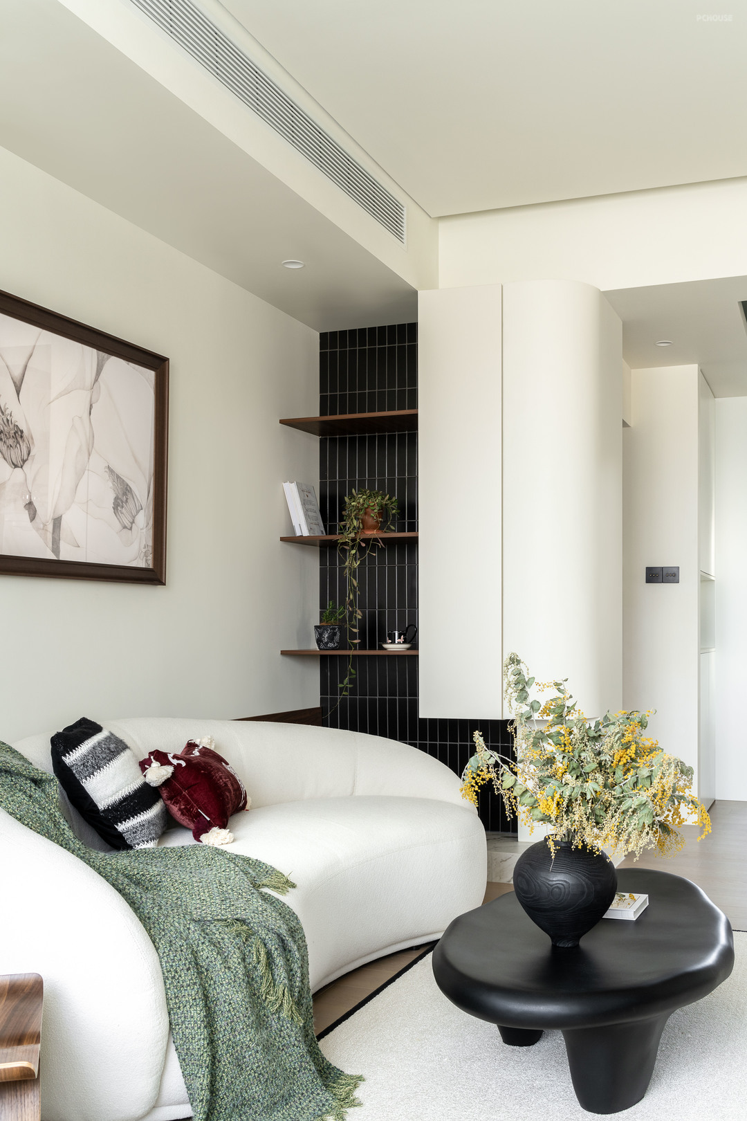 沙发旁边的柜体虚实结合,迎合原结构柱点的状态去进行设计,日常可以作为书架墙。