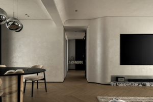 原有餐厅相对比较狭窄,于是设计师借用过道空间,将厨房墙体改为弧形,不仅释放了餐厅的舒适尺度,也弱化了过道的尖锐感。