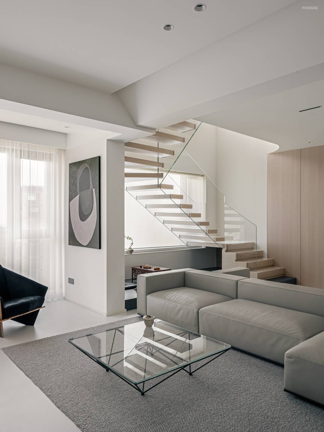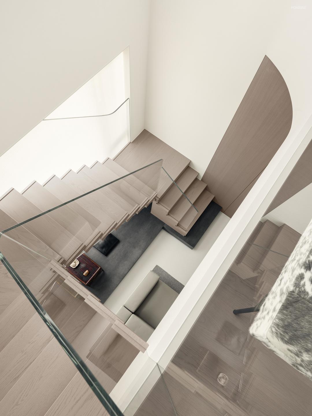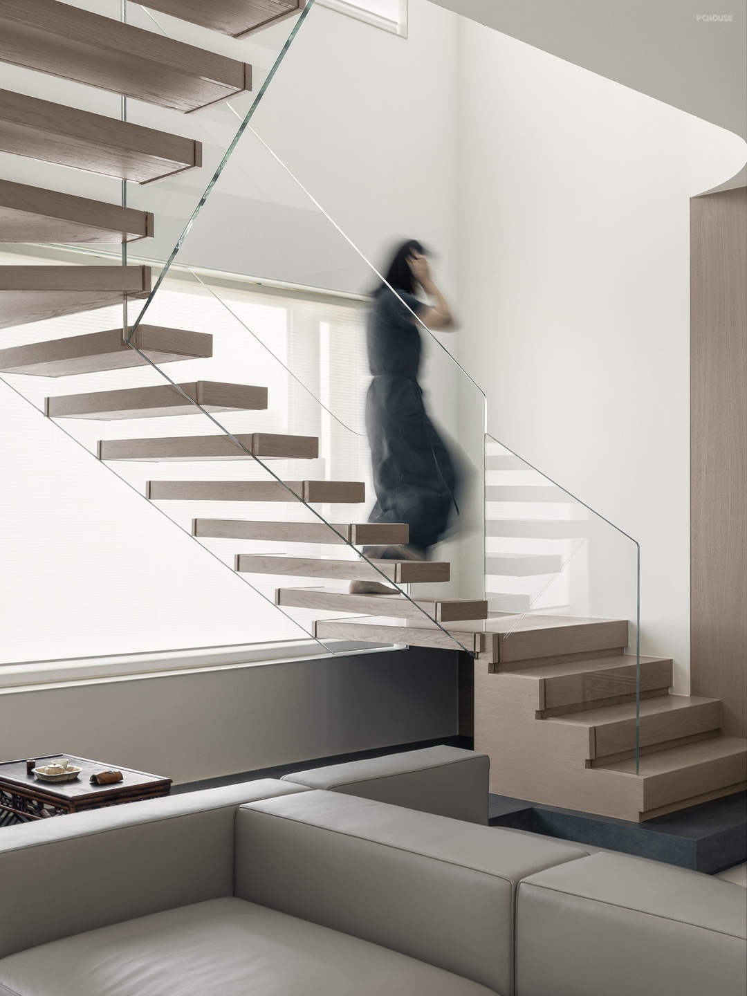 楼梯随体块层级而上,拼接全透玻璃,轻盈结构质感。保障安全性的同时,不遮挡视线的行径脉络,同时避免对采光的影响,切实关照了功能与美学的共存。
