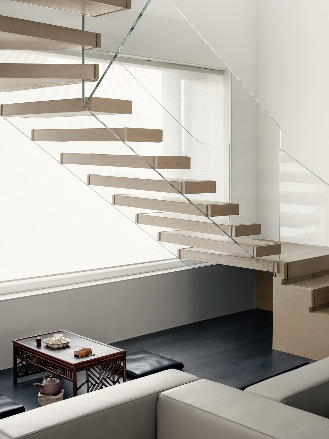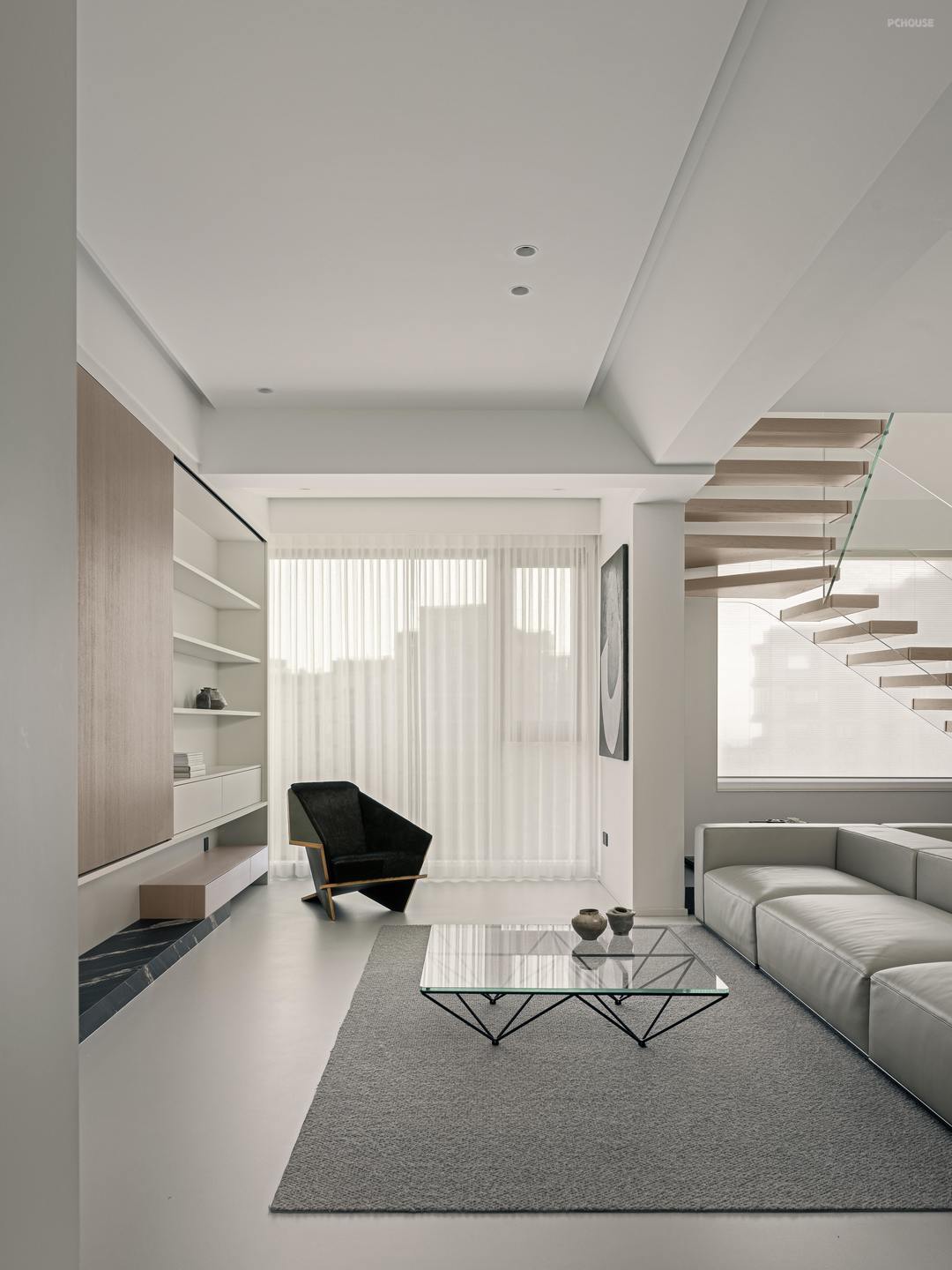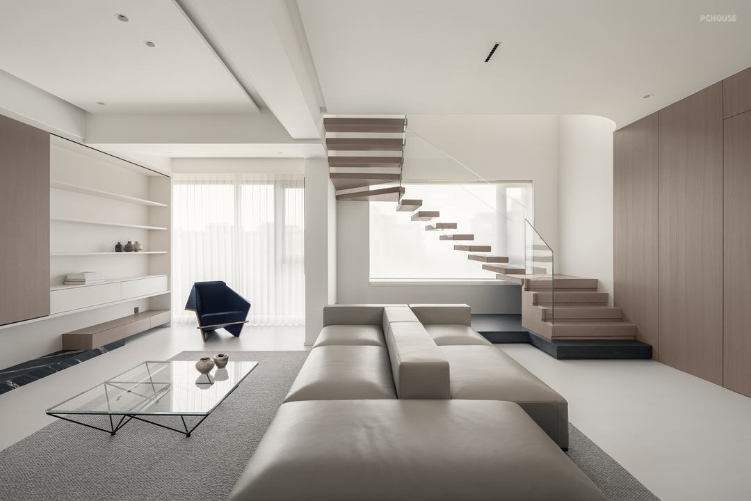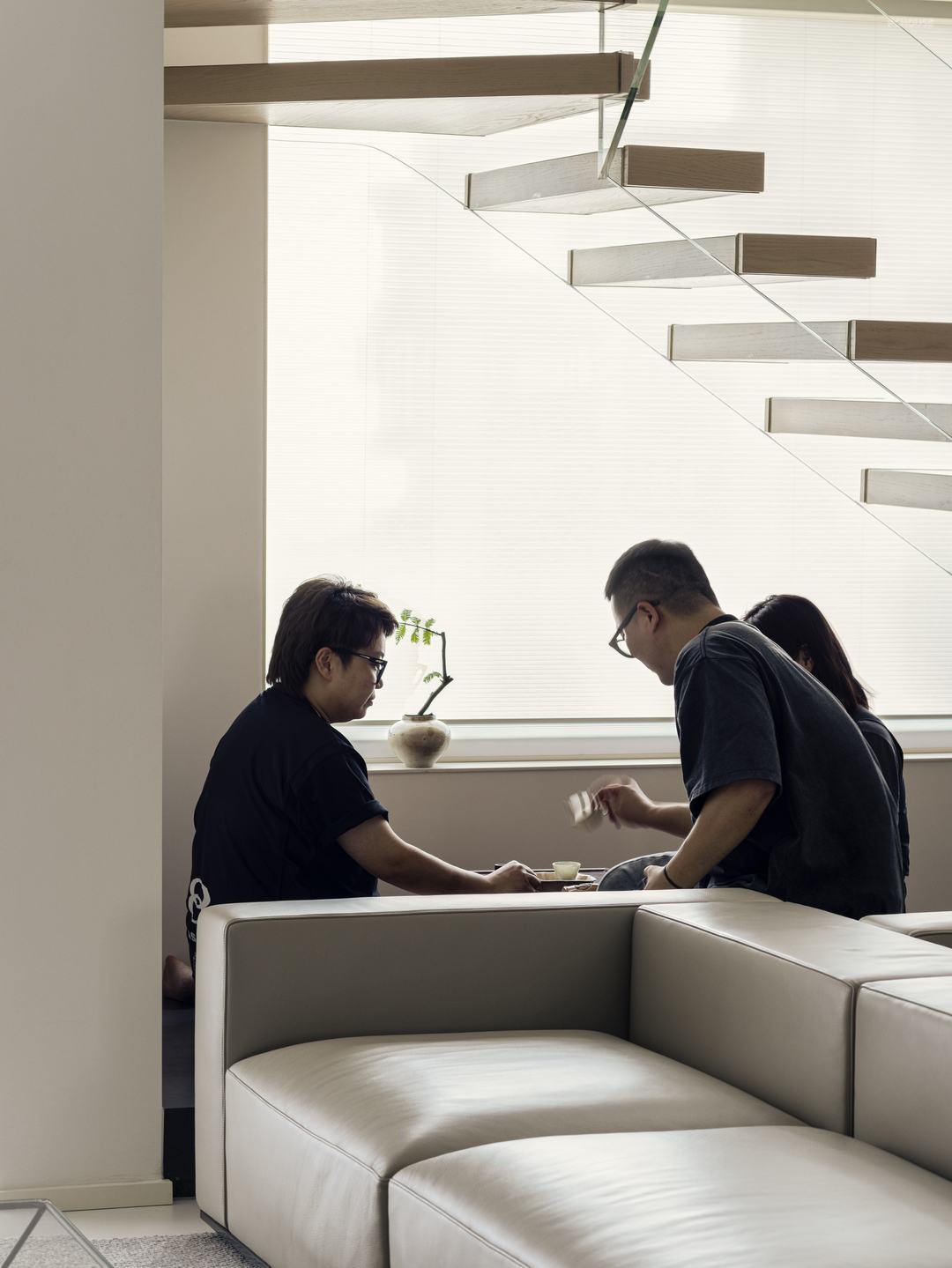 楼梯随体块层级而上,拼接全透玻璃,轻盈结构质感。保障安全性的同时,不遮挡视线的行径脉络,同时避免对采光的影响,切实关照了功能与美学的共存。