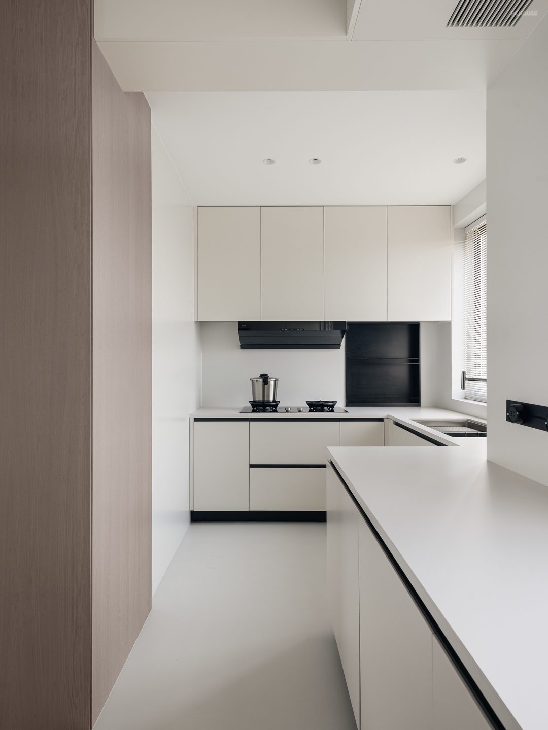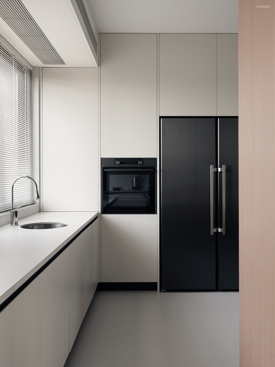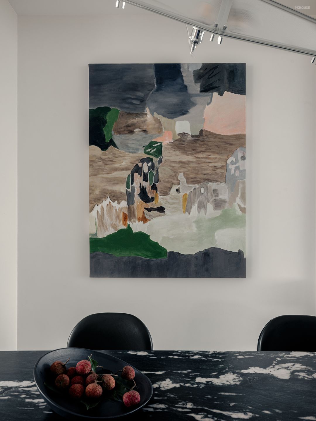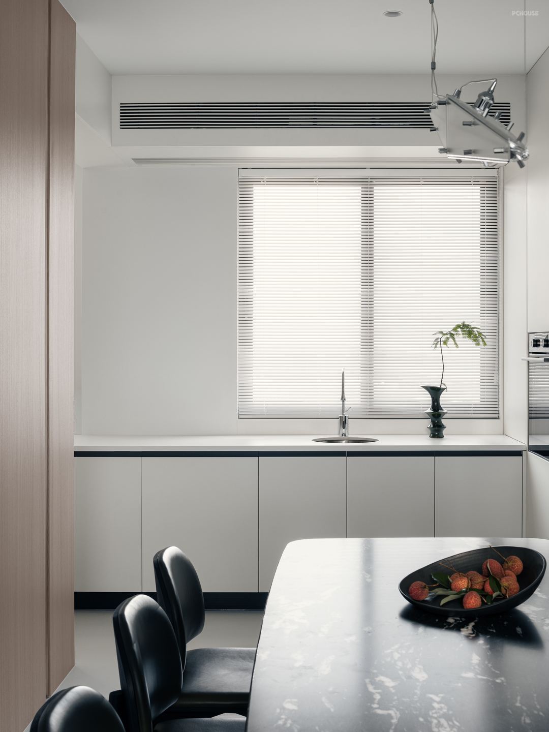 素色主调衍生纯粹意境,在当代主义的简美之下,汇入雅黑石纹,与抽象艺术协同出微妙的张弛感,另生一份灵动气质。厨房纳入原始设备房,中西厨串联一体,延伸操作面积。搭配高效流畅的收纳系统,延续着长期主义的生活方式。
