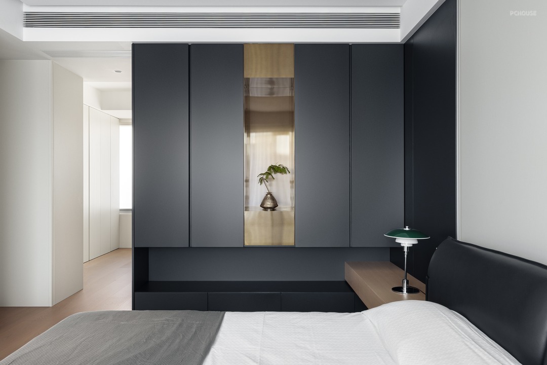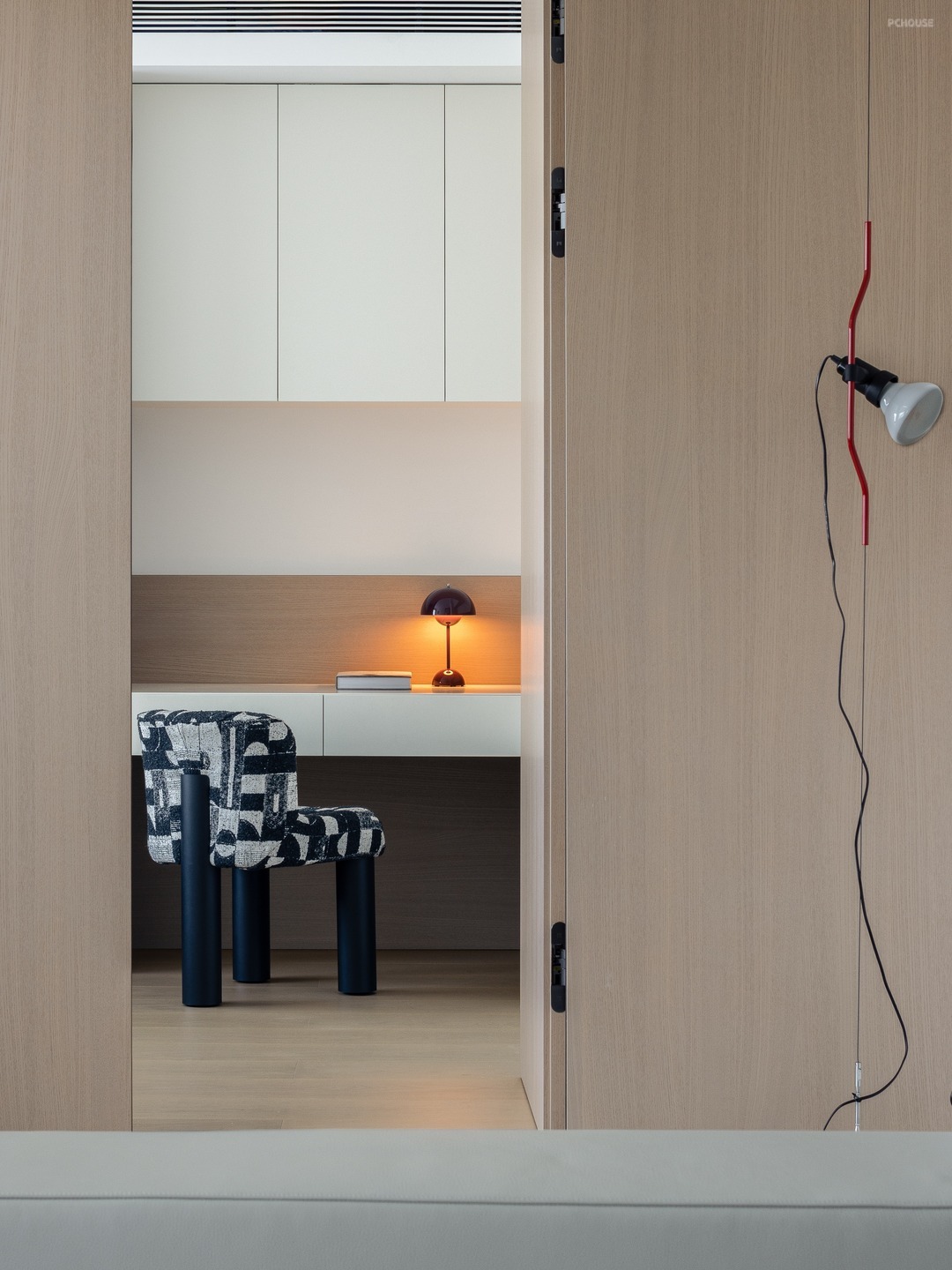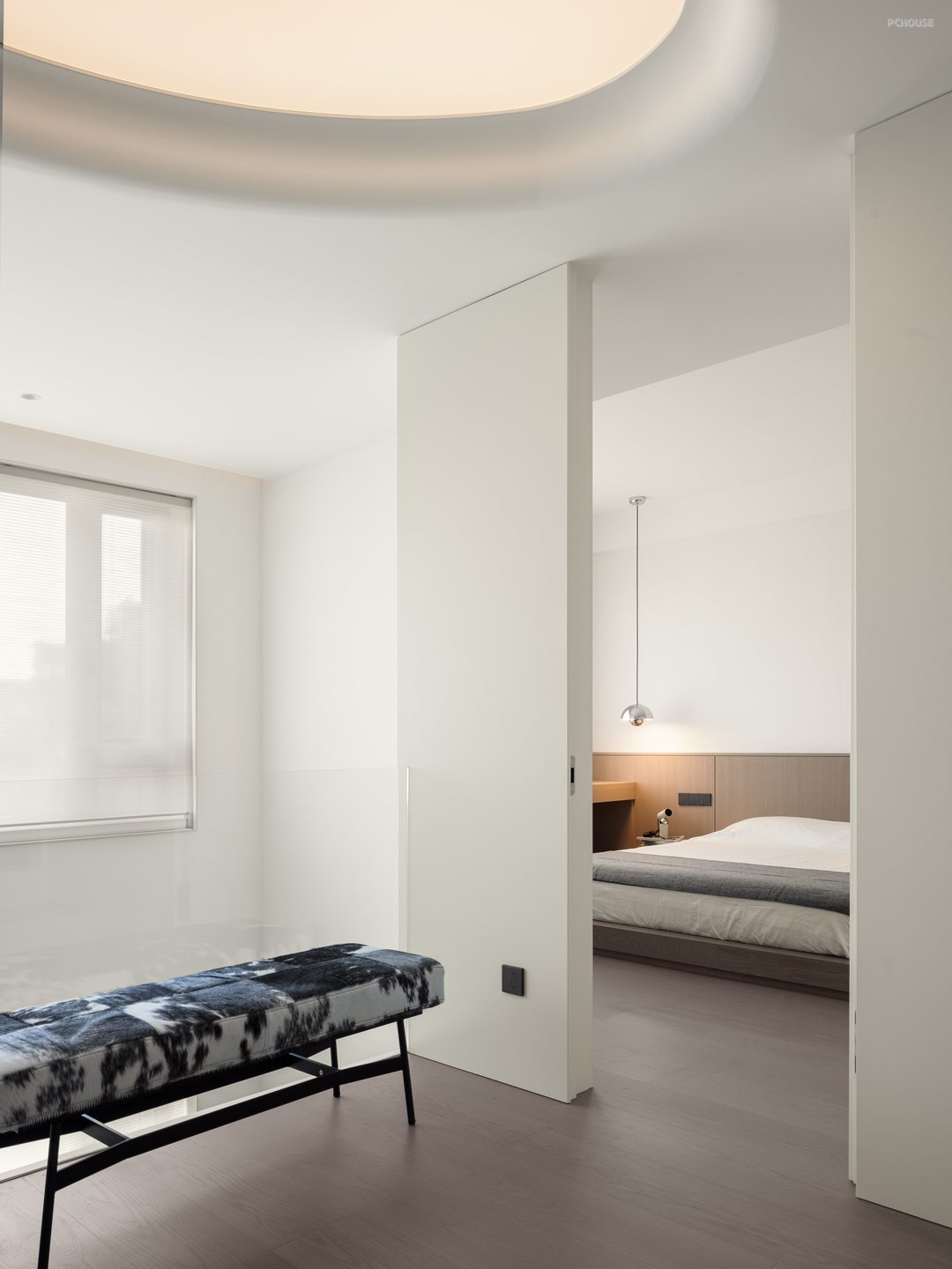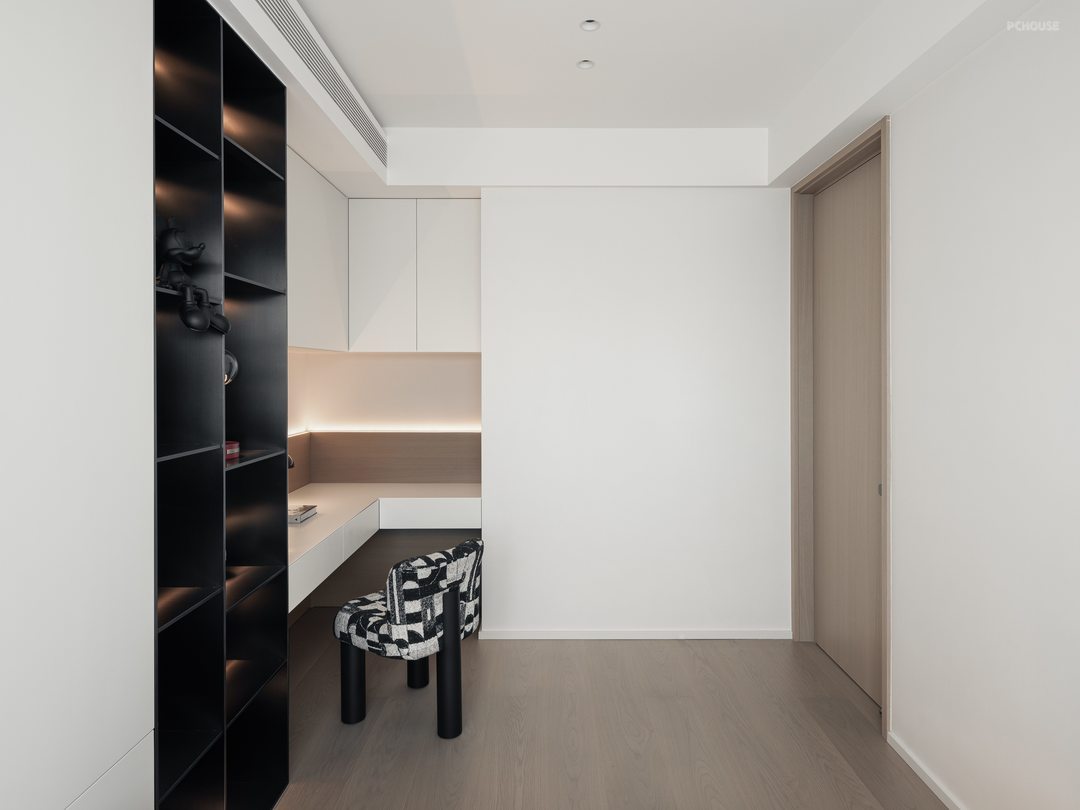 主卧入寝区与衣帽间互相贯穿,形成私域脉络,卫浴独立于移门后,共建秩序感的空间整体。衣帽间描摹着低纯度的空间骨架,组合不同收纳形式,优化更便捷的生活系统。