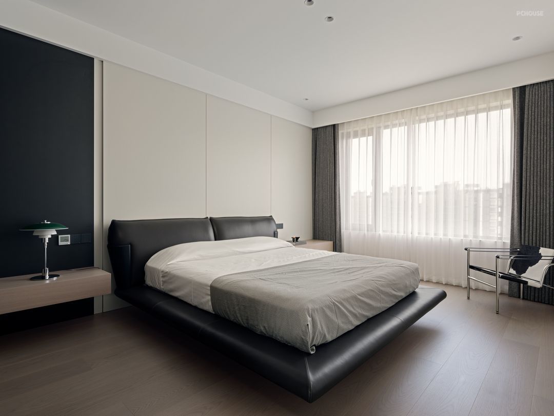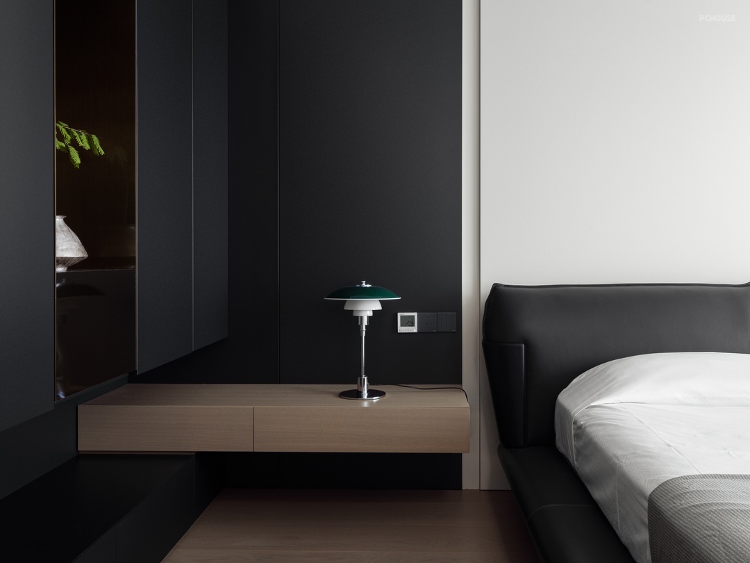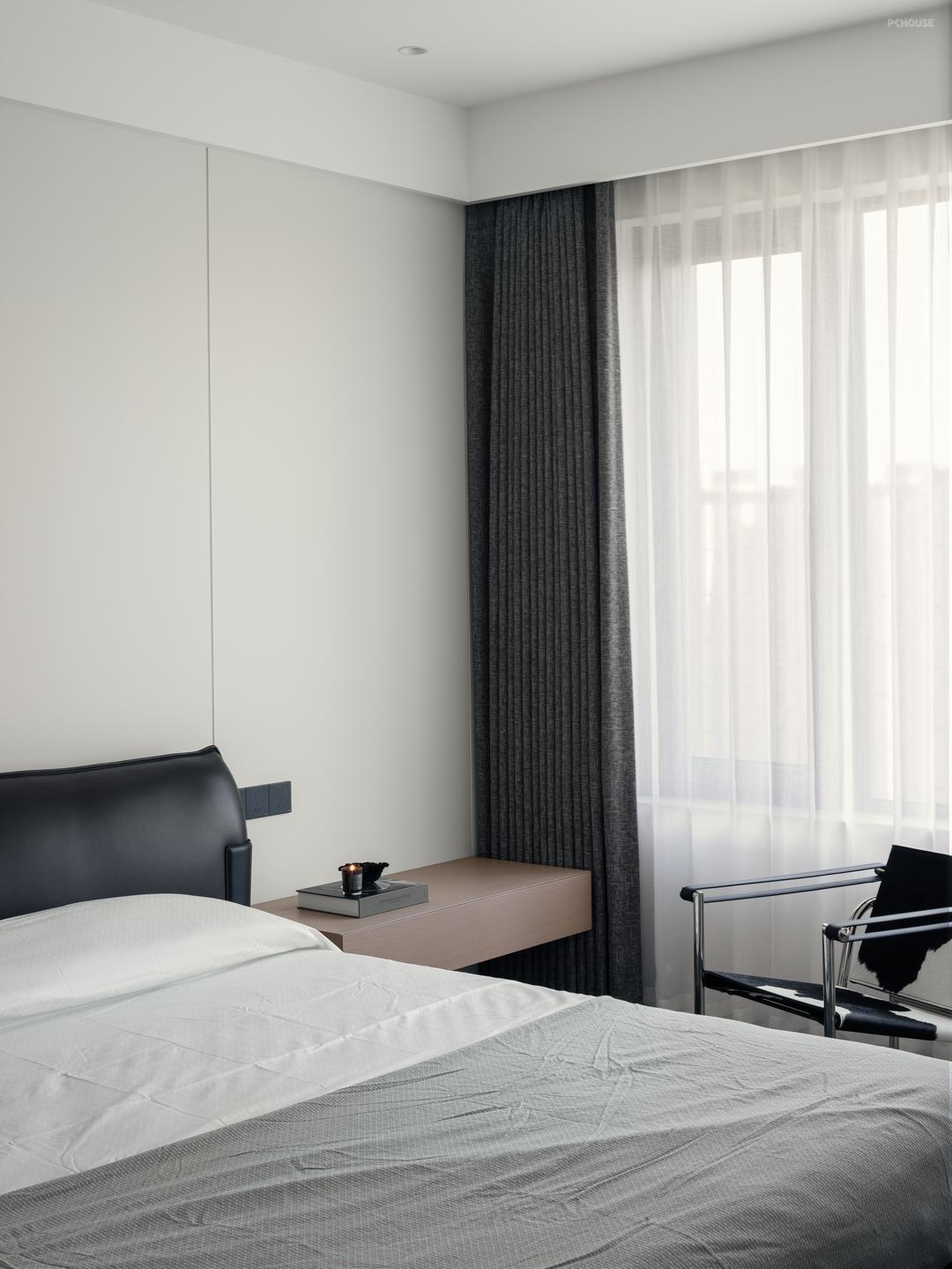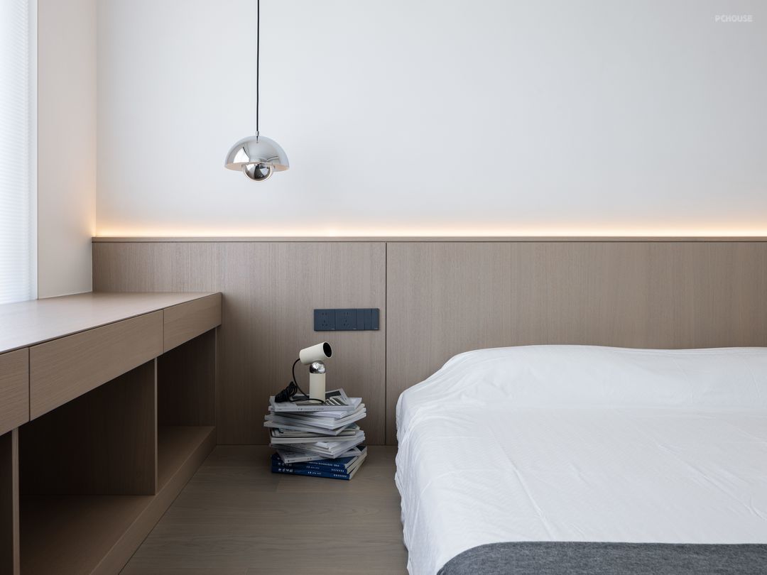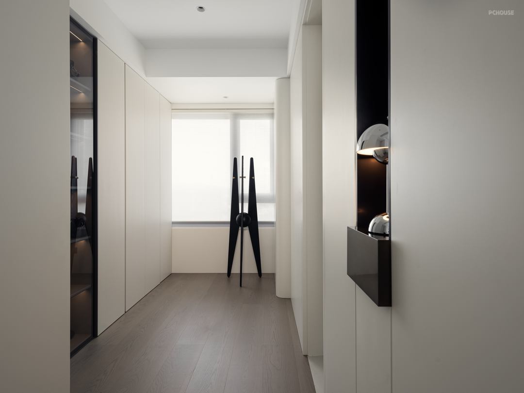主卧入寝区与衣帽间互相贯穿,形成私域脉络,卫浴独立于移门后,共建秩序感的空间整体。衣帽间描摹着低纯度的空间骨架,组合不同收纳形式,优化更便捷的生活系统。