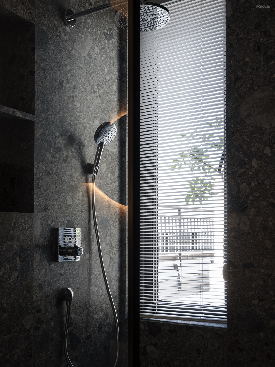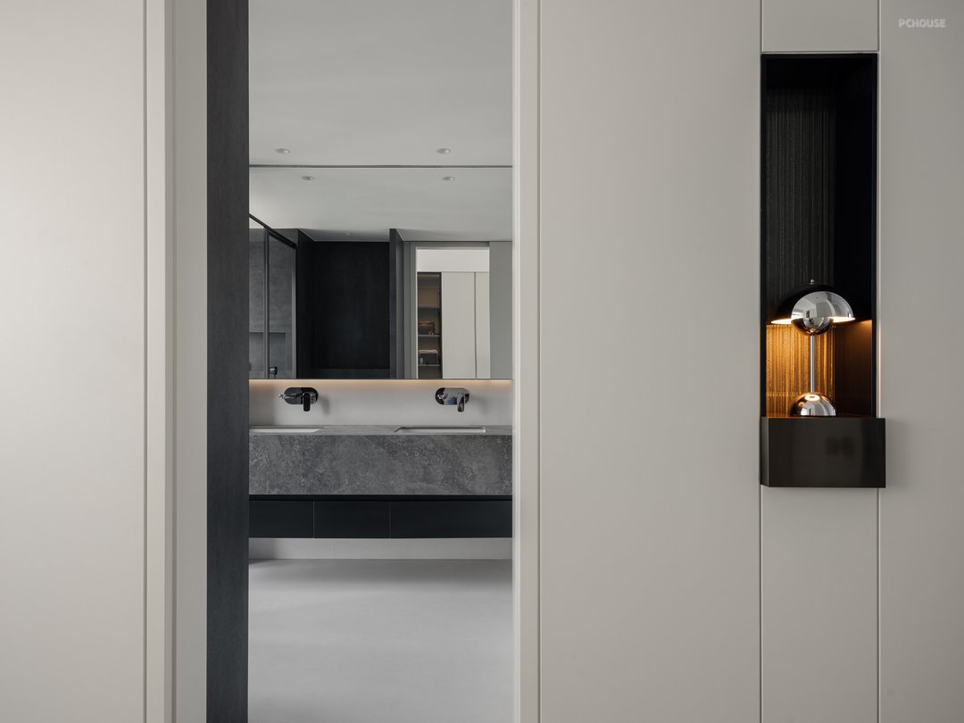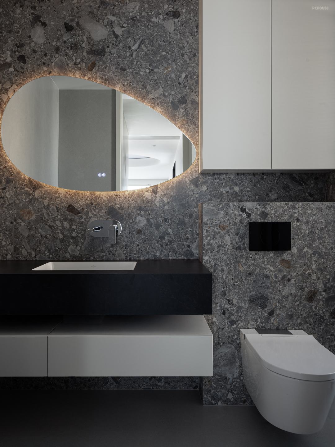 卫浴延续现代黑白框架,关照居住者个性的生活态度,铺展暗调水磨石,理性与极简共持,浸润于仪式感的安逸奢享。