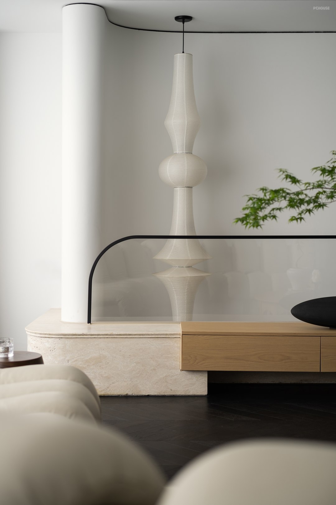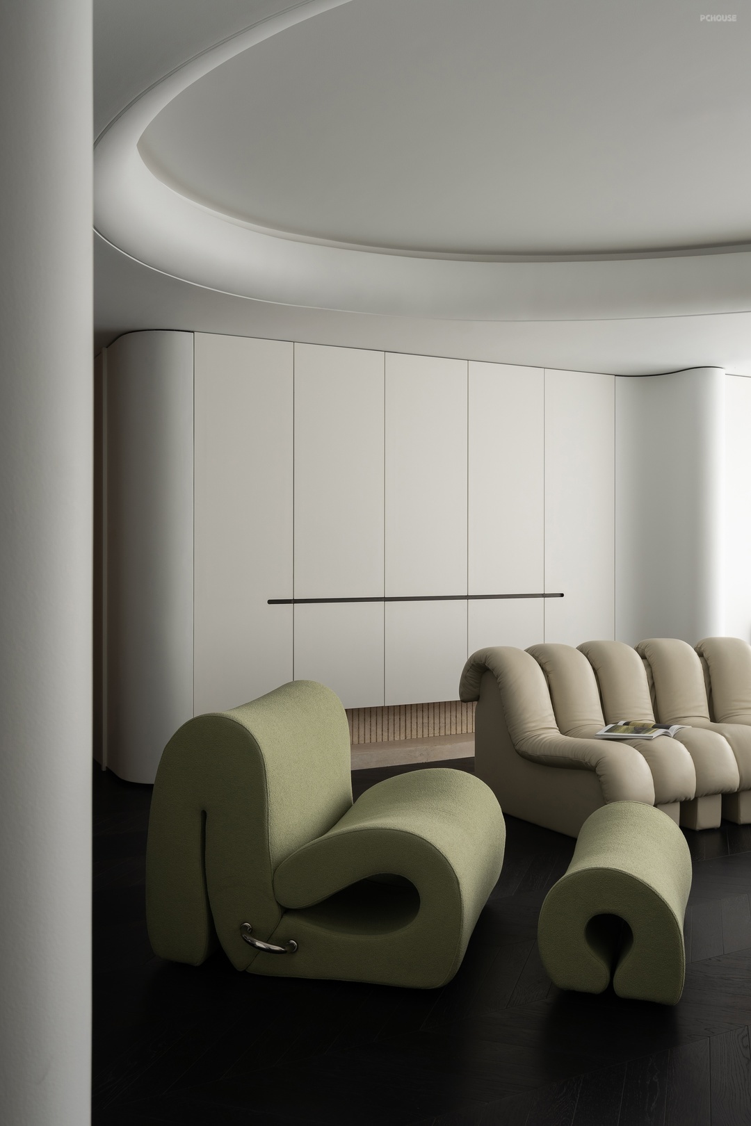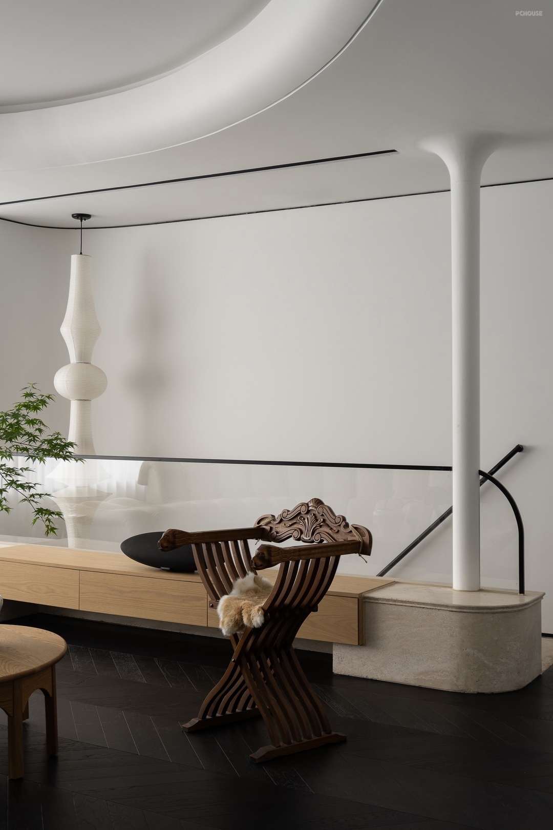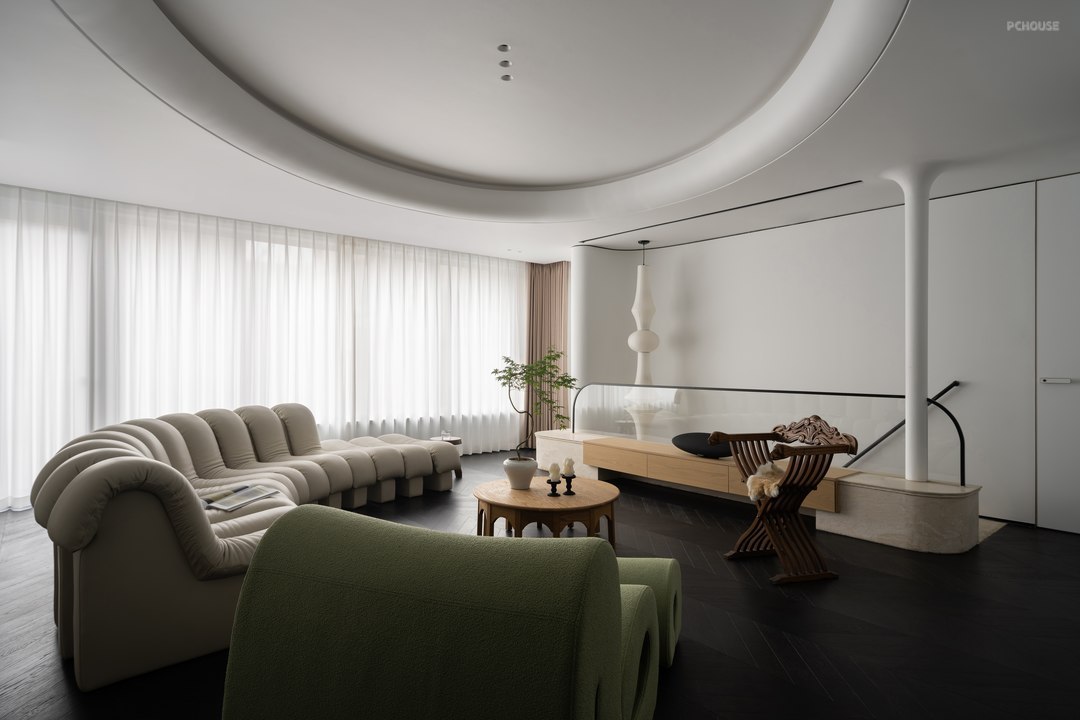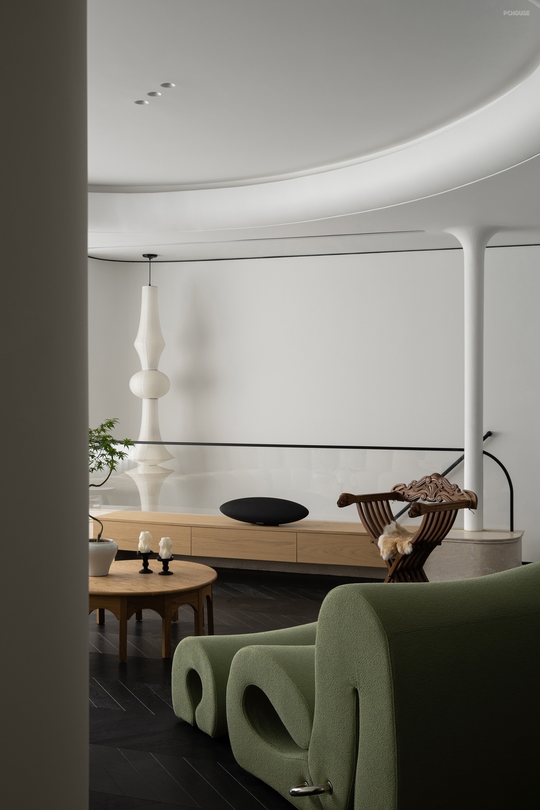 一层空间以女主人偏爱的法式复古为主调,将古典优雅的元素融入现代语境中,呈现出一种不动声色的浪漫与精致。立柱与墙角的转折处以柔和的圆角处理,柔弧的线条蔓延在家具之上,从吊顶到墙体、从沙发到茶几,处处流露着法式的温婉与从容。