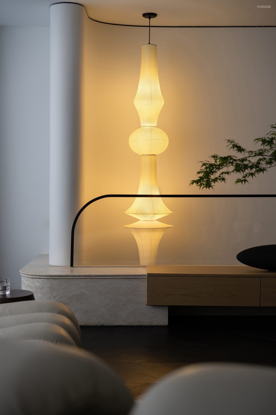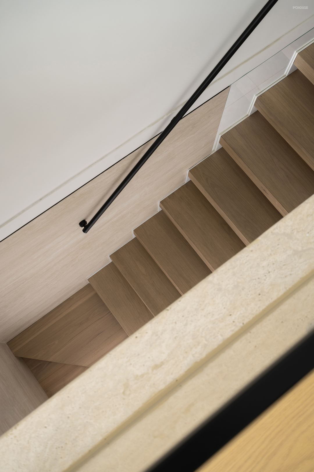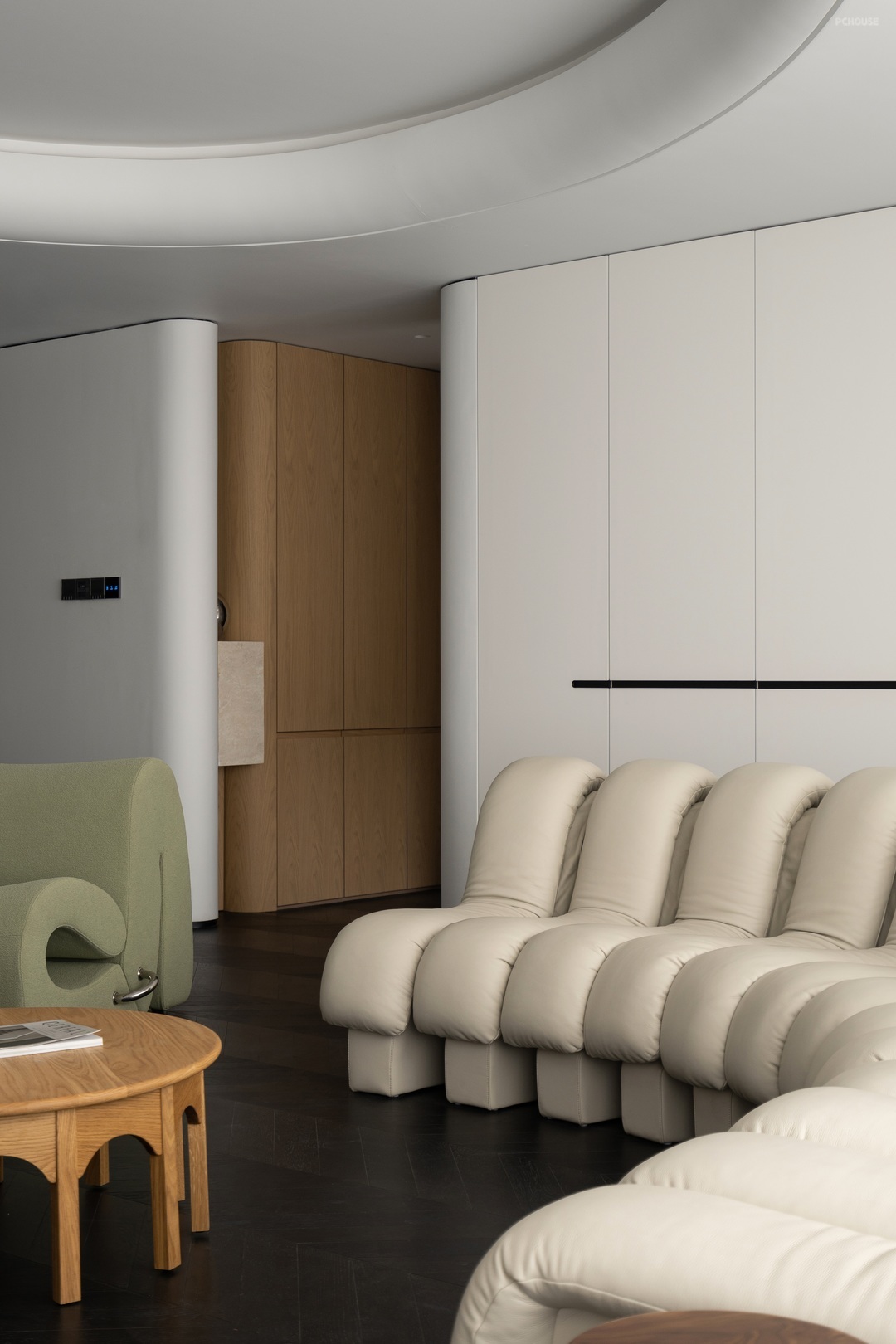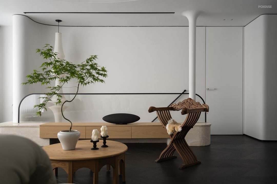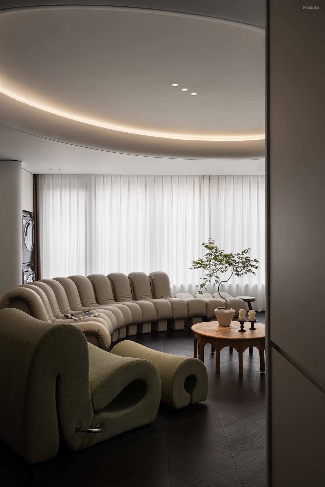 一层空间以女主人偏爱的法式复古为主调,将古典优雅的元素融入现代语境中,呈现出一种不动声色的浪漫与精致。立柱与墙角的转折处以柔和的圆角处理,柔弧的线条蔓延在家具之上,从吊顶到墙体、从沙发到茶几,处处流露着法式的温婉与从容。