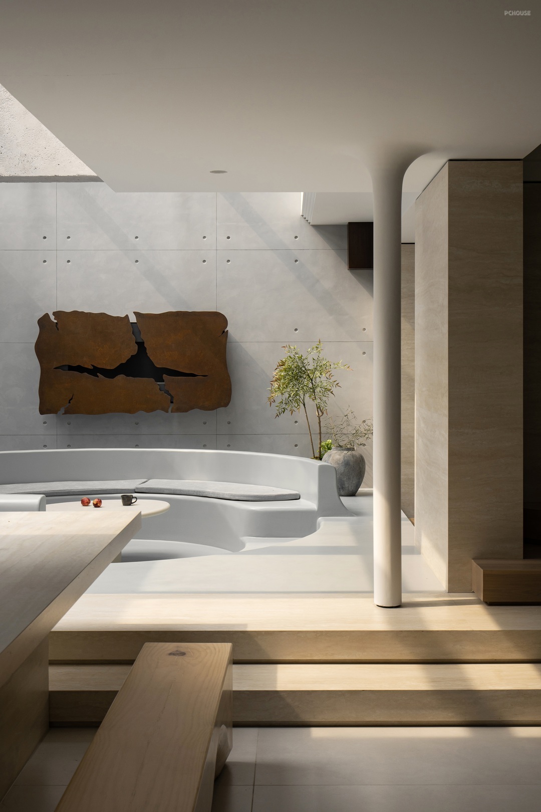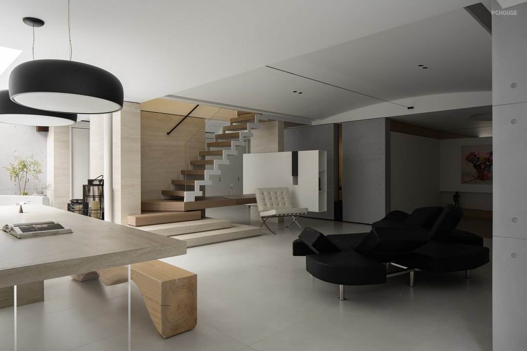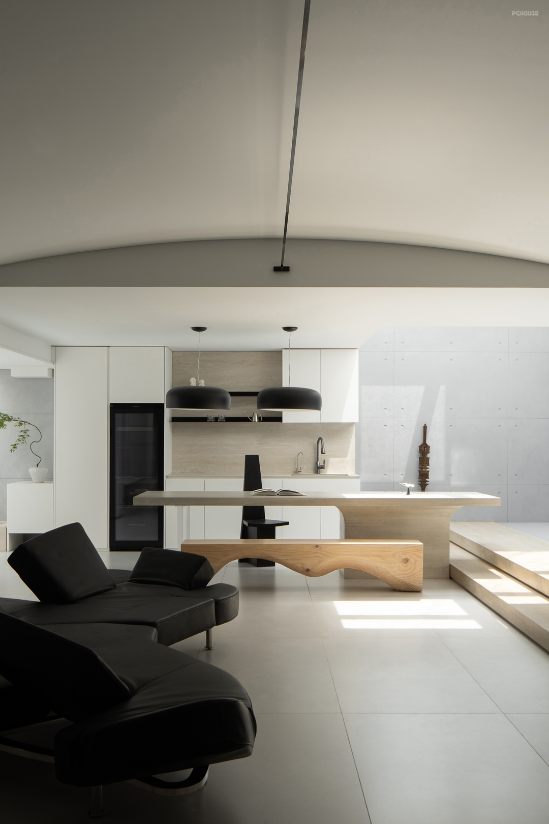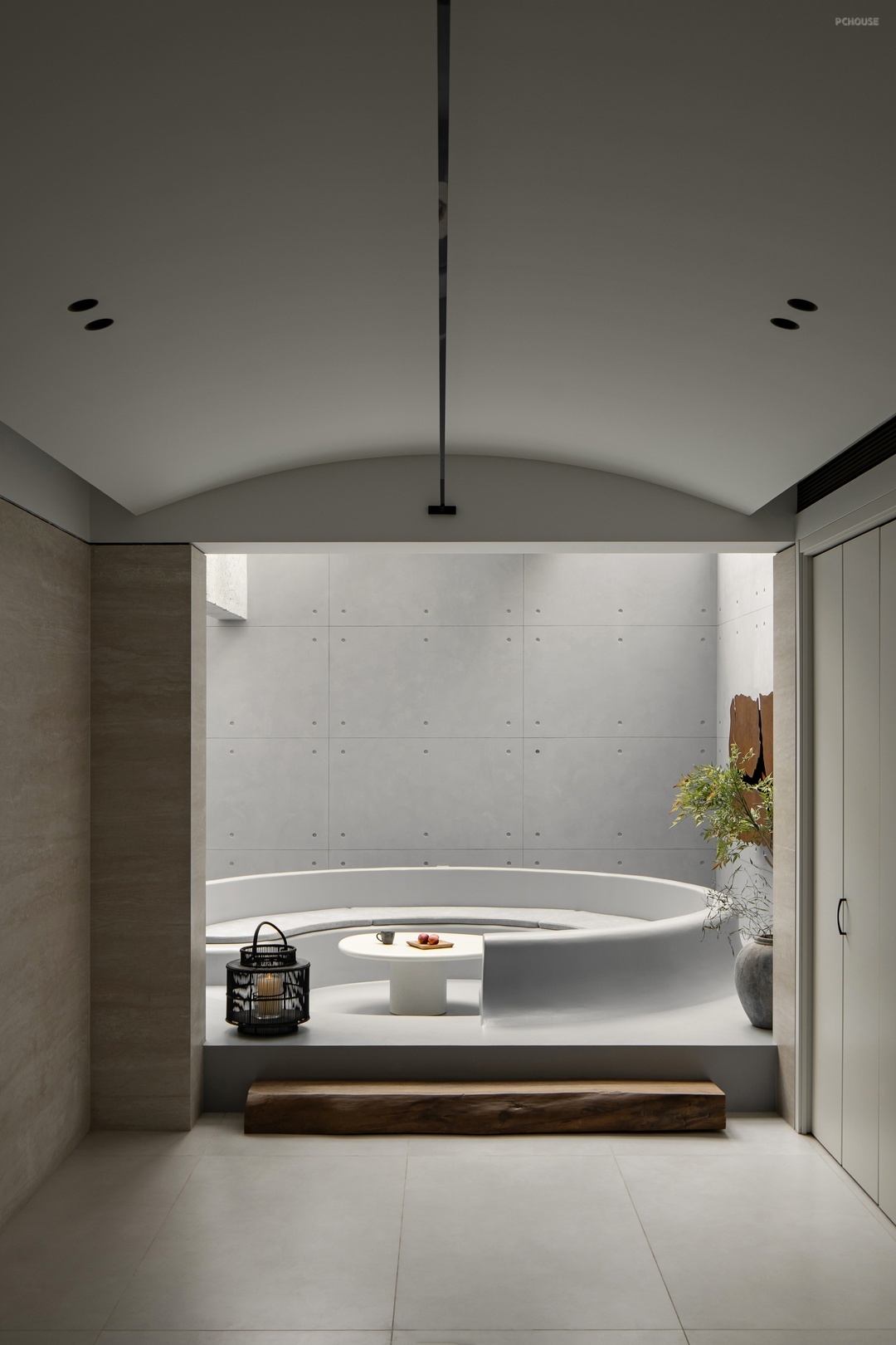 一层空间以女主人偏爱的法式复古为主调,将古典优雅的元素融入现代语境中,呈现出一种不动声色的浪漫与精致。立柱与墙角的转折处以柔和的圆角处理,柔弧的线条蔓延在家具之上,从吊顶到墙体、从沙发到茶几,处处流露着法式的温婉与从容。