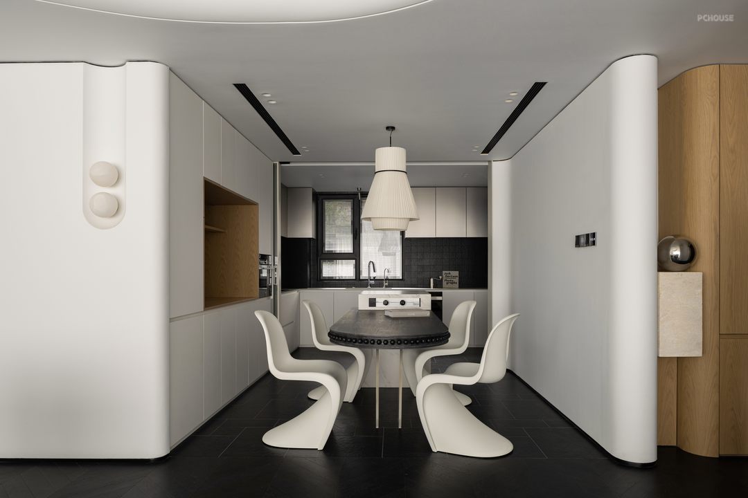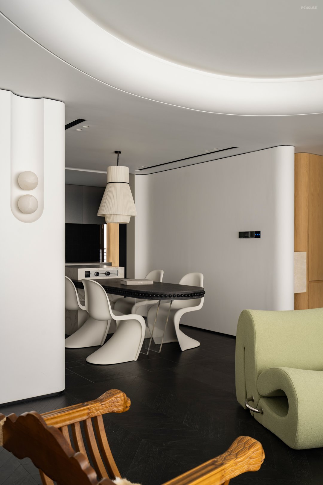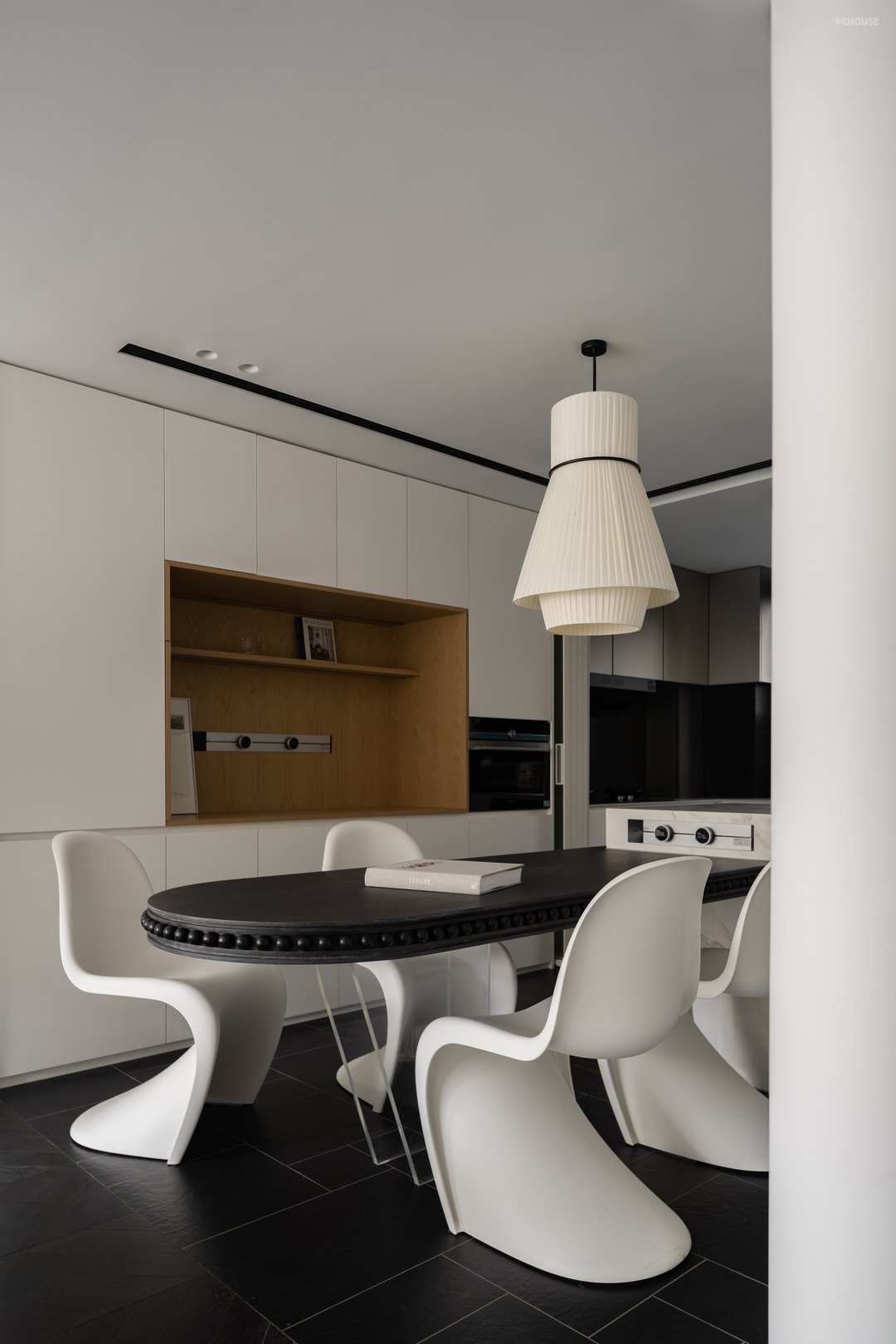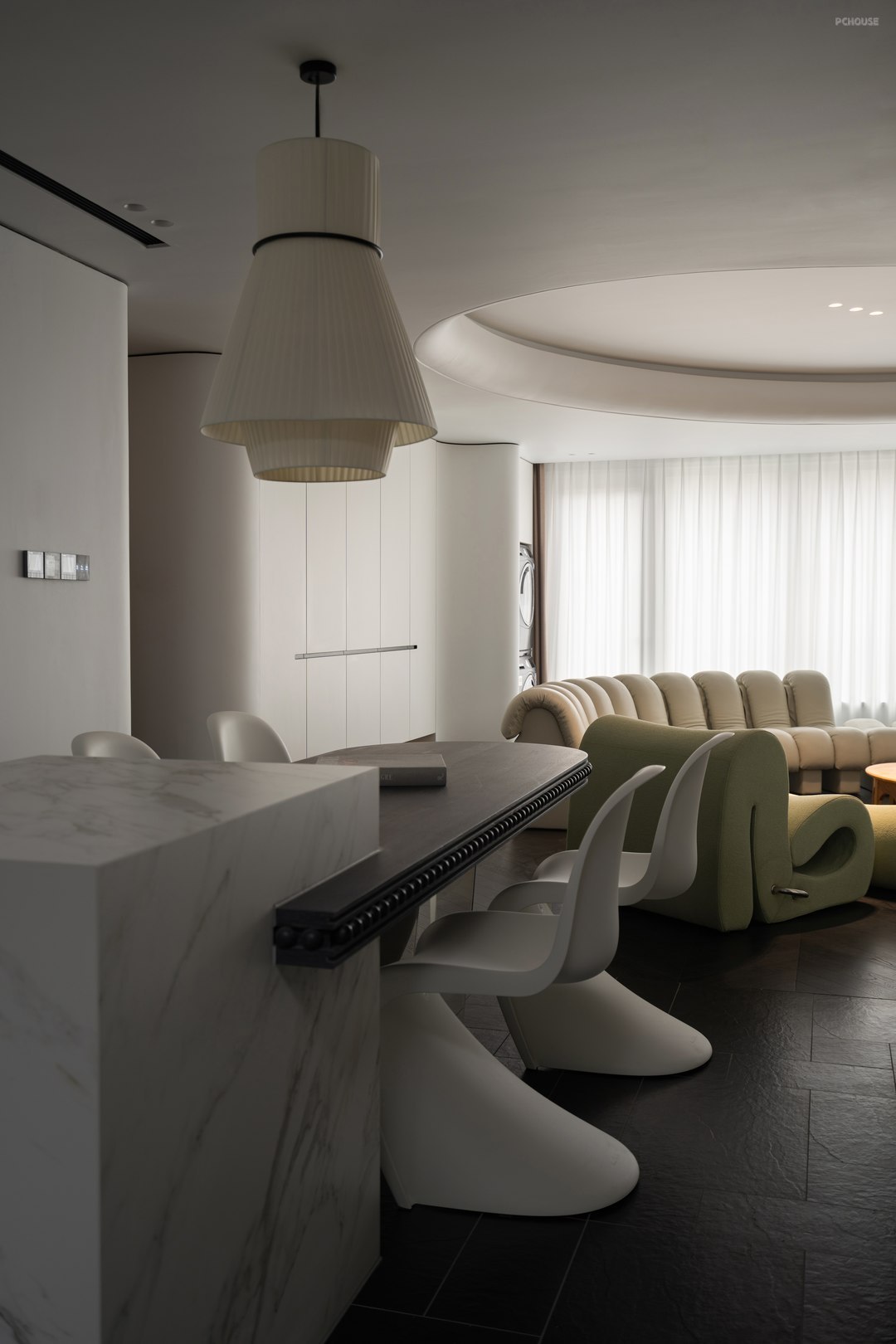 在餐厅的设计上,复古造型的桌板配合潘通椅的现代曲线,将时代的界限巧妙打破,重构出一种属于当下的复古美学。潘通椅被誉为“美人椅”,流畅而柔美的线条让人联想到窈窕的淑女,餐桌上悬挂的裙摆造型吊灯与之相呼应,将法式浪漫演绎得恰到好处。