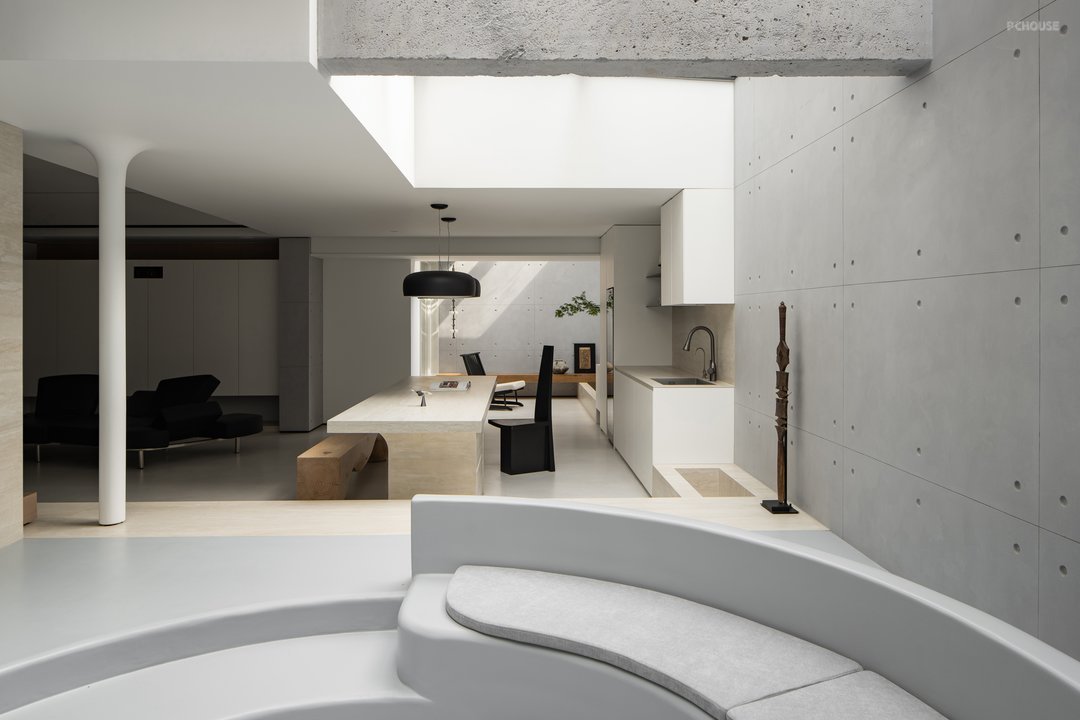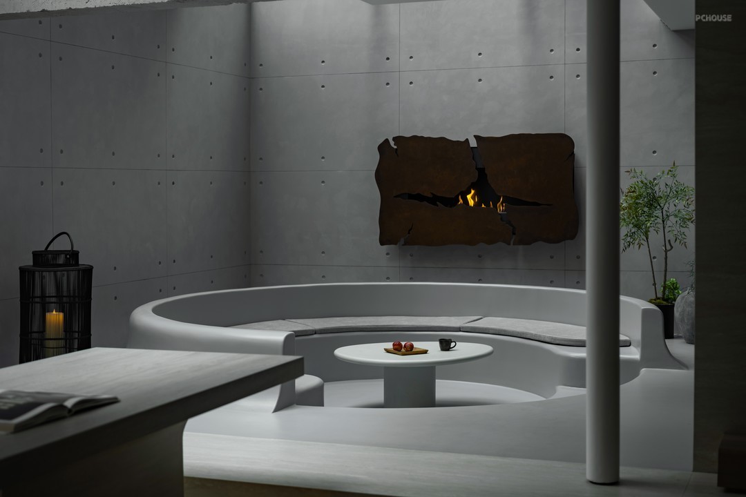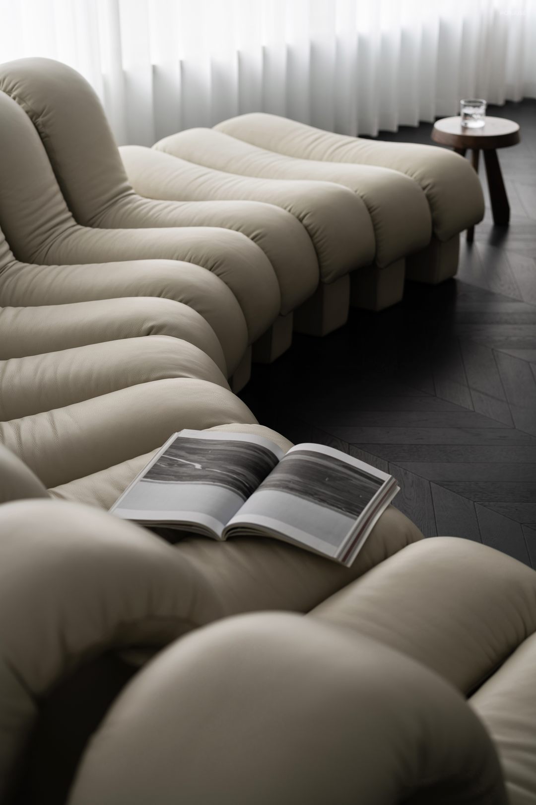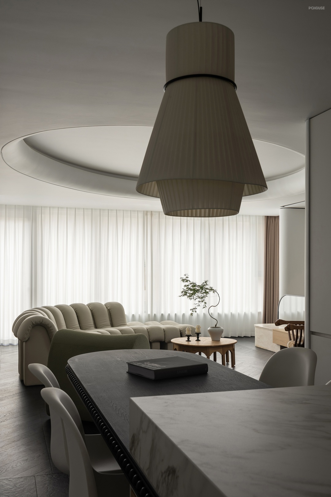 在餐厅的设计上,复古造型的桌板配合潘通椅的现代曲线,将时代的界限巧妙打破,重构出一种属于当下的复古美学。潘通椅被誉为“美人椅”,流畅而柔美的线条让人联想到窈窕的淑女,餐桌上悬挂的裙摆造型吊灯与之相呼应,将法式浪漫演绎得恰到好处。