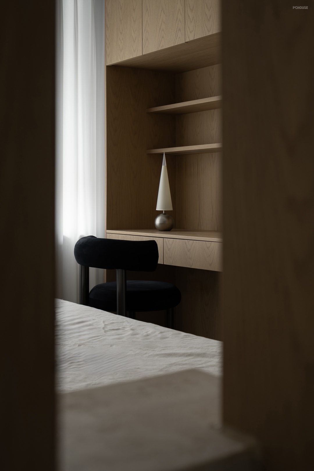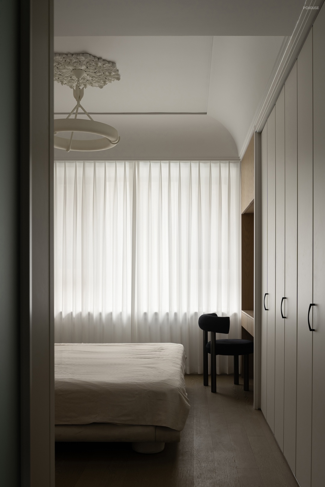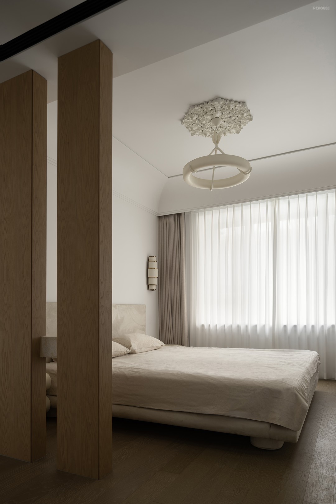 主卧延续了法式的浪漫主义调性,一盏雕花吊灯悬挂于卧床上方,细节繁复而不繁冗。墙面采用米白与浅灰的低饱和色调,搭配线条分割与金属点缀,简约的空间中不乏细腻精致。主卧进门处的墙壁做镂空设计,既保留了私密性,又让光线与视线得以自由穿行,空间因此更具呼吸感。