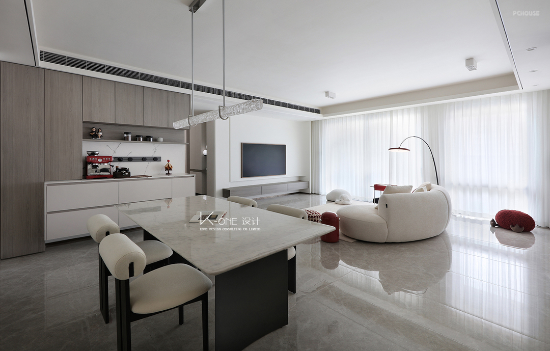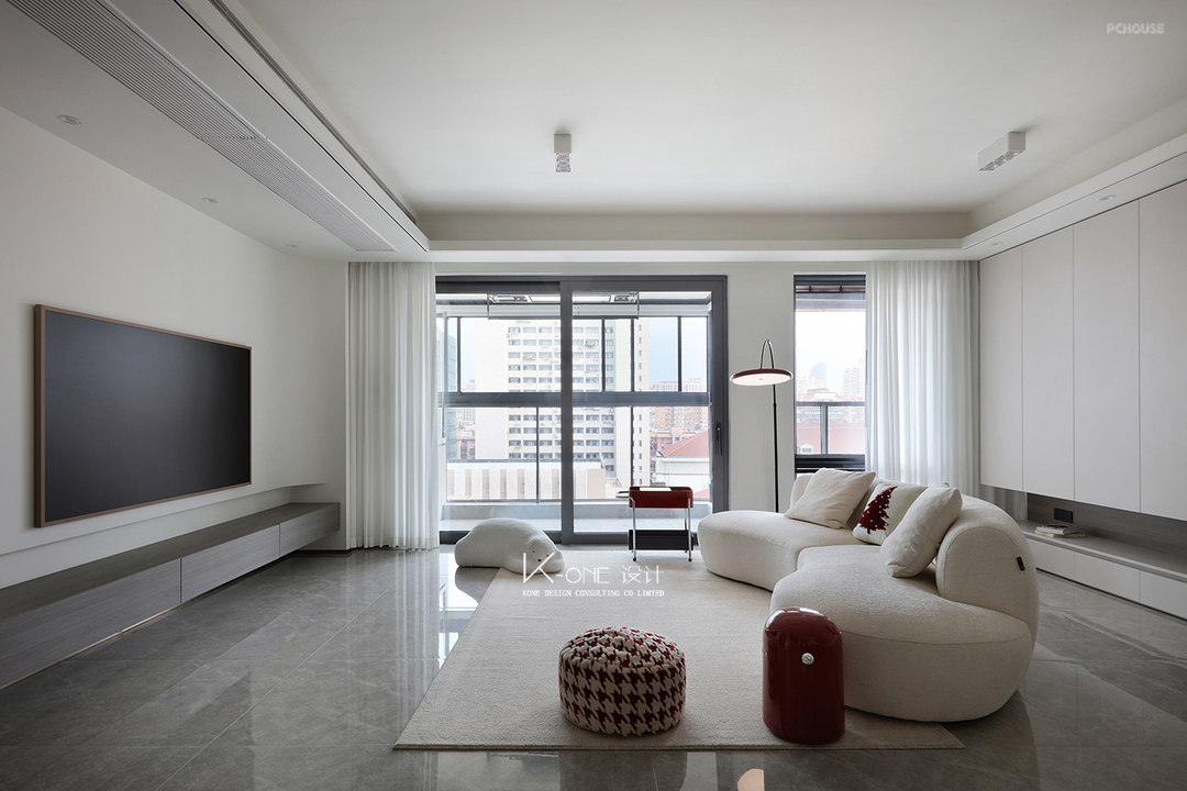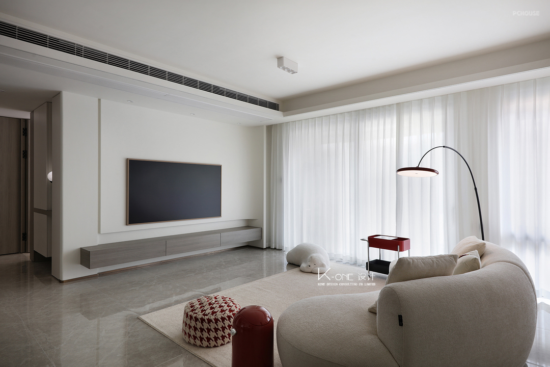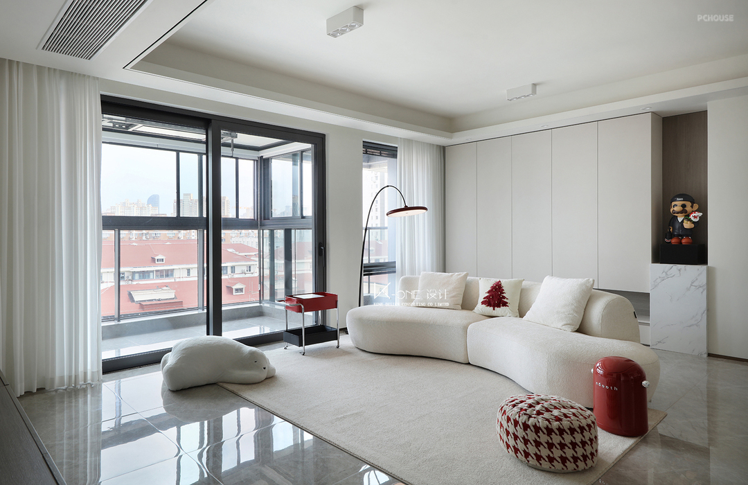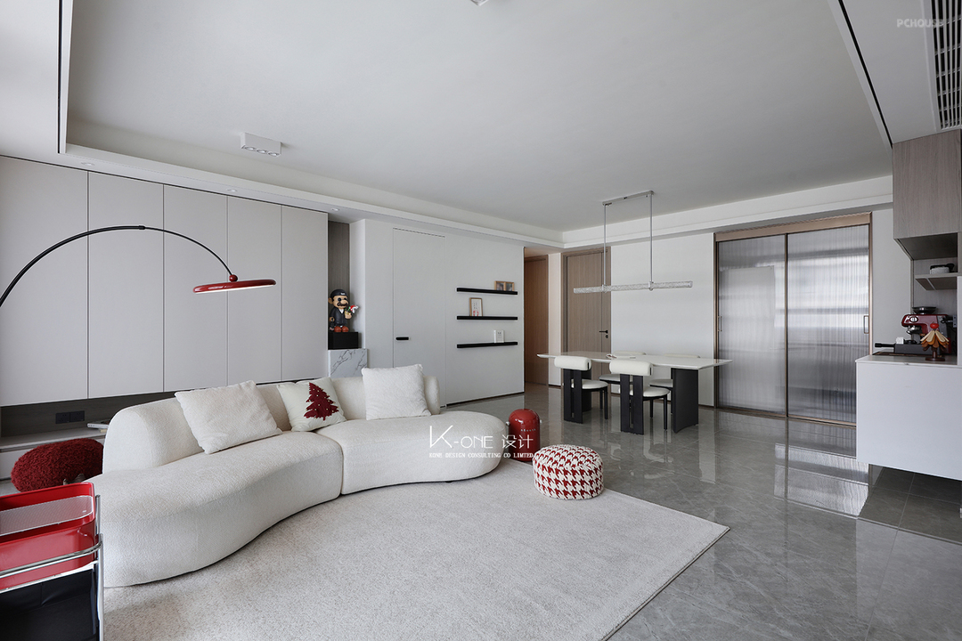 设计以简洁为核心,开放式的空间尽显明亮与通透 白色沙发与简约设计相得益彰,营造出轻松舒适的氛围。大窗户带来充足自然光,红色配饰为空间增添了一丝活力,完美适合休闲和亲子时光。