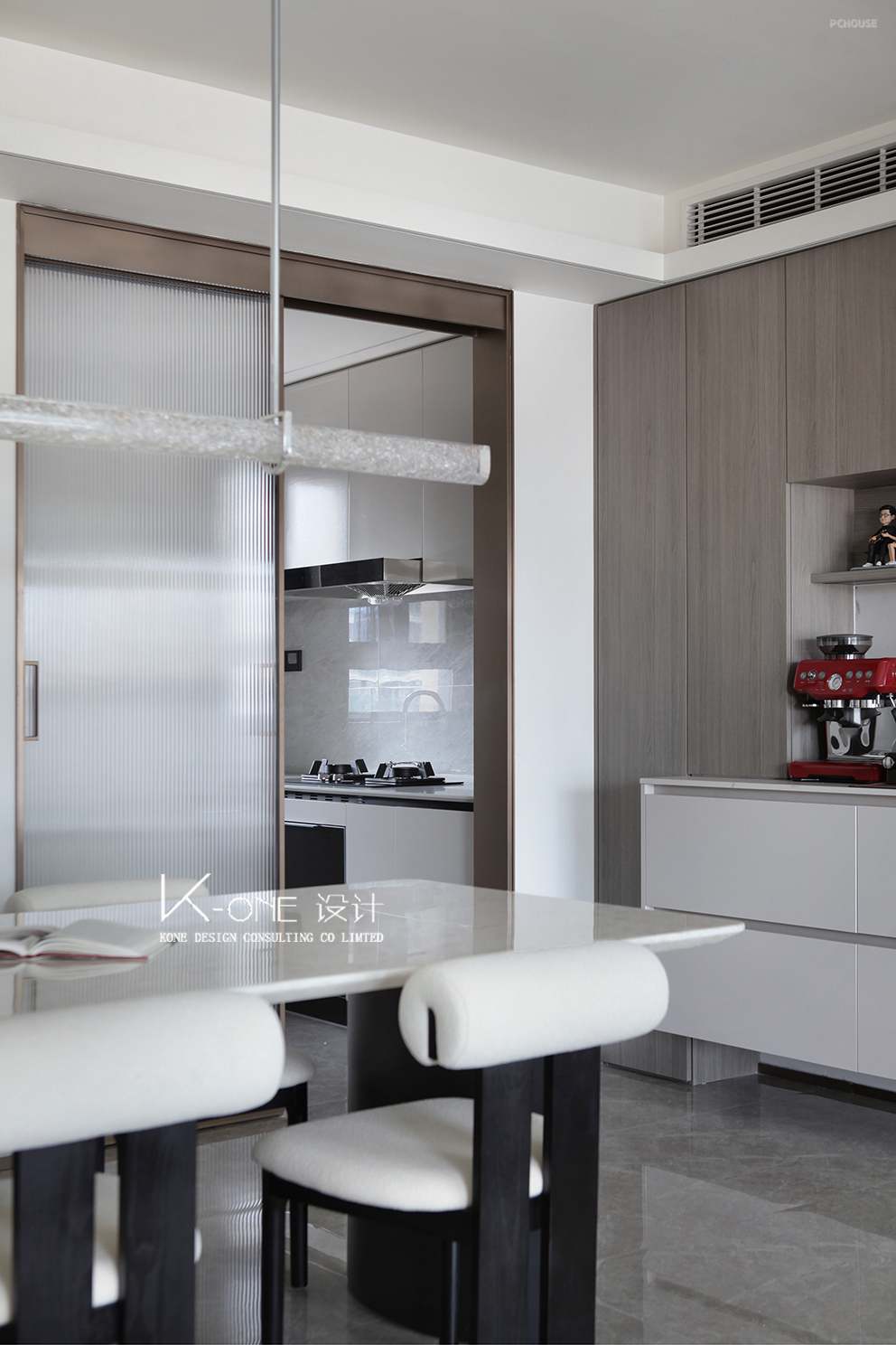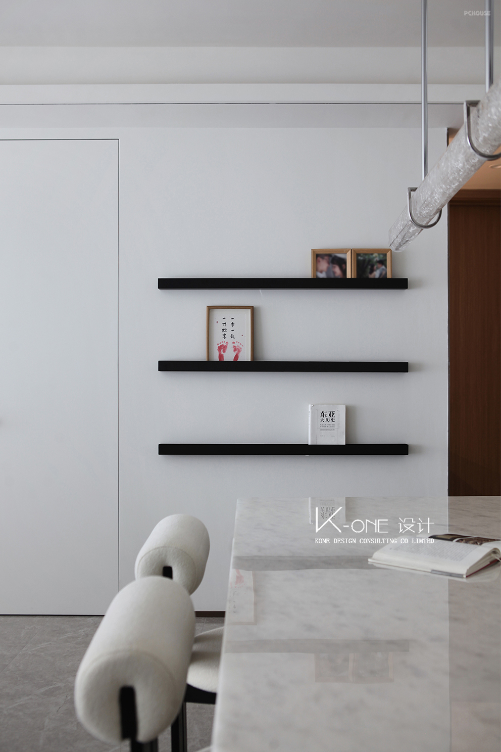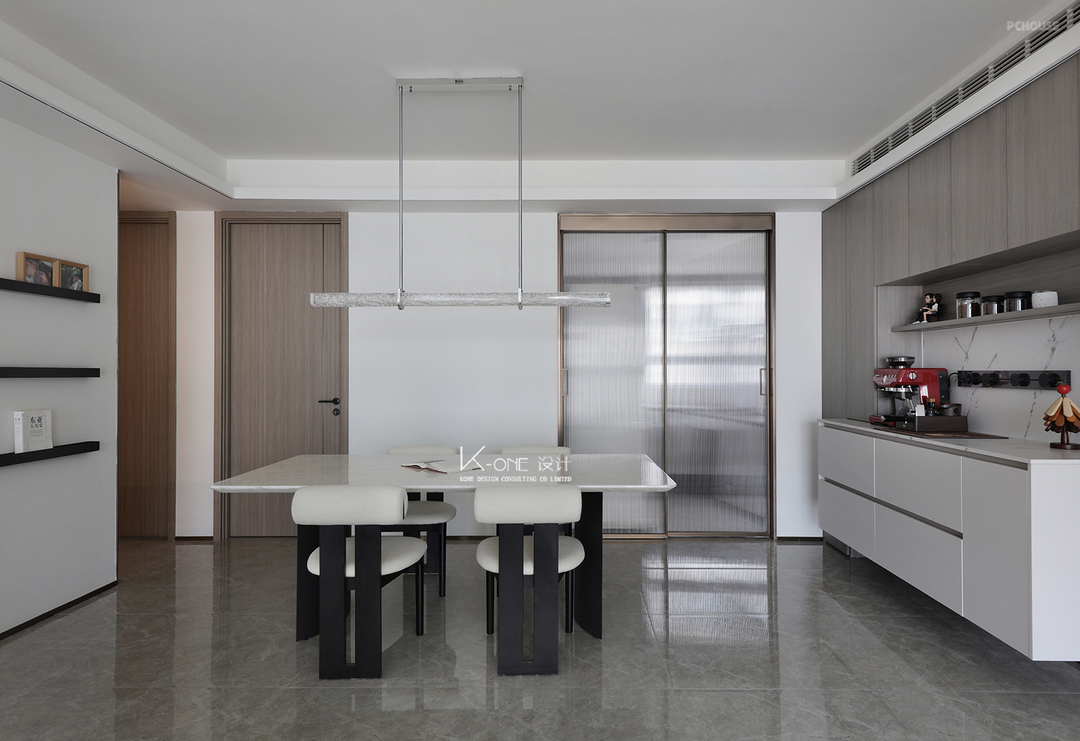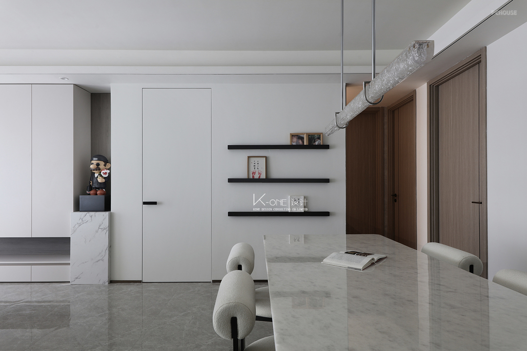 大理石边几上摆着精致的装饰品。餐厅区域,岩板餐桌搭配弧形靠背椅,长条吊灯垂落,墙面的黑色置物架上点缀着画框与小物件。营造雅致的居住氛围。