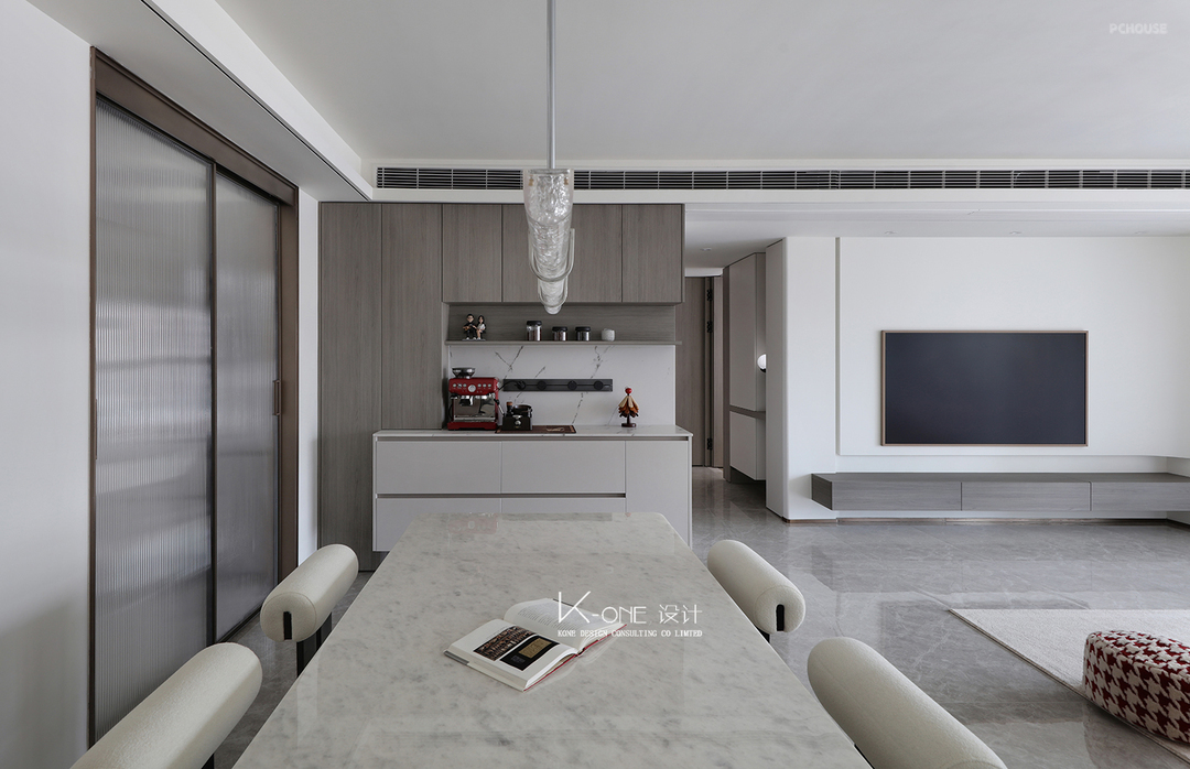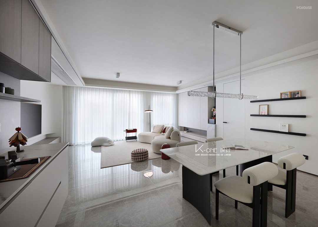 客厅与餐厅一体化空间,纯白的色调,像未染尘埃的云。一切是最初的样子,简到只剩呼吸与光的轮廓。