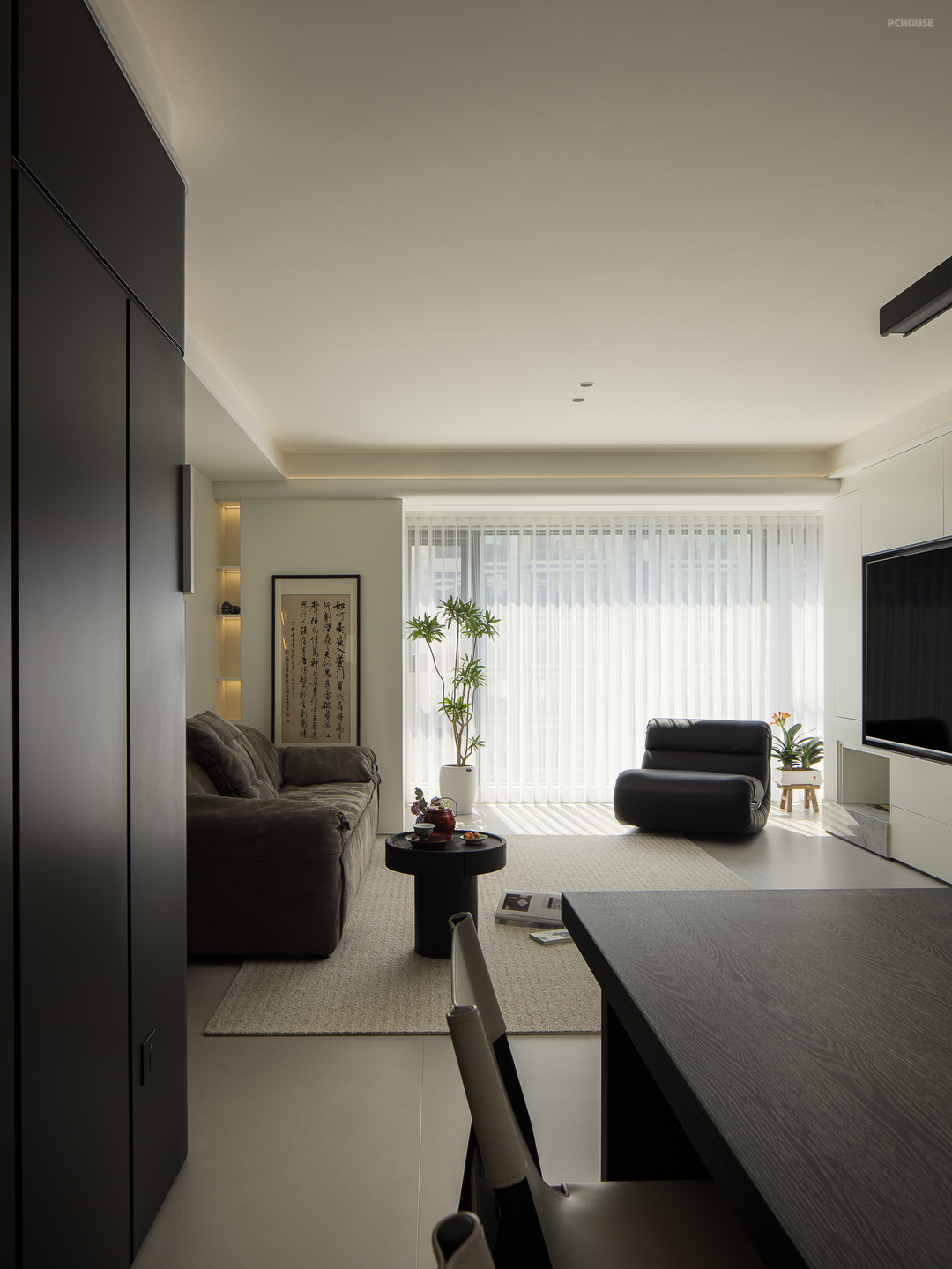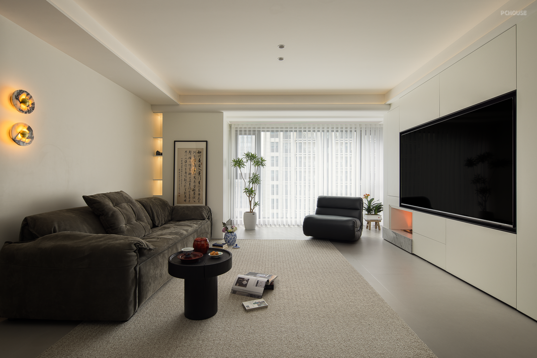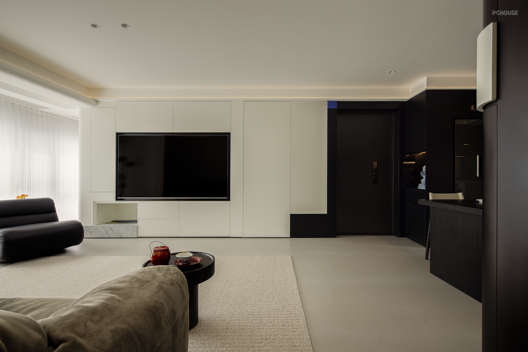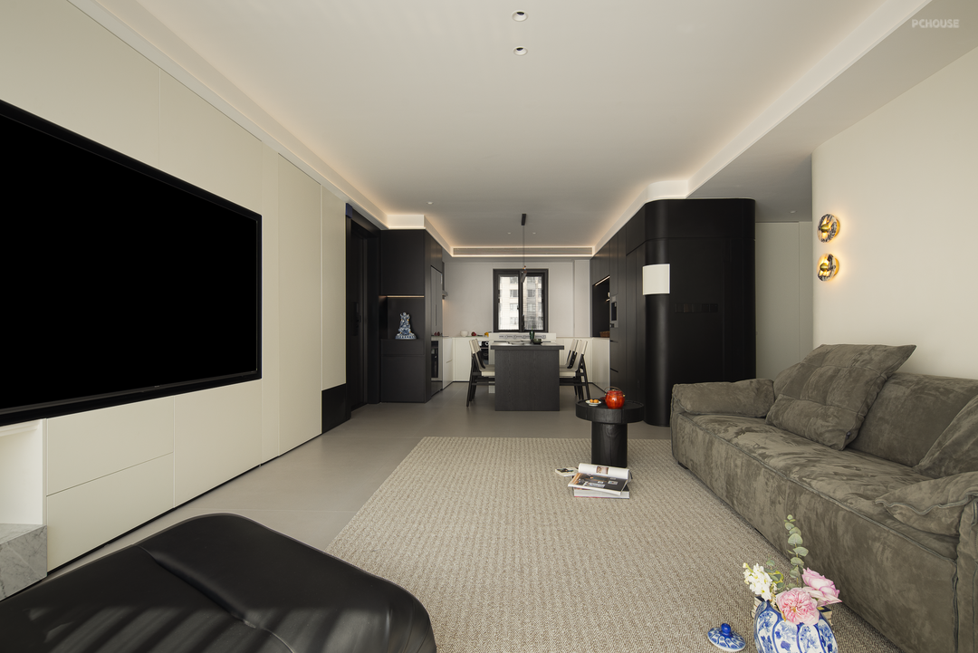 公共区采用无主灯设计,搭建流畅的一体化结构,以此修饰层高。设计在生活功能的考量中,布局了高效的收纳体系:电视机柜、餐边柜、转角柜体互相搭配,将不同区域和不同类型的生活用品进行便捷归类,保障公共区干净整洁。