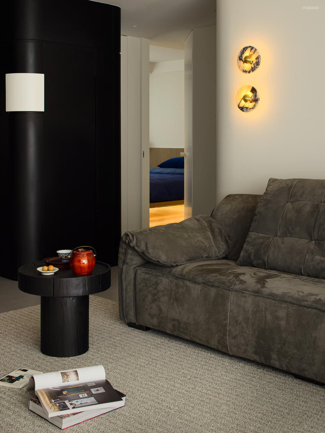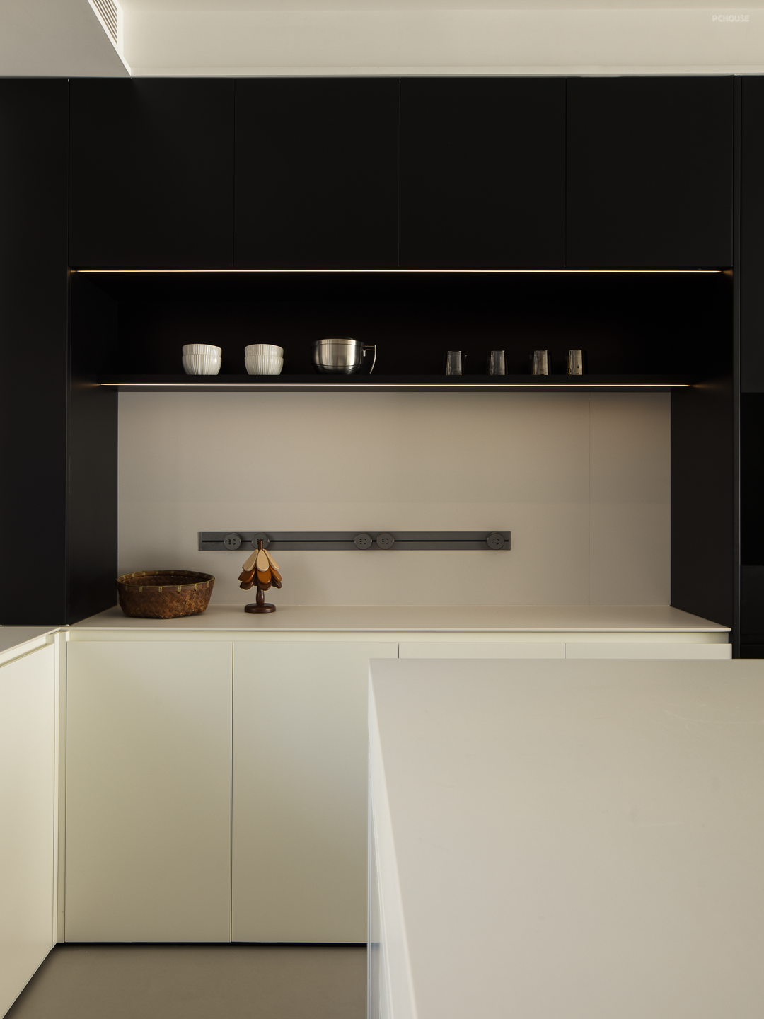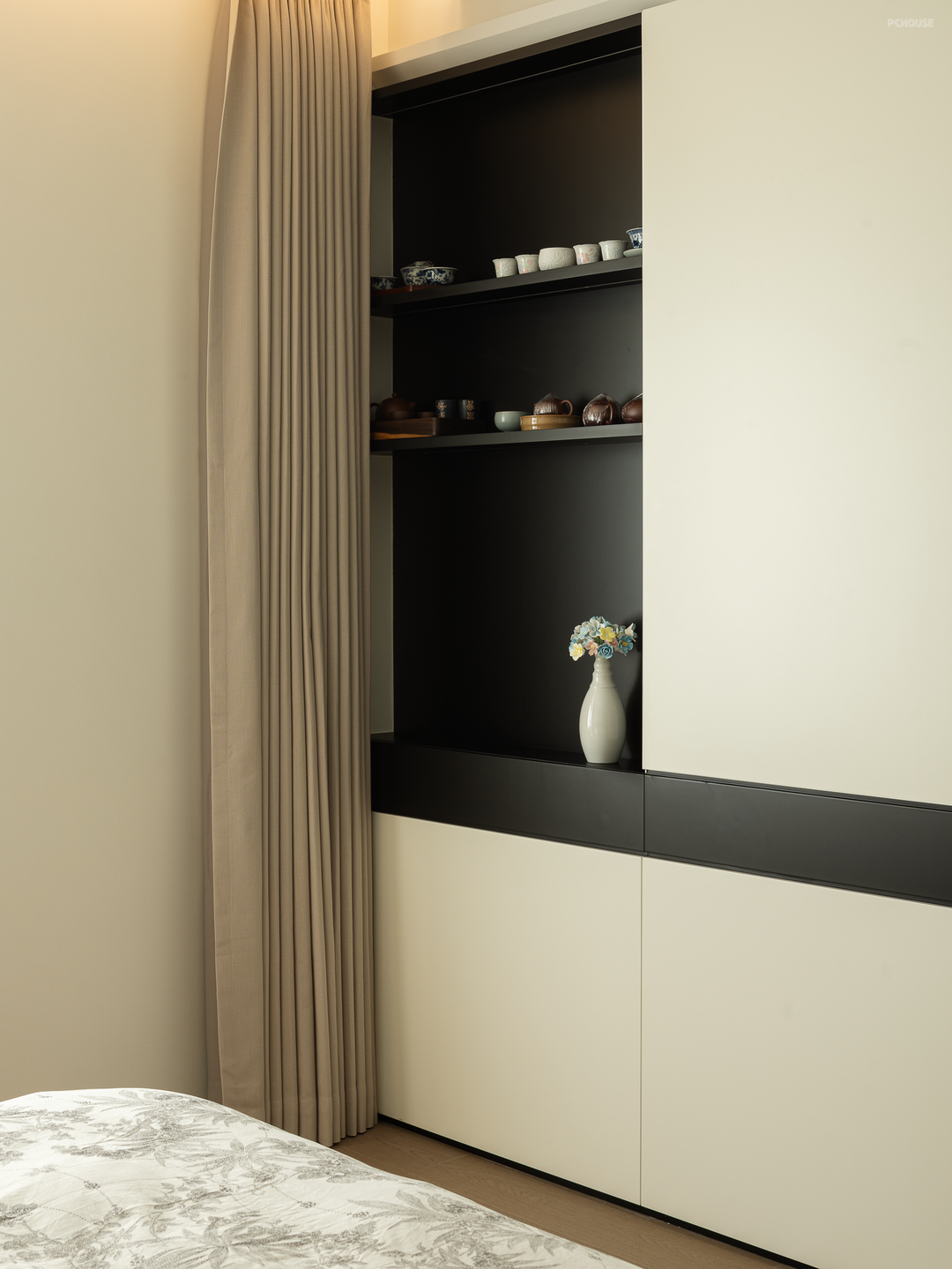 过道的转角处,巧妙设置了一个「黑色盒子」,作为日常生活的辅助收纳,同时牵引场景过渡,功能与美学一举两得。