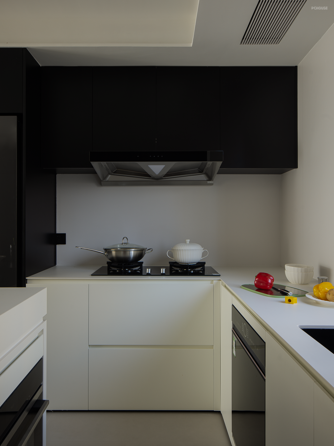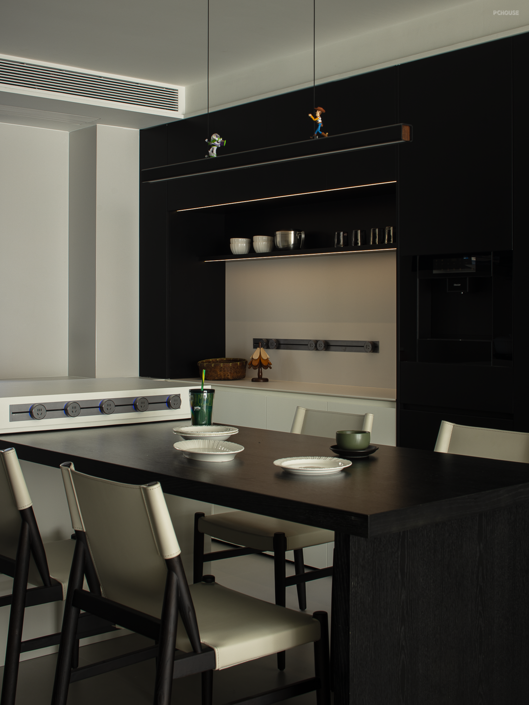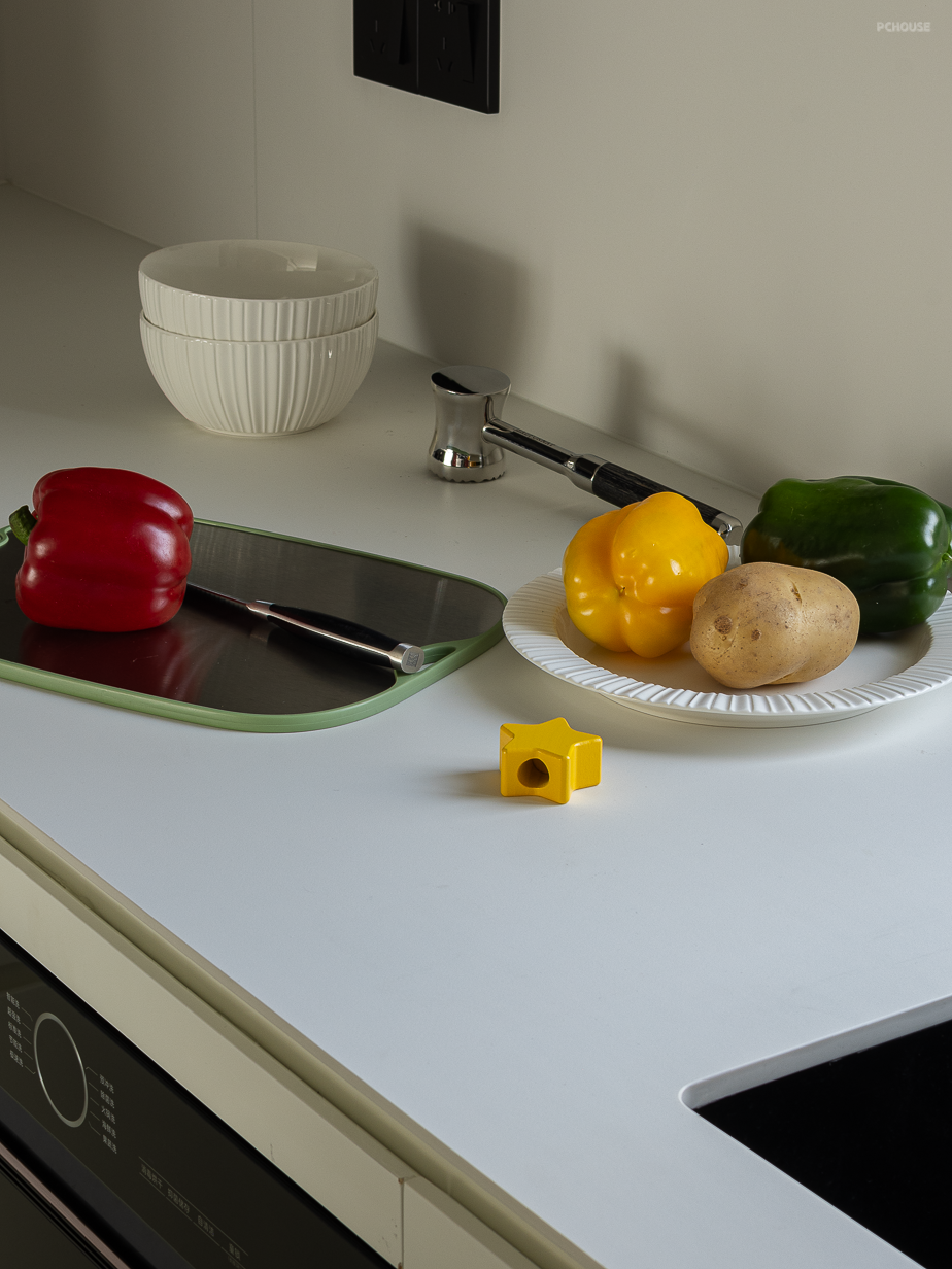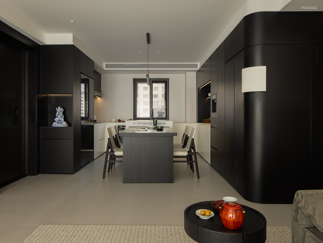 厨房调度过道的比例关系,在岛台嵌入烤箱,搭配餐边柜的吧台使用,延伸了中西厨的功能应用。家人们一起制作料理,深入日常与三餐四季,细细品味这场可持续的生活品质。