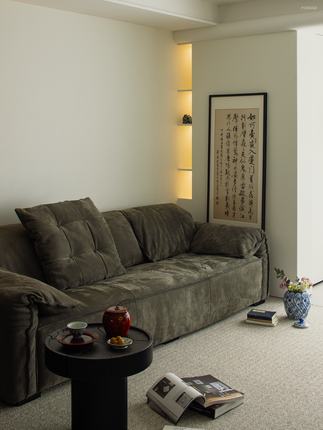业主喜欢将收藏的字画、器皿、插花作为装饰品,安置在家的各个角落,营造专属的气质氛围。在某个闲暇的午后,安静地坐在沙发前阅读、喝茶,独享宁静时刻。