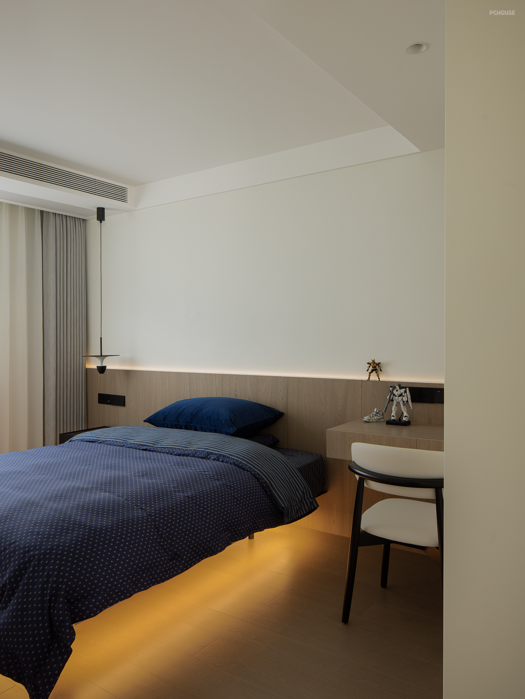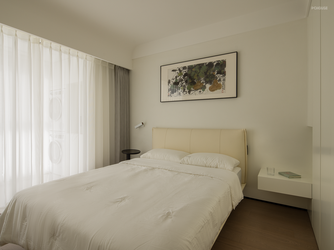 次卧采用低饱和的空间氛围,关照收纳、睡眠、精神的多元化需求,将生活功能与情绪感官结合,通过大量留白填充内心更细腻的情感,缓缓落入内心一角,回归舒适的居住体验。