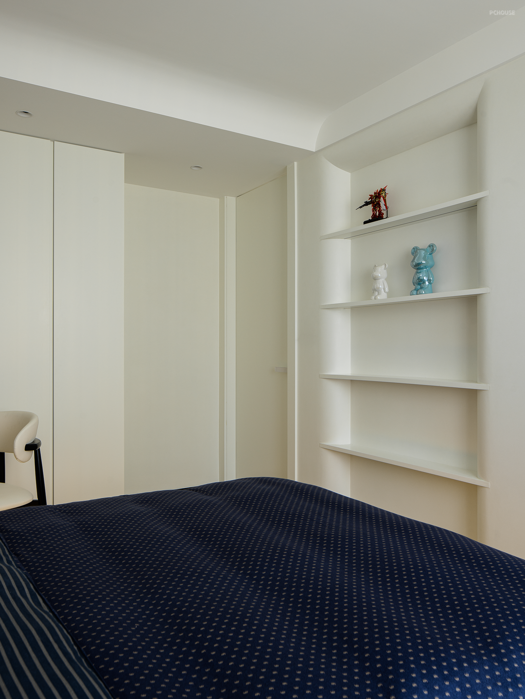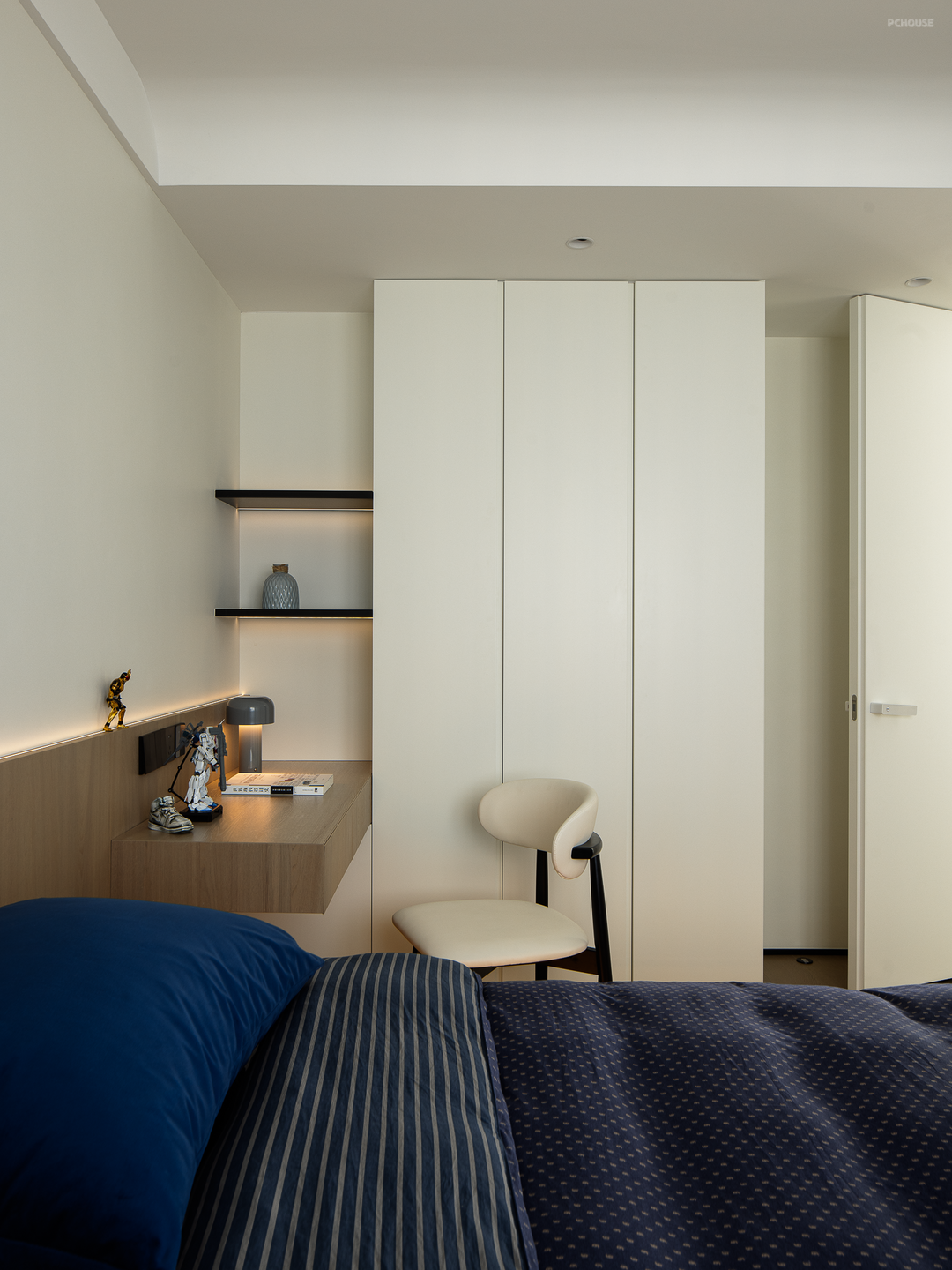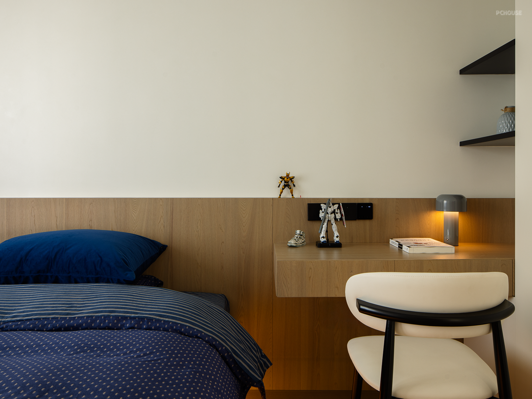 男孩房原来的独立阳台归入室内,腾出更多空间布局书桌和衣柜,全方面考虑了当下和未来的成长需求。床的对面设置了陈列架,可以摆放孩子喜爱的手办、玩具等,呵护关照其内心世界。