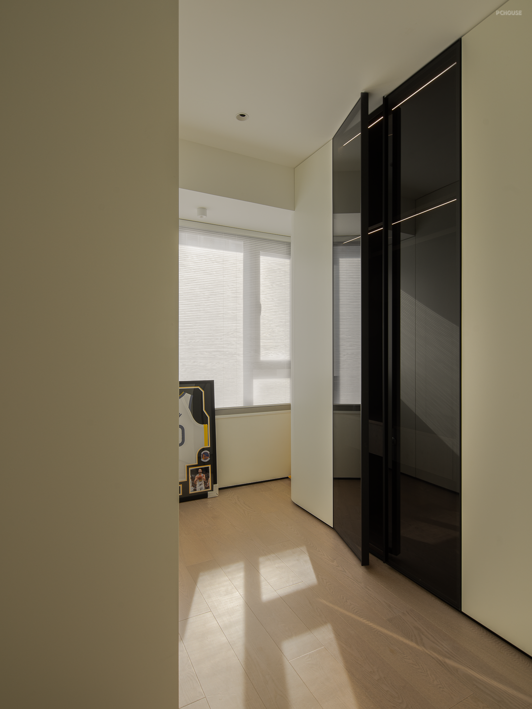 衣帽间根据衣物的类别、长度、季节等进行分类,优化组合不同储藏形式。南面的采光减少空间的沉闷感,释放明亮与灵动。