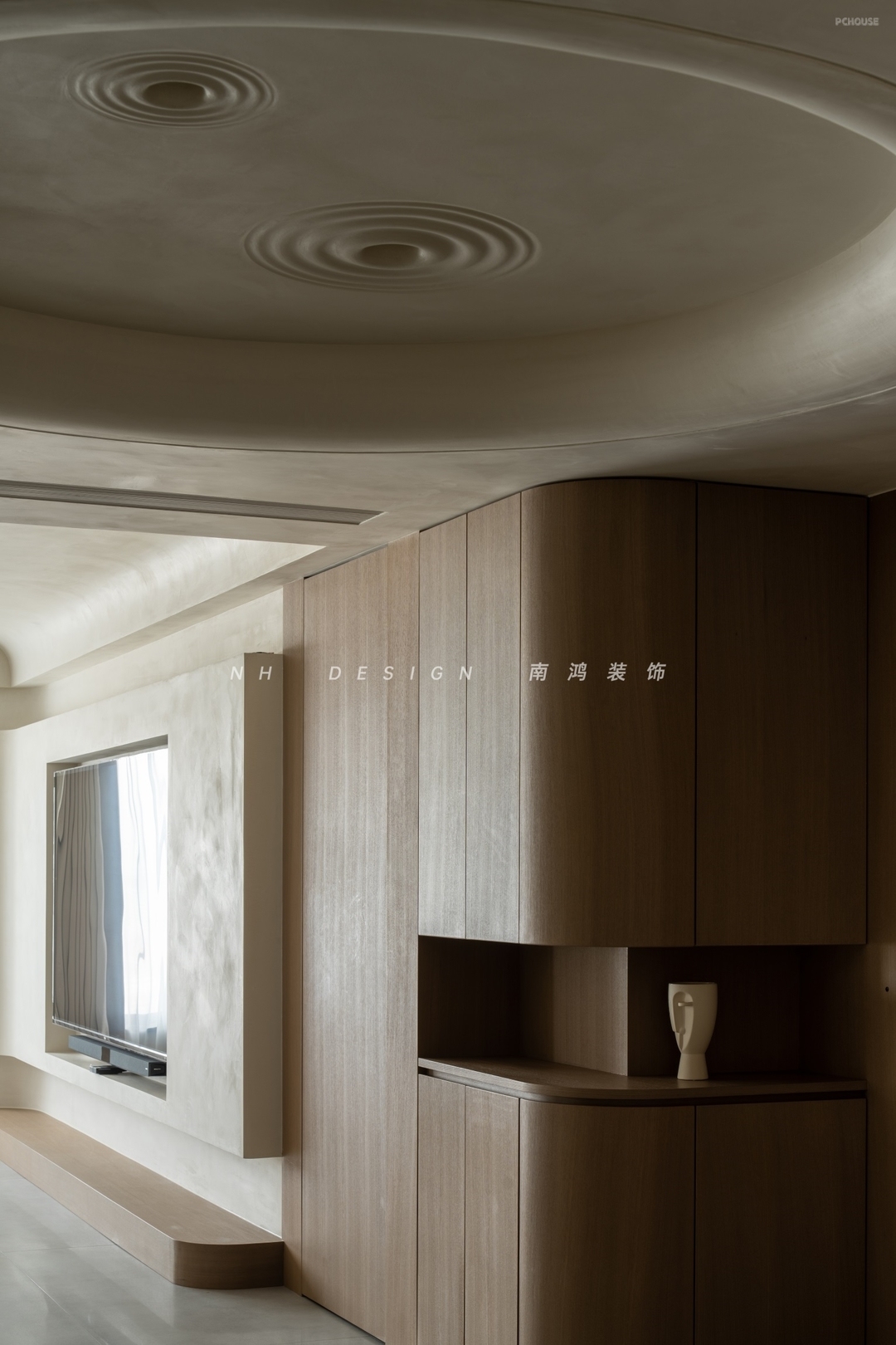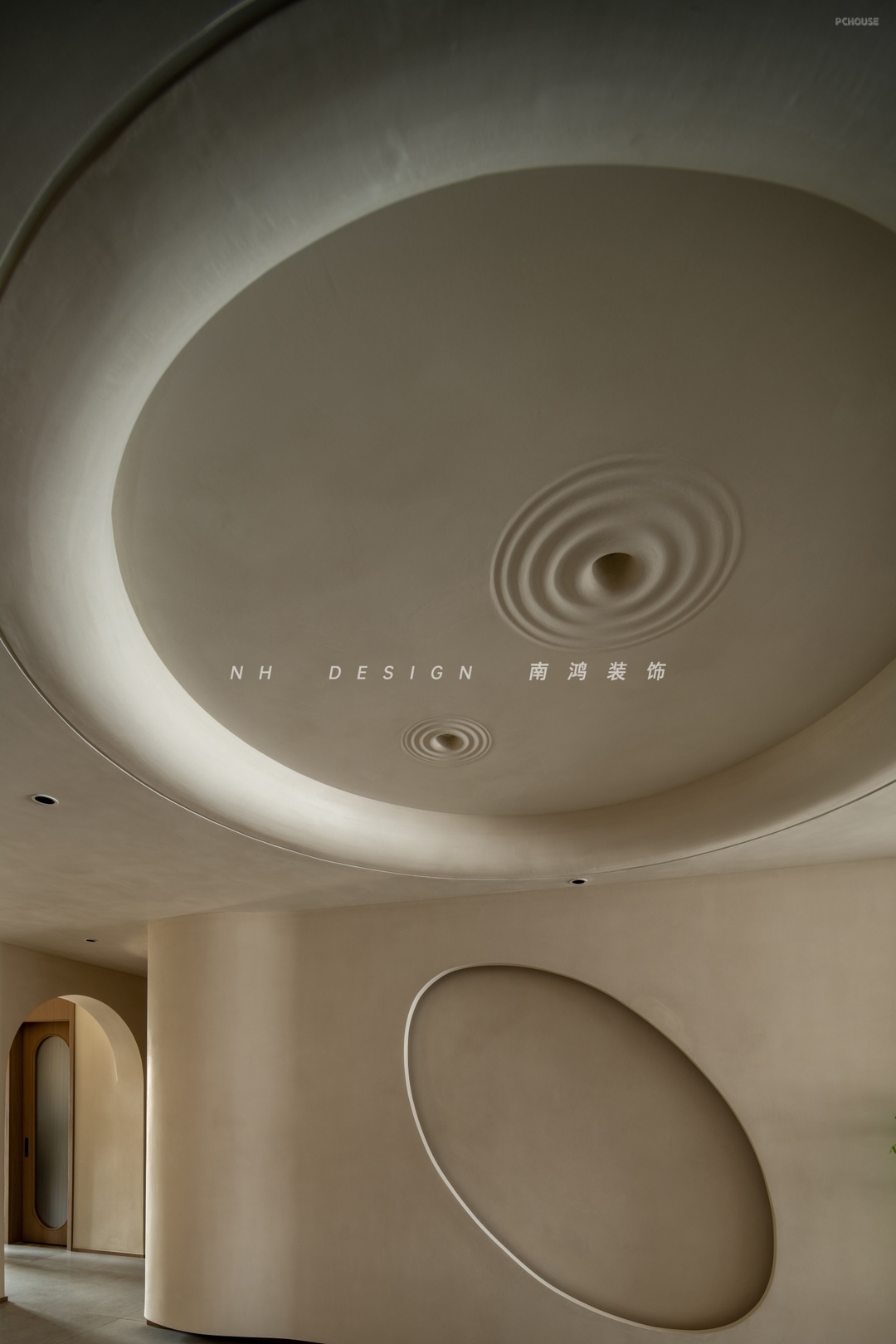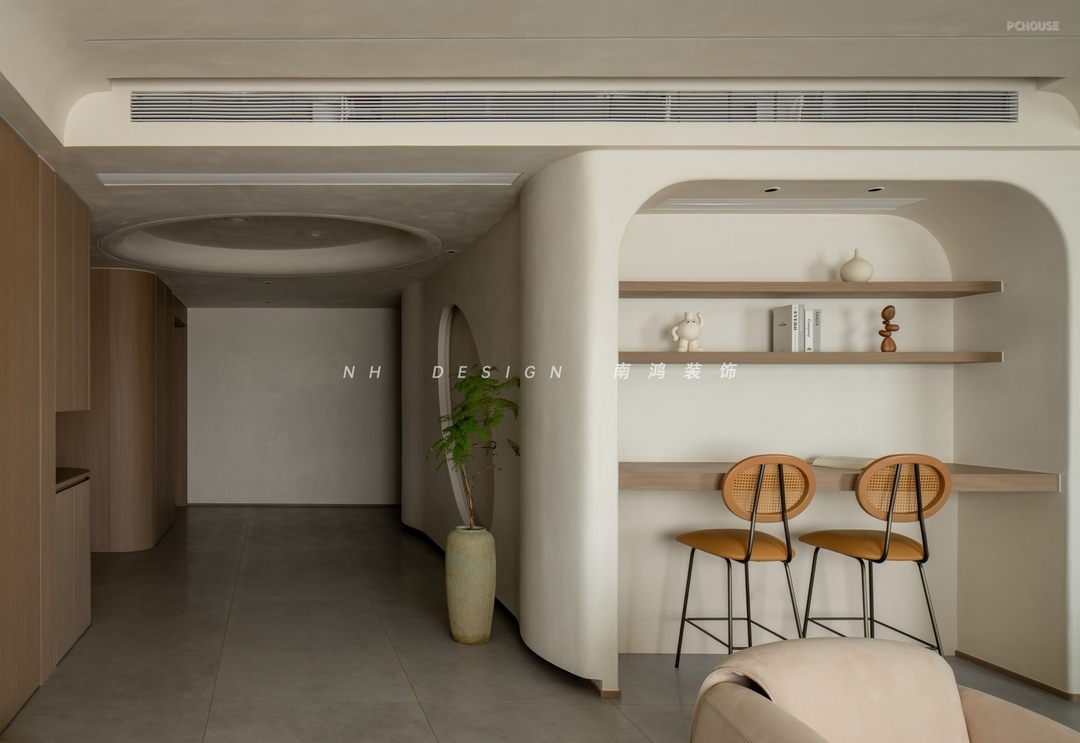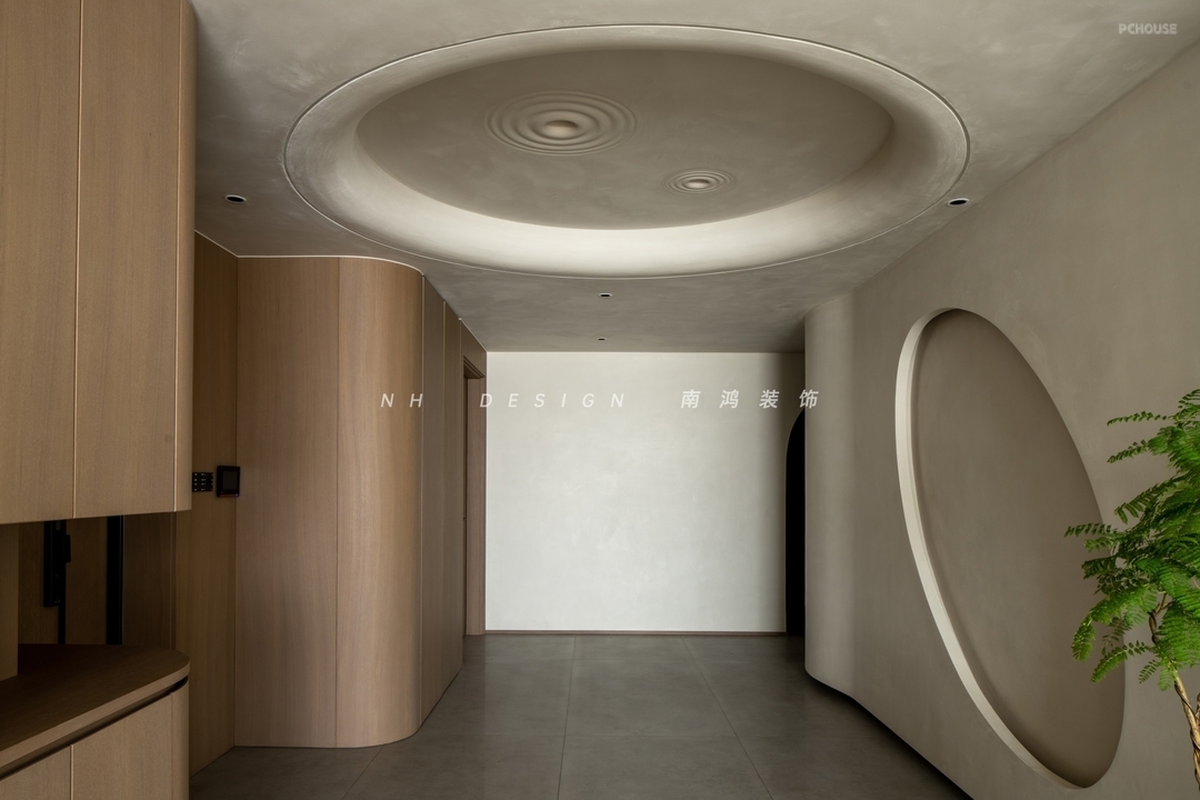 玄关空间顶部的月坑艺术装置,与墙面椭圆造型形成趣味的呼应,艺术漆的斑驳肌理,如同为空间蒙上了一层时光织就的薄纱,烘托出宁静质朴的家屋氛围。转角柜体利用圆弧面,将视觉温柔导向室内。