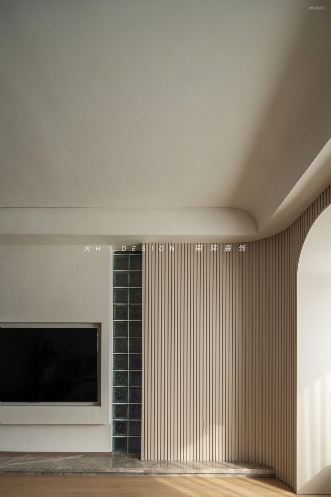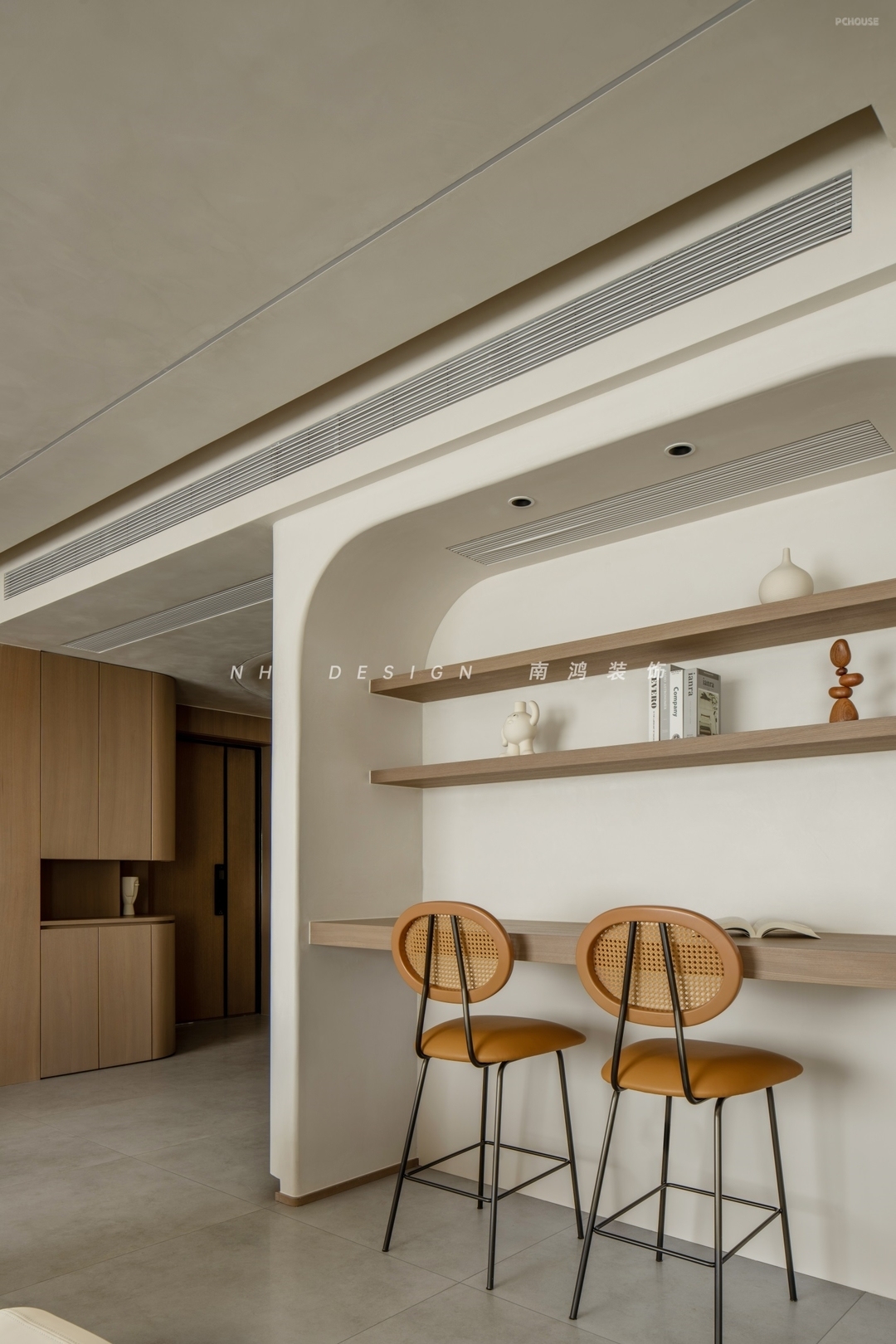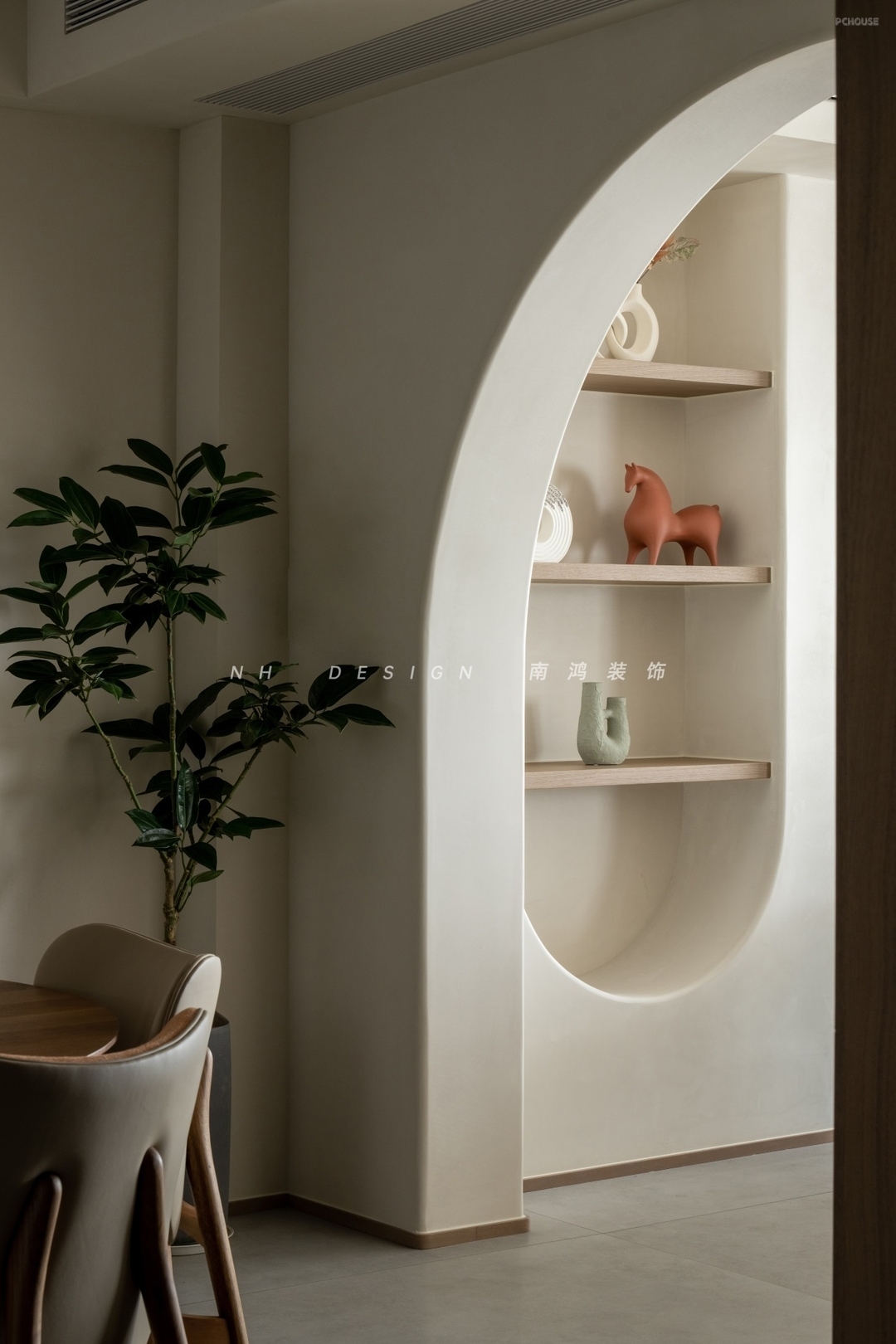 玄关空间顶部的月坑艺术装置,与墙面椭圆造型形成趣味的呼应,艺术漆的斑驳肌理,如同为空间蒙上了一层时光织就的薄纱,烘托出宁静质朴的家屋氛围。转角柜体利用圆弧面,将视觉温柔导向室内。