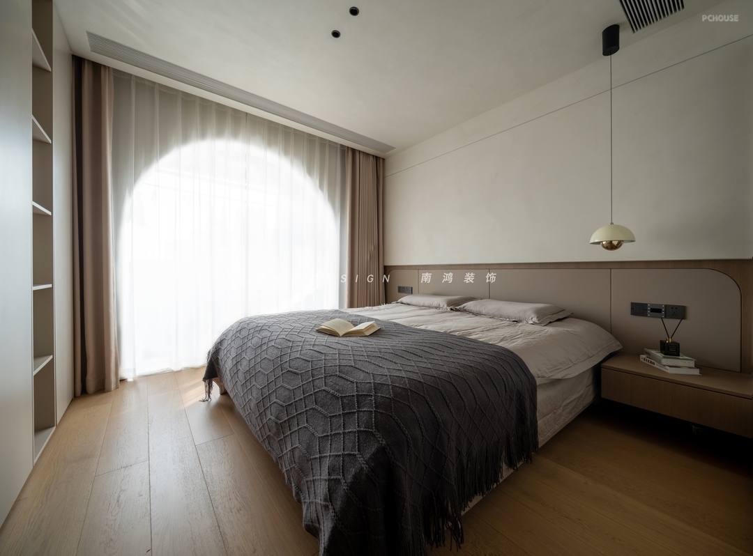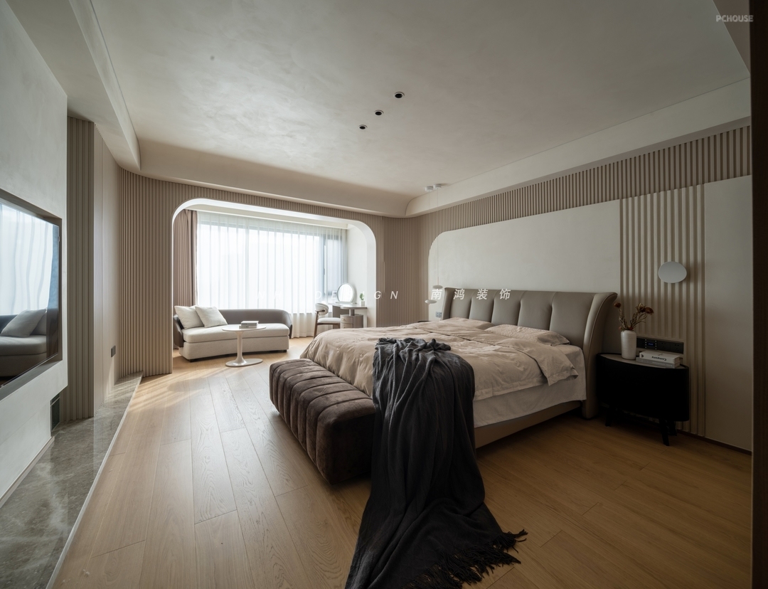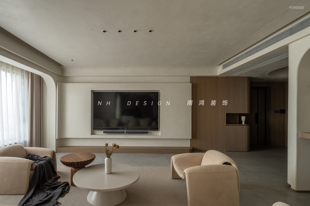 客厅铺叙侘寂风的留白哲学,悬浮式电视墙通过弧面向阳台延展,窗外的天光云影成为室内最生动的装饰。地面通铺灰系柔光砖,整体低饱和的基调呈现出时间沉淀的静谧感。