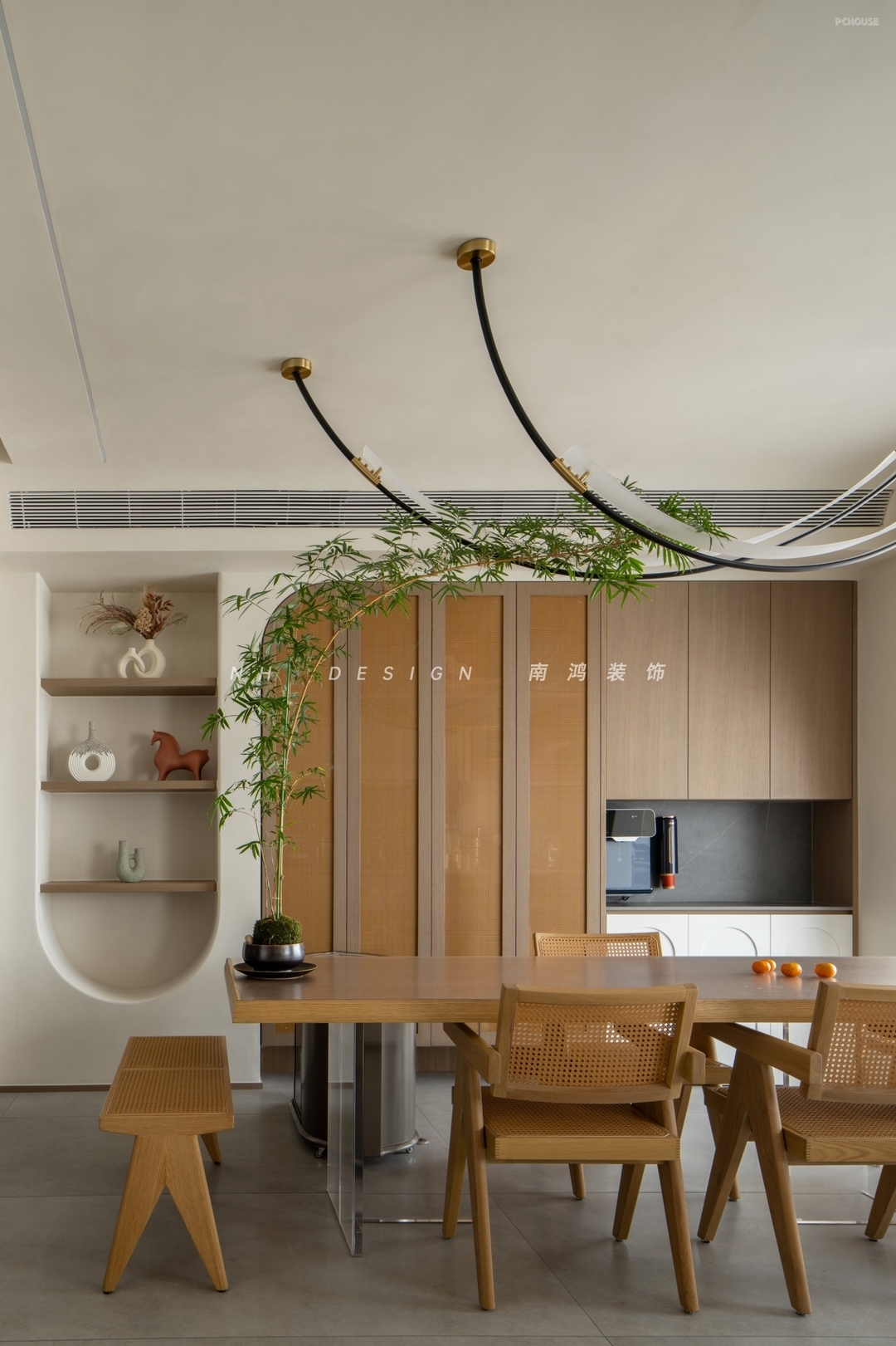 茶区选用木质与藤编元素,通过深浅色阶的叠奏、曲直线条的对话,以及壁龛设计,构建出富有呼吸感的侘寂美学层次。顶面选配带着流线弧度的艺术吊灯,塑造出优雅别致的图景。