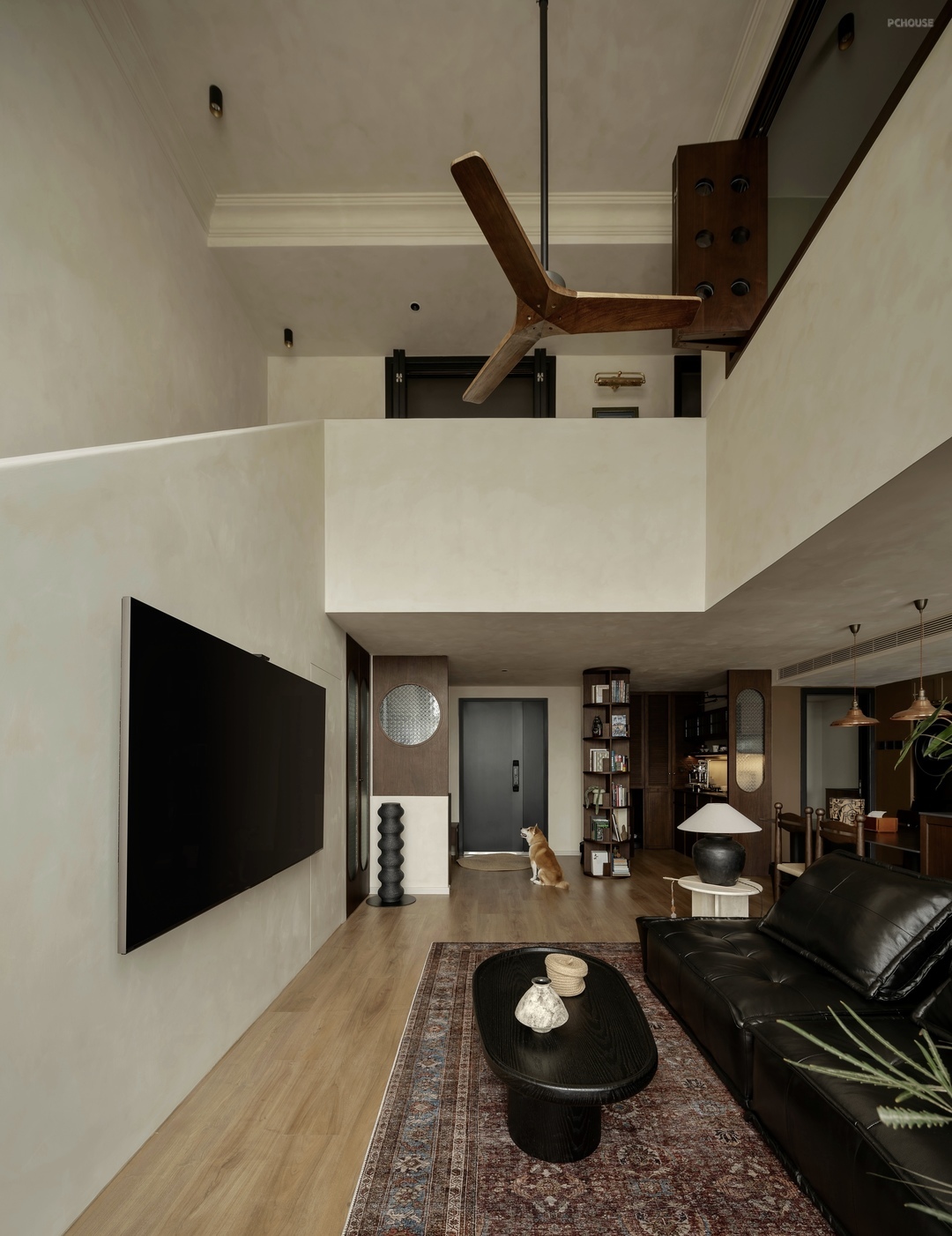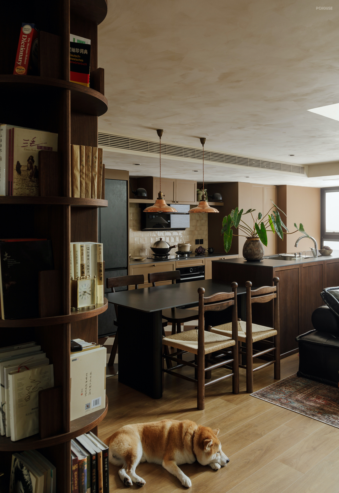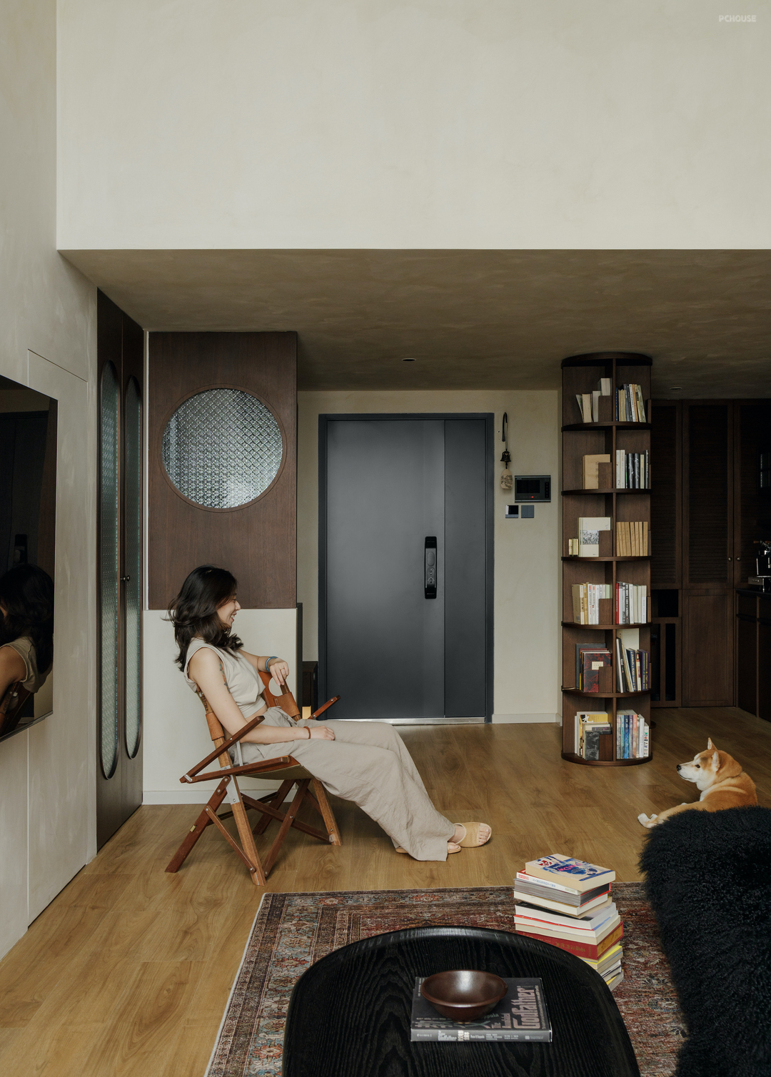 360度开放的书架,不仅刚好遮挡了入户视线,保护了业主隐私,更发挥了强大的储物功能,容纳了近300本书,为来访客人提供了很好的话题.