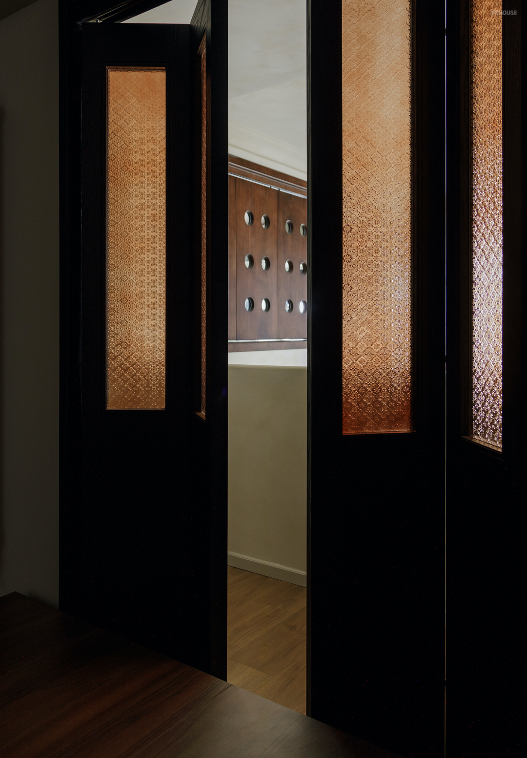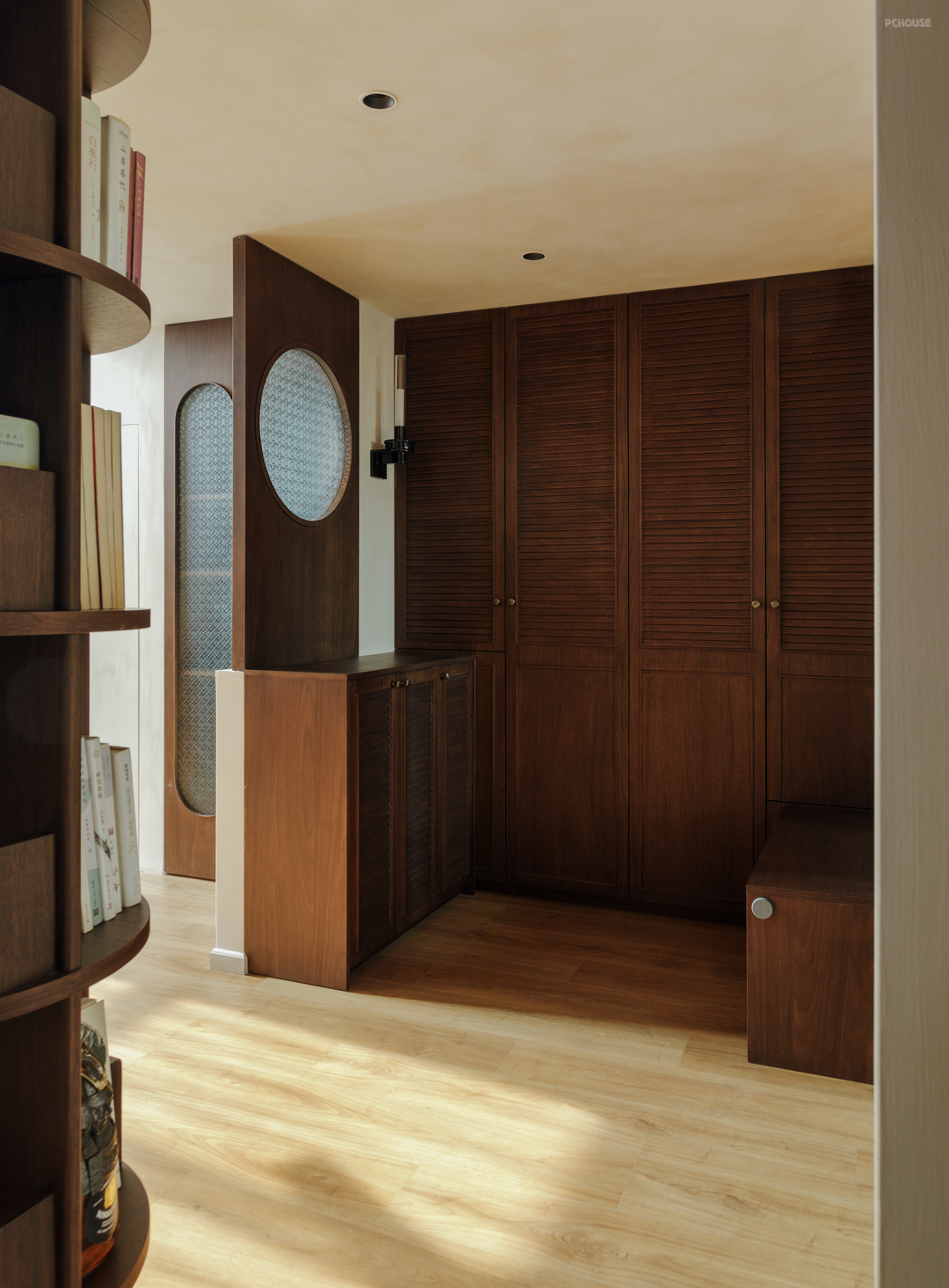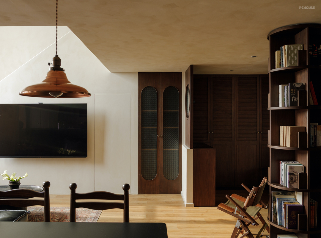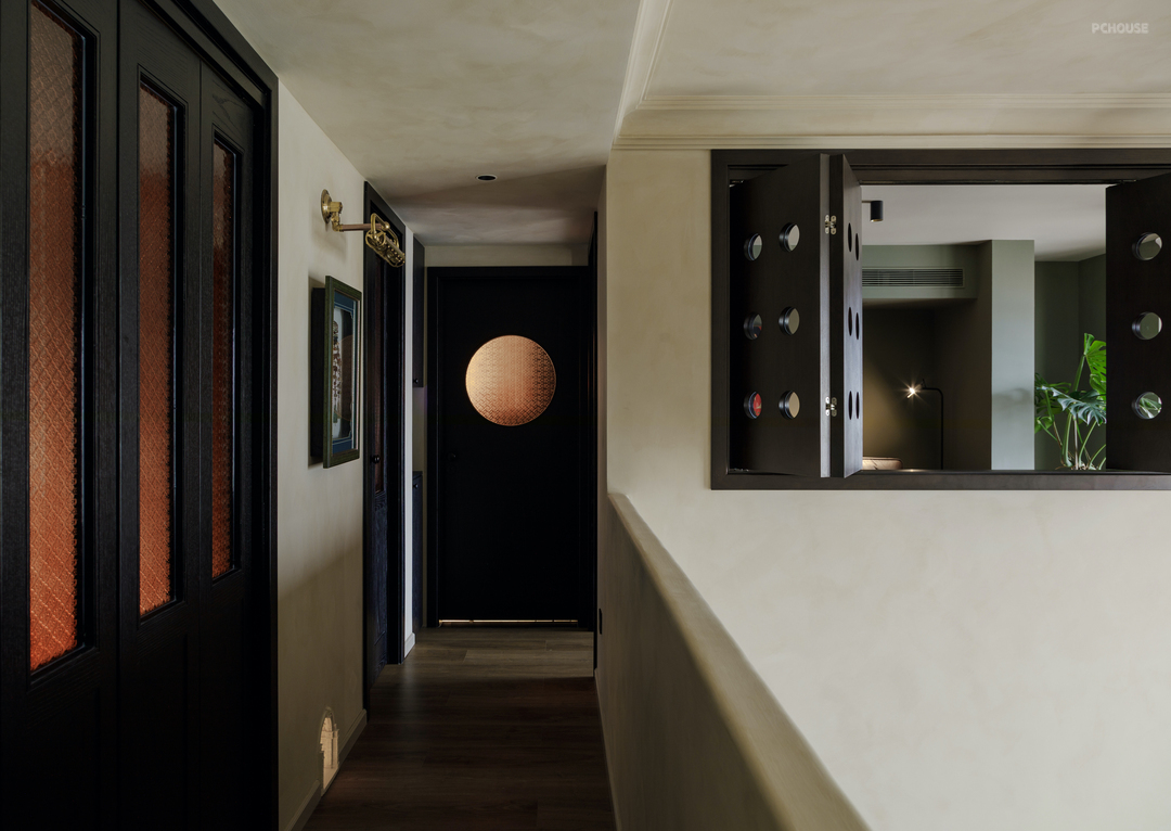 温润的质感和胶片般的配色在这里由一扇扇各不相同的门窗延续. 棕色的海棠花玻折门透出卧室的暖光,利落的圆点折窗反射着书房的沉静.