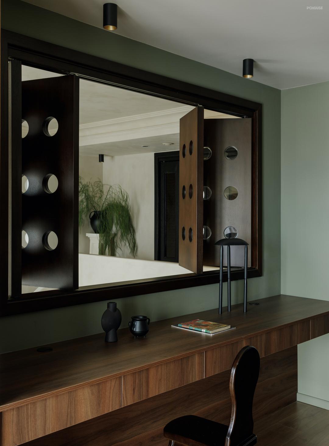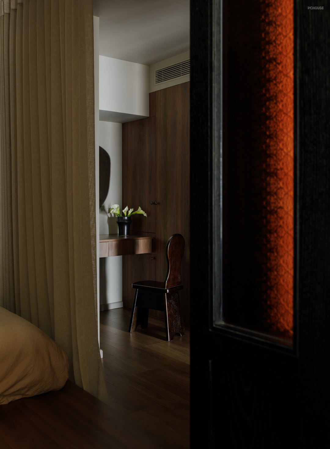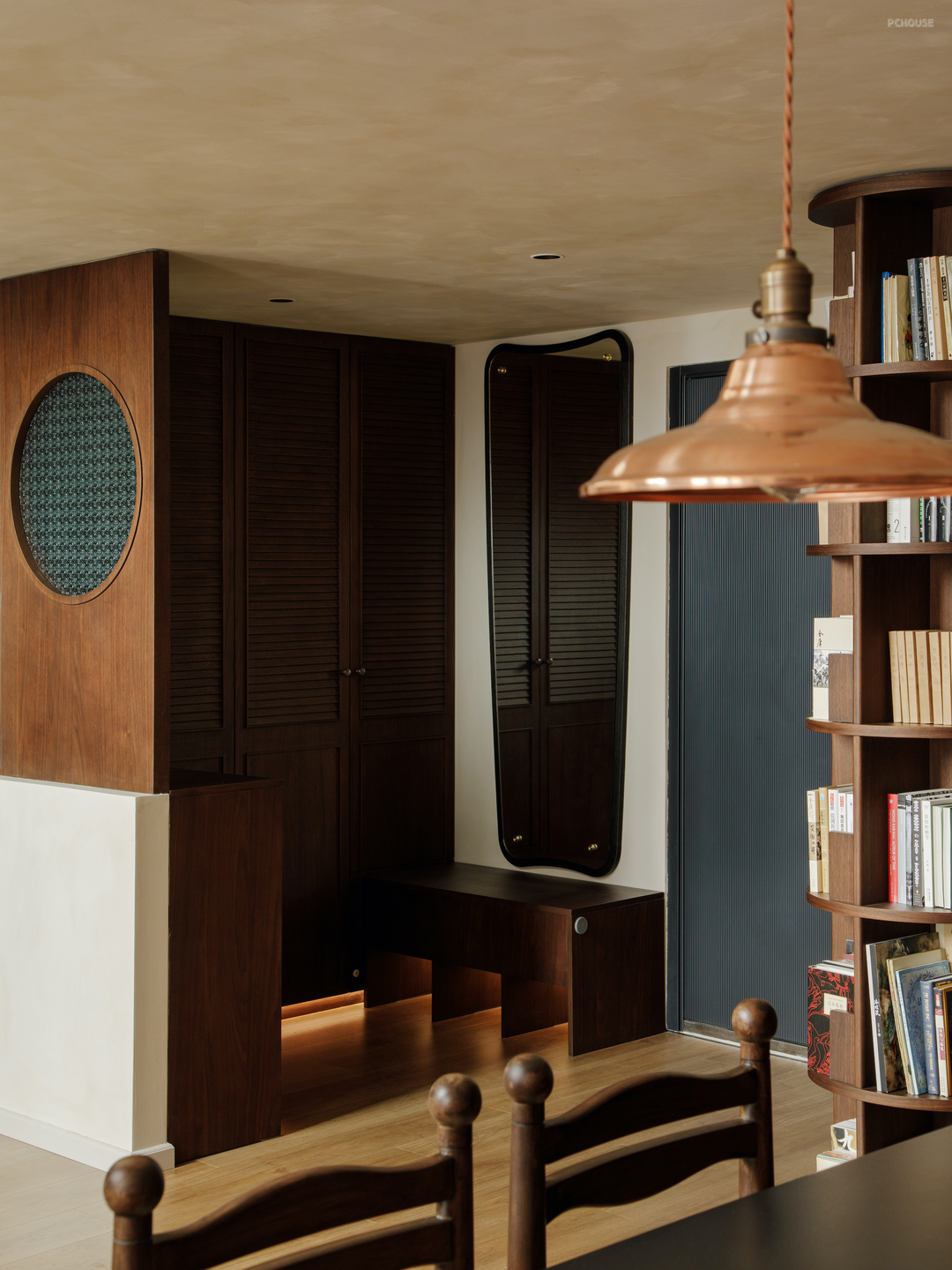 温润的质感和胶片般的配色在这里由一扇扇各不相同的门窗延续. 棕色的海棠花玻折门透出卧室的暖光,利落的圆点折窗反射着书房的沉静.