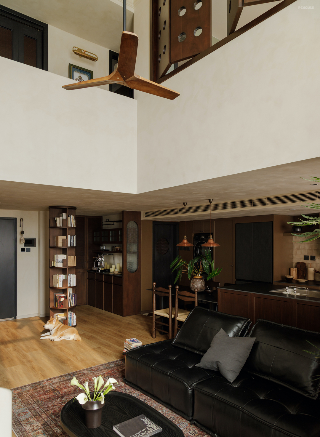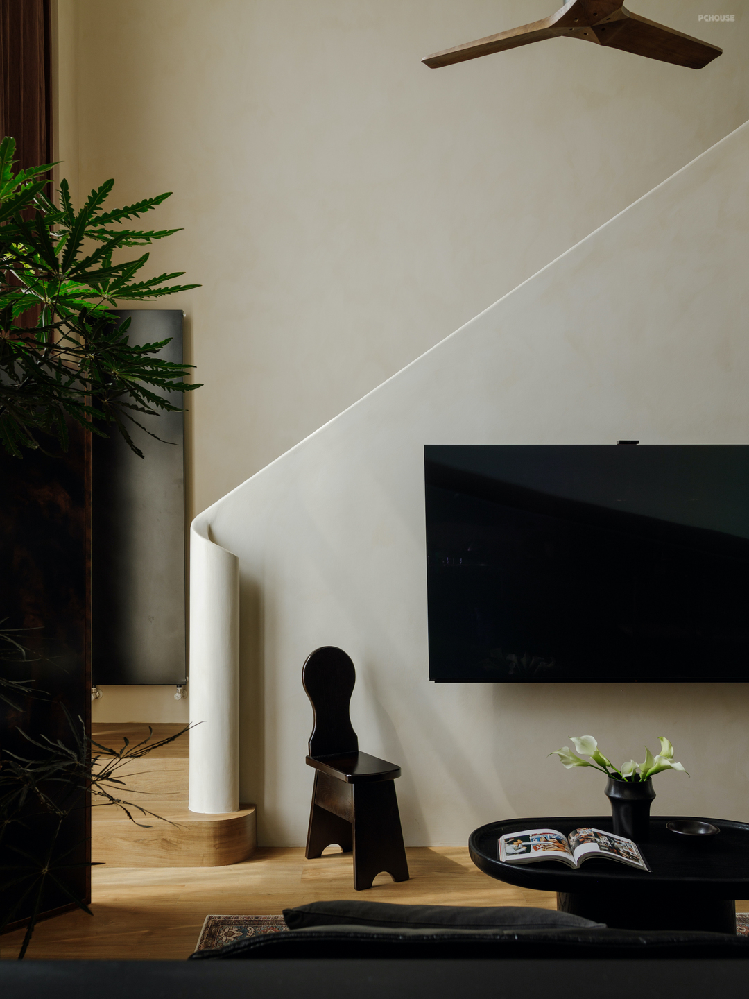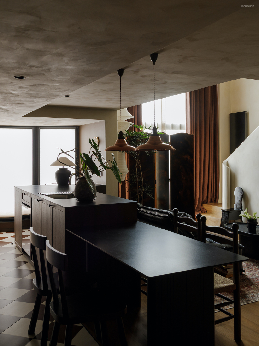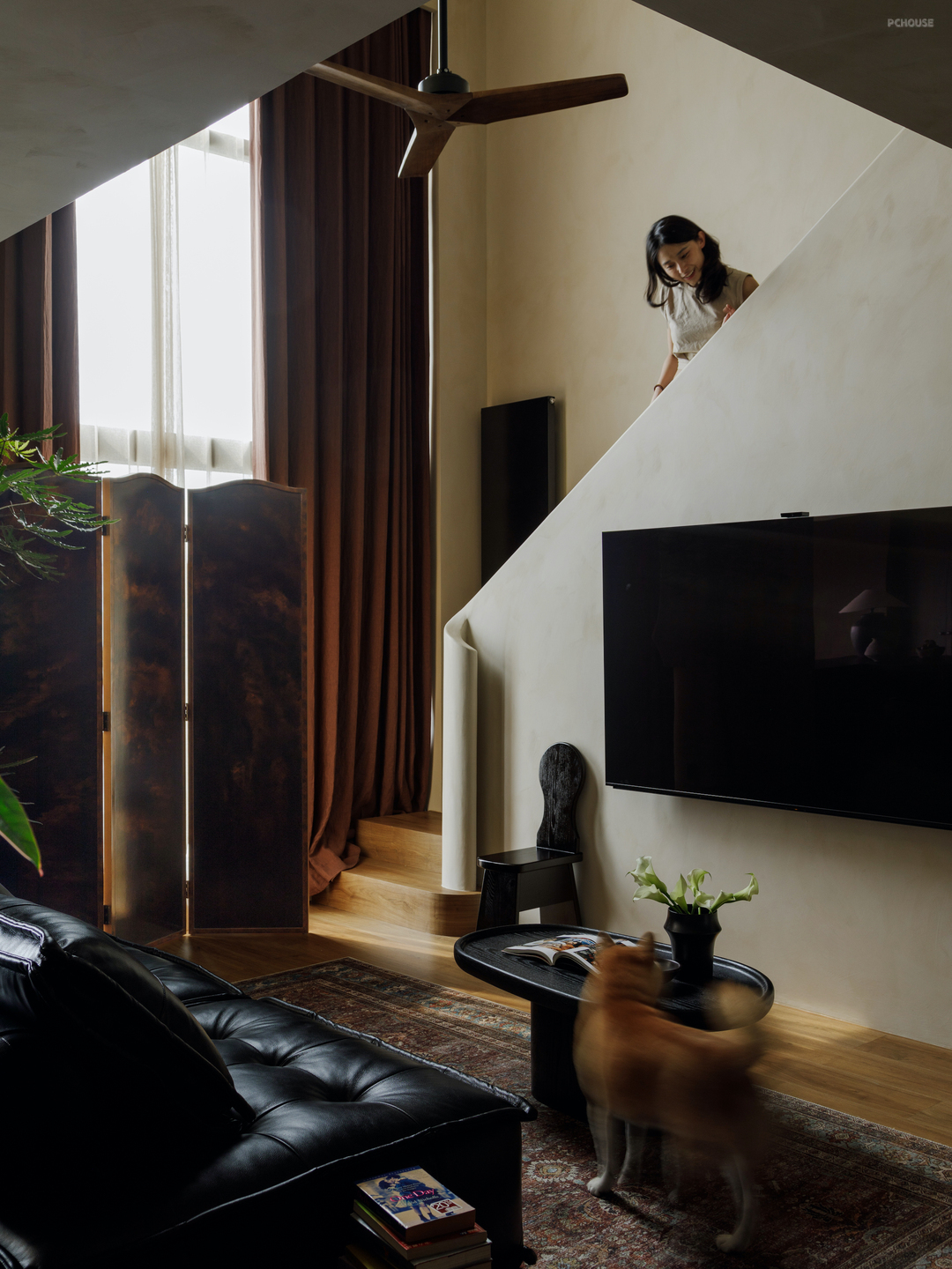 这套房屋的业主夫妇从事影视及广告行业,初次沟通时,他们提到希望自己的家可以有电影般的质感. 多次讨论后我们共同决定,用类似胶片的颜色,造一栋拥有电影底色的家.于是在暖灰色笔触的画布上,采用温润的胡桃木和复古棕色搭出框架,黑色岩板、木纹、皮质,暗红色亚麻、羊毛,鲜活的绿植填充色彩,一个温暖、怀旧、有故事感、电影场景般的家落成.