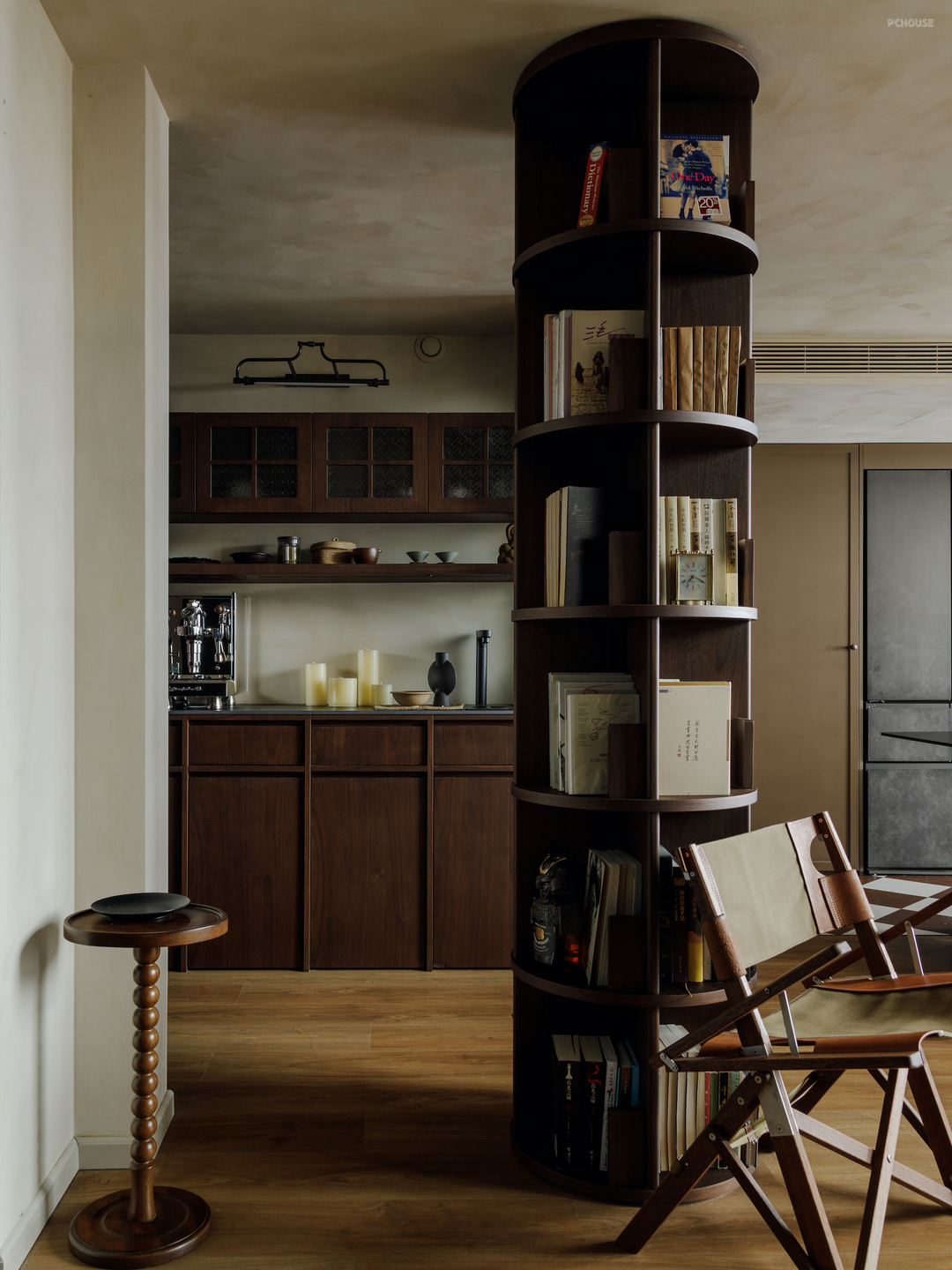 进门的左手边,原本的计划是做一根装饰柱. 在跟业主讨论方案时,女业主提出希望预留更多图书收纳的空间,我们灵光一现将这里改为一根柱形书架.