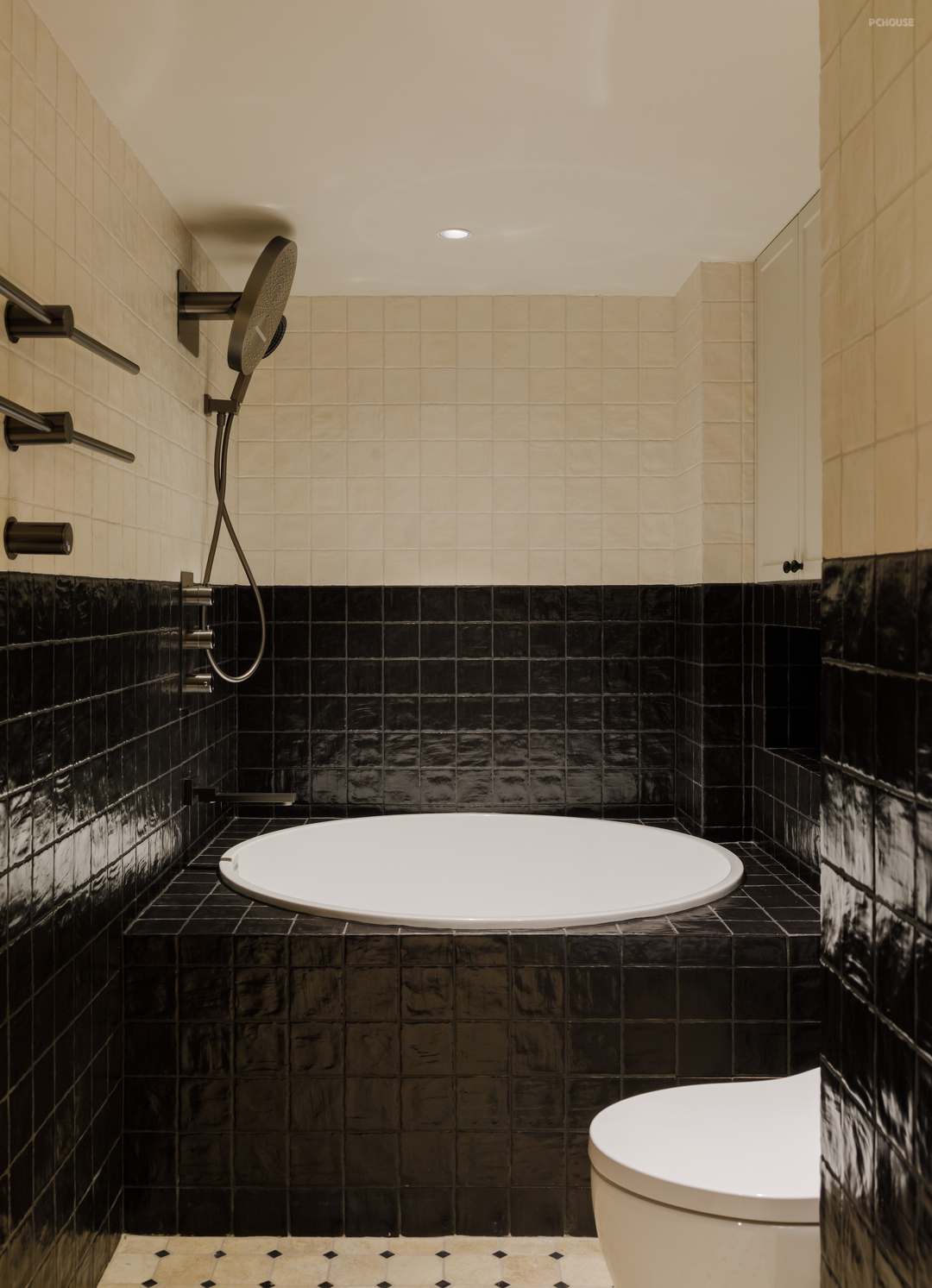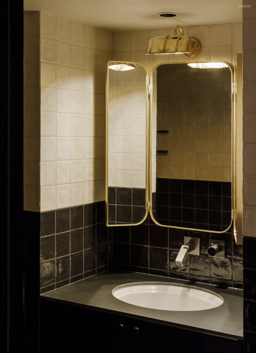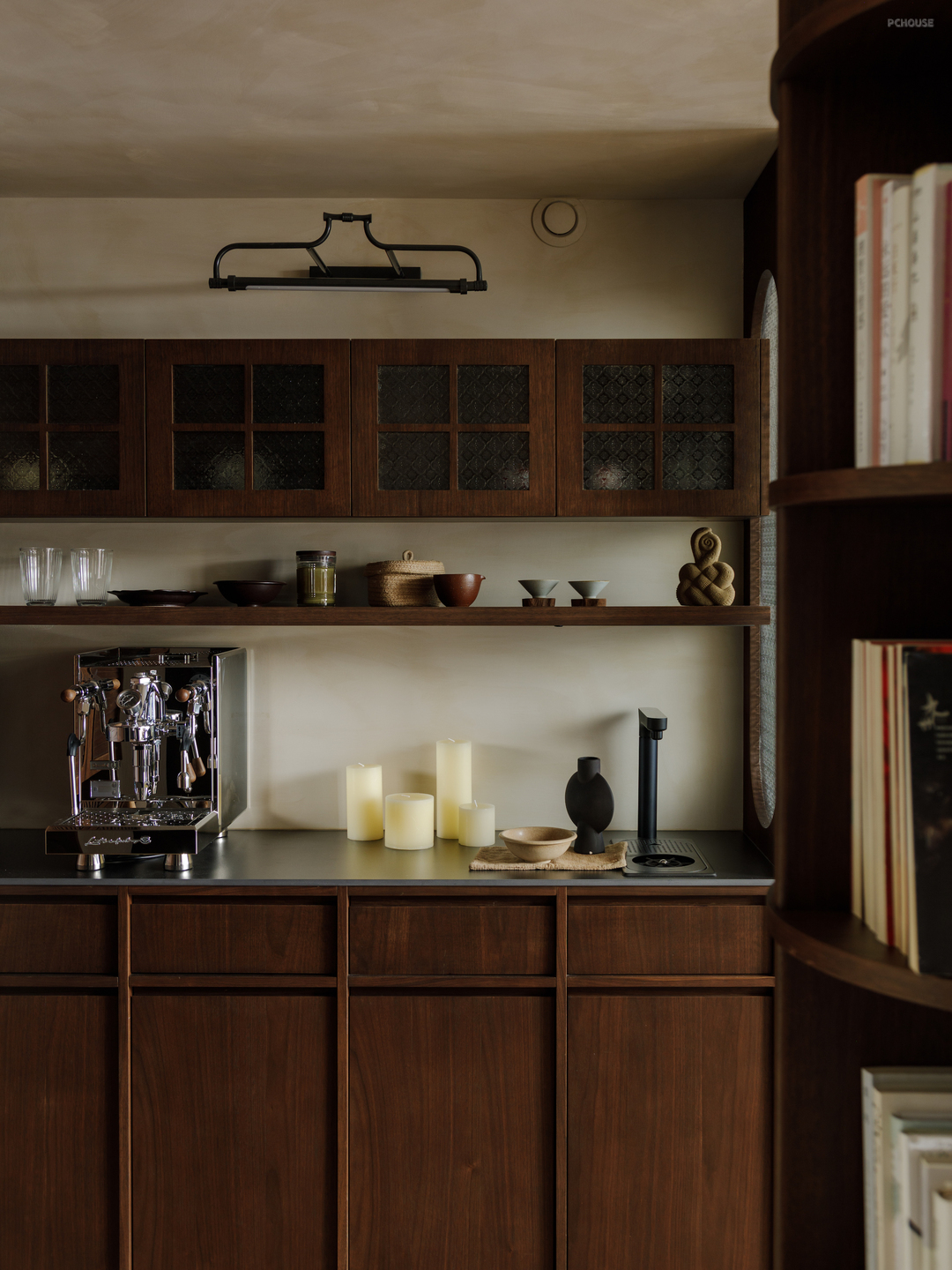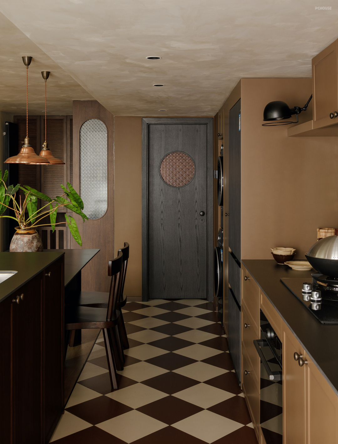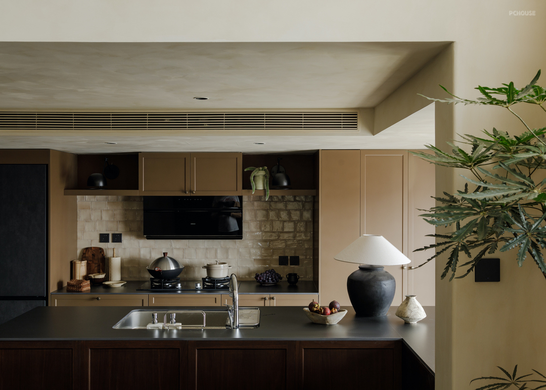 柔光棕色的橱柜框出油画一样的进口釉面小砖,电影般的场景继续在厨房上演. 两侧黑色的铁艺壁灯精准照亮操作台的同时,让灶台边的美味香气也打上了一圈复古的“轮廓光”.