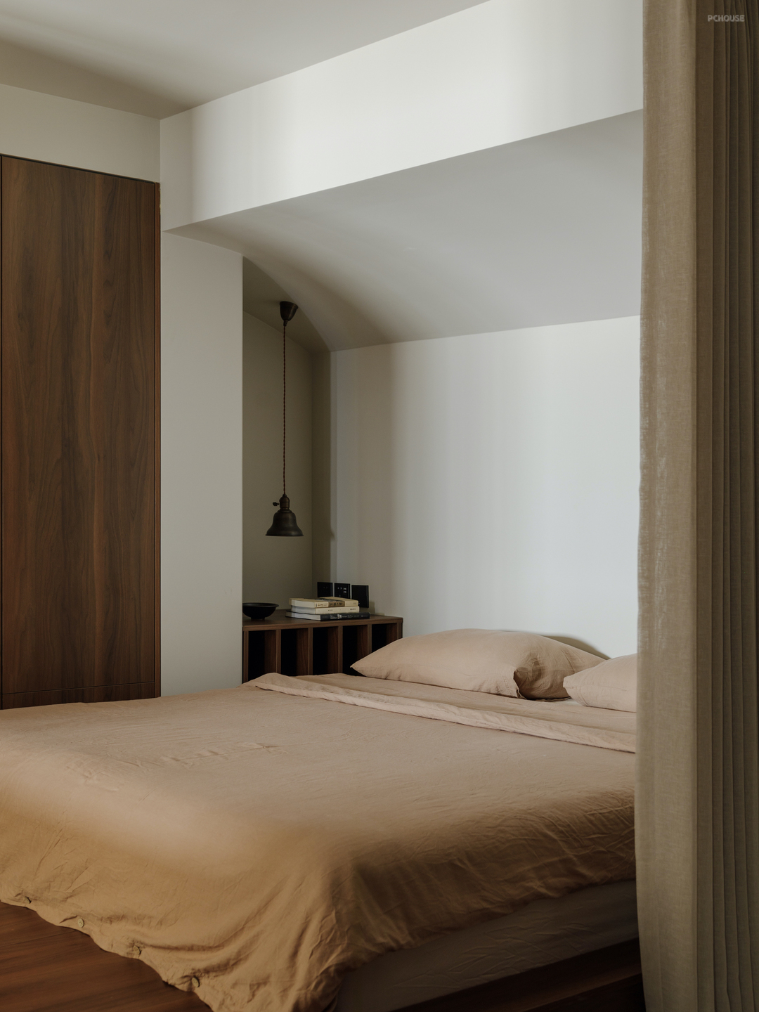 原结构上,二楼次卧有一扇无法打掉的壁橱,我们突发奇想将这里改造为地台床. 增加更多储物空间的同时,两侧刚好放入定制床头柜,再嵌入一张智能床垫,一个安全感爆棚的好眠小窝完成.