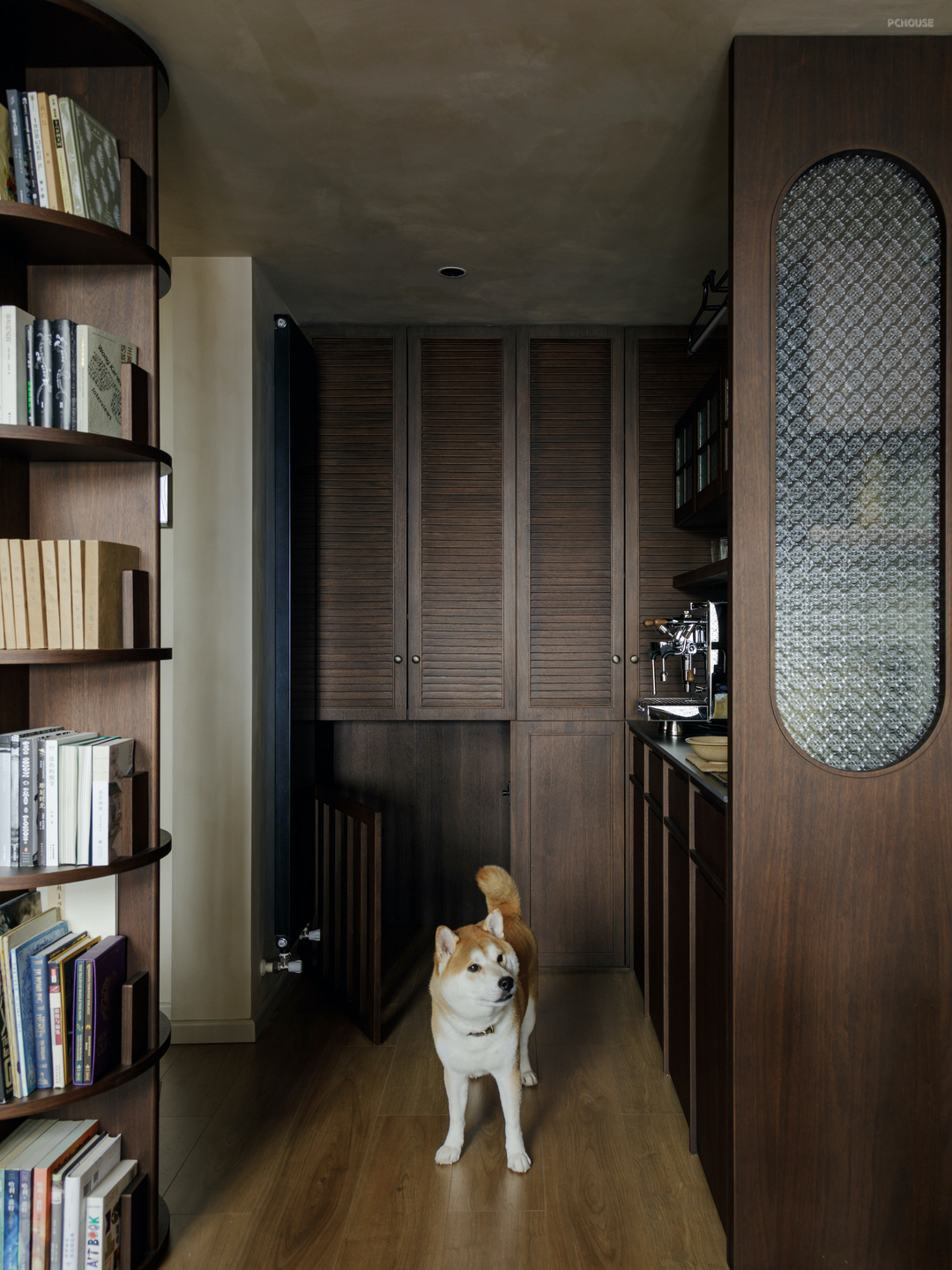 原楼梯拆除后,我们将这个正对餐厅的位置打造为一个咖啡角加收纳区. 业主的爱犬也在这里找到了它的安乐窝,紧邻入户门更方便主人遛狗.