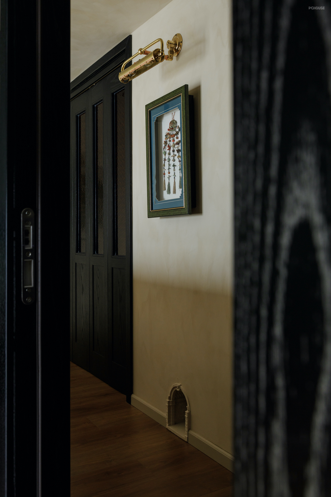 与玄关相邻的楼梯下方,根据屋主珍藏的乐高尺寸定制了一扇海棠花玻璃展示柜,仿佛为摆件们也装上了滤镜.