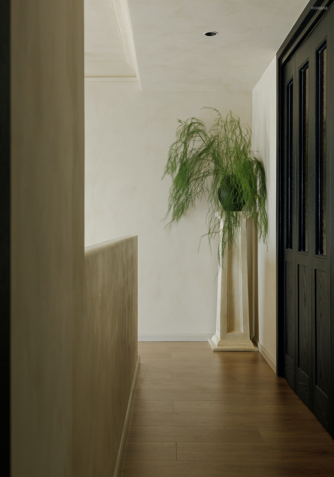二楼的半墙走廊依次通向卧室、衣帽间、书房和主卫.