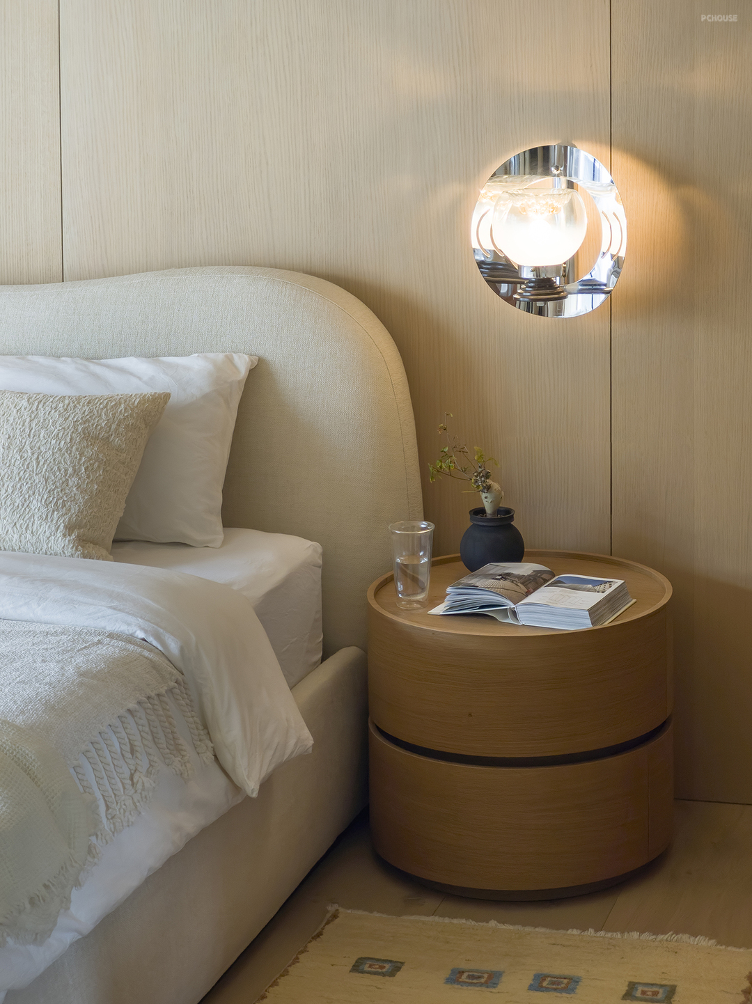拾阶而上,进入宁静的卧室空间。原木与布艺的融合,铺陈出更为温柔、静谧的氛围。设计师为业主两人挑选木质铺陈卧室场景,二层为儿童房、儿童活动区与客房,为业主的两只猫咪特别定制的猫爬架也安设在这一层,宠物的习性被体贴照顾,猫咪可以自由地上下活动,透过眼孔窥探外面世界。