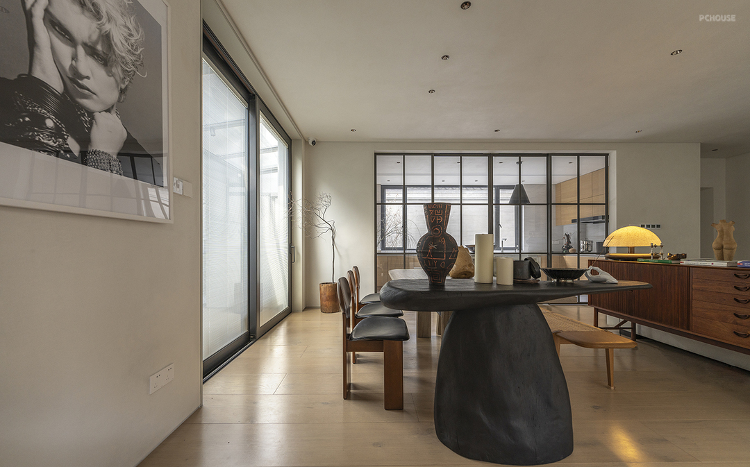 厨房旁将顶面打开,让光线可以深入纵深的室内空间,开辟一处温室来安置业主心爱的植物,象足漆树、狂刺夕映龙舌兰、索马里细叶橄榄、坦桑尼亚绿翡翠...以及来自日本的花器,都有了温暖适宜的空间。