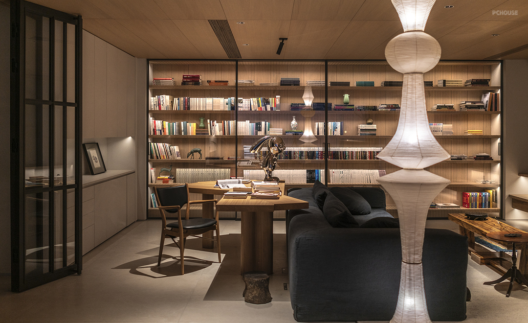 设计师将与庭园相邻的另一处通透空间留给书房,推门即景,闭门即静,一扇移门连接室内外,内是书香四溢的天地,外是四季流转的园景。柜体将业主的藏书悉数展示、收纳,构成静谧又呼应业主阅读喜好的场景。