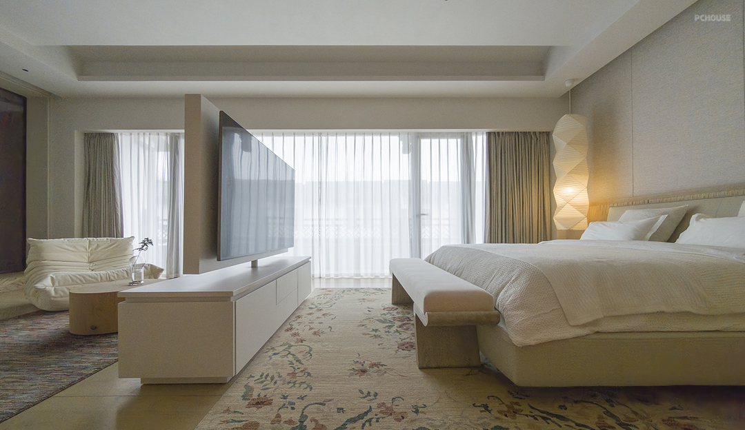 设计选择让简洁、舒适回归卧室的本质,在轻柔、舒缓的奶白色醒来,被米色的缱绻包裹,一体两面的电视柜则将休闲区与睡眠区分离,可旋转的设计让使用场景更加灵活,而背面休闲区的呼应,让起居之间有了一体两面的自由切换。
