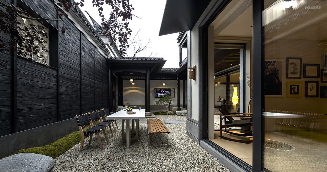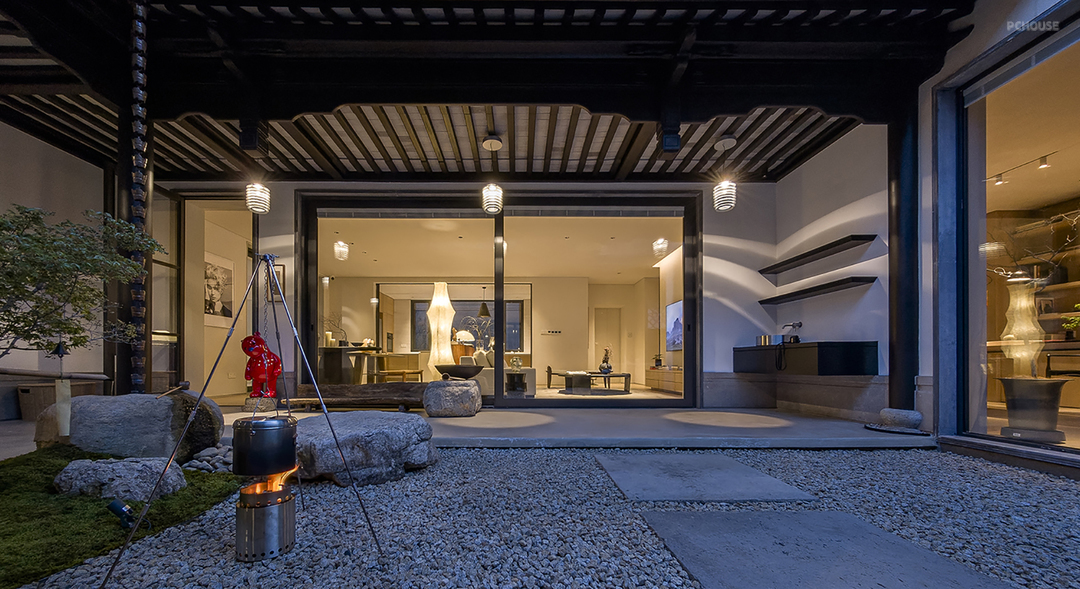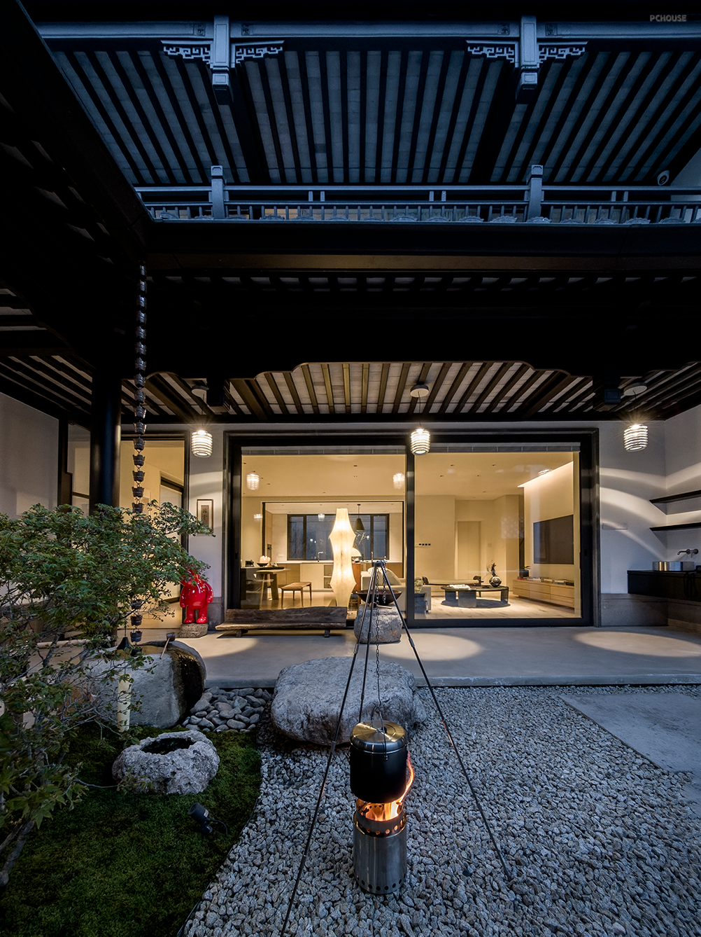在庭院中央,以露营与中式庭院融合的新思路,设置了篝火炉与户外家具配合,当夜幕降临,两三好友相聚,把酒言欢,烧烤作伴,在温馨围炉画面中人生岂不快哉。