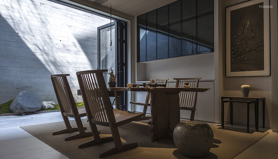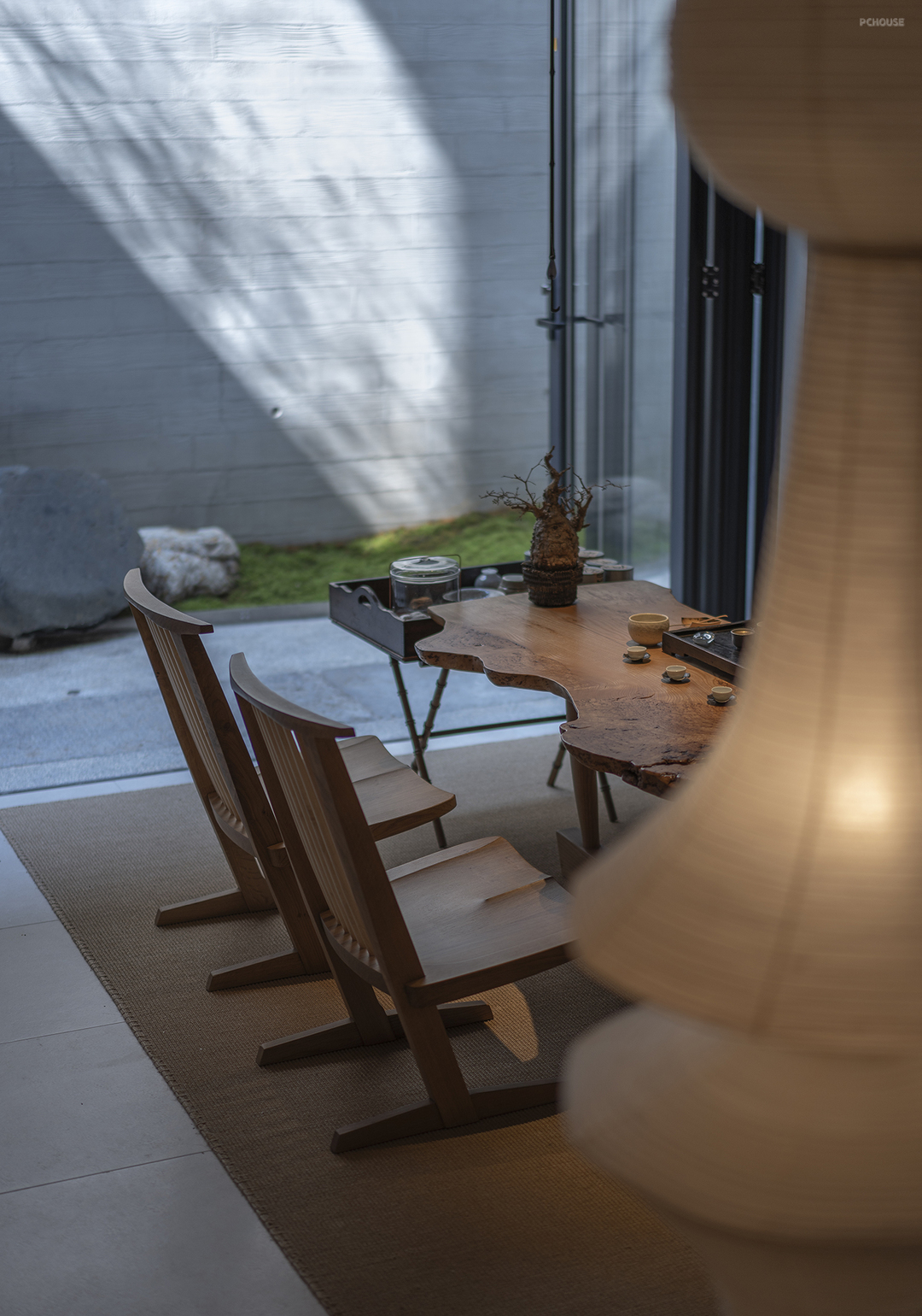 由项目本身的合院切入,将中式庭园之“游”,与日式庭园之“观”,相融在此。游赏与坐观两相宜,无关乎具体风格,而是从业主自身生活追求与状态中,风格自然生长。所抵之处,成为业主珍藏家具与器物的展示场,不论是购自日本的铜质雨链,还是搬石头时师傅的竹扁担改造成的添水,以所爱之物构筑出静心欣赏四季景致的栖息地,得以悠然赏青绿翠滴,苍苔落红的四季流转。